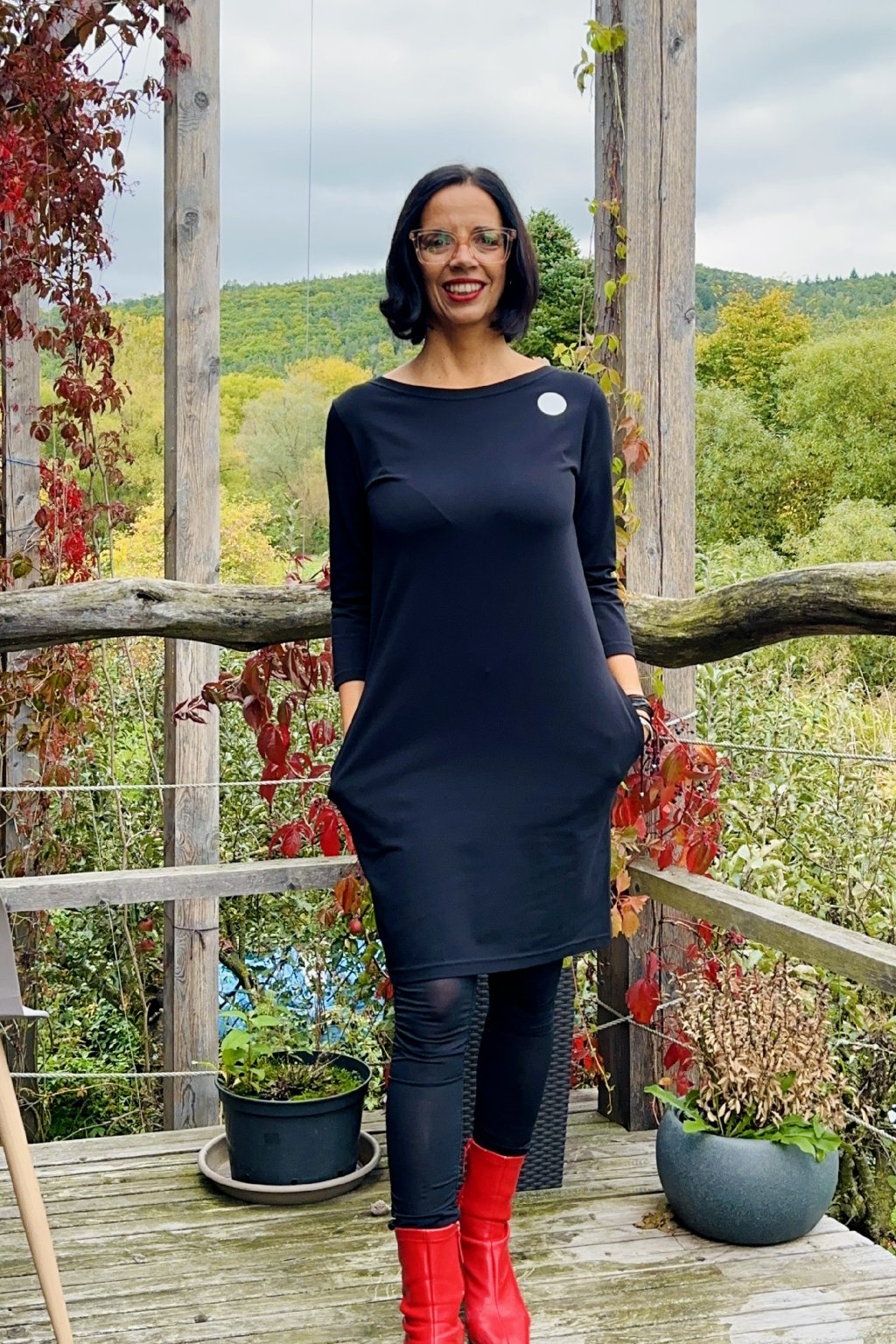 Šaty jsou rovného střihu, stejně široké v prsou a v bocích. Lodičkový výstřih. 3/4 rukáv. Boční kapsy.