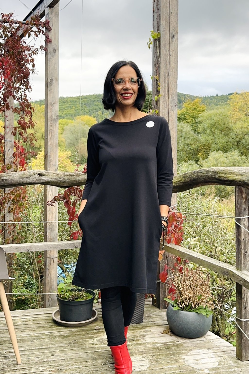 Černé úpletové šaty s lodičkovým výstřihem v mírné A siluetě, která zahalí jakékoliv nedostatky.