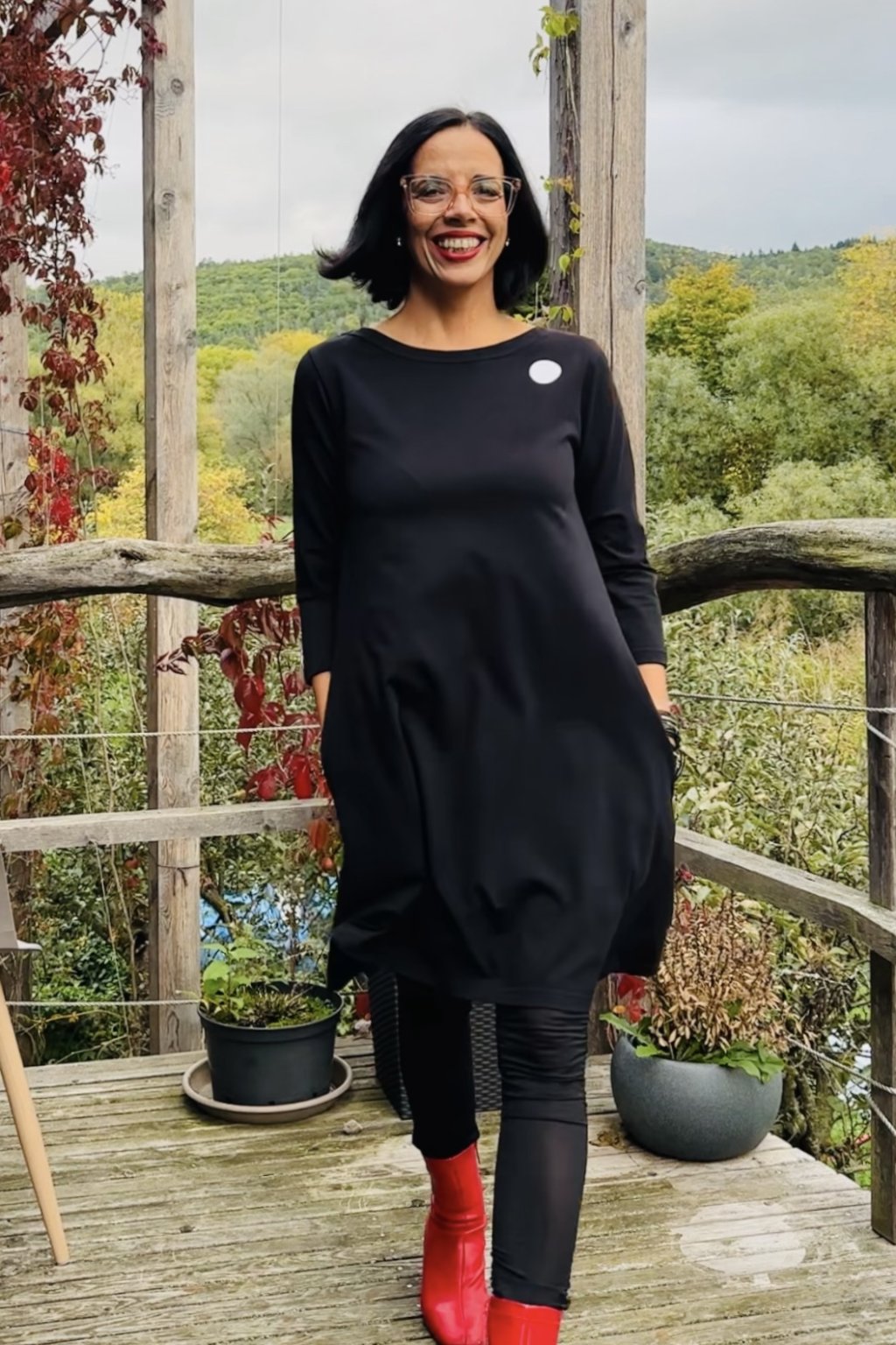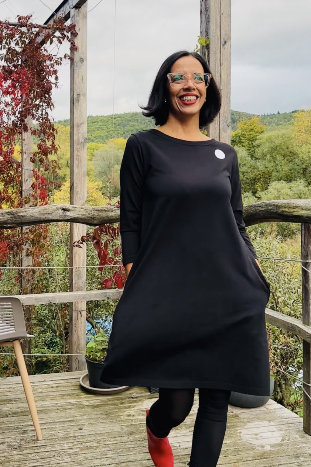 Černé úpletové šaty s lodičkovým výstřihem v oblíbené A siluetě, která zahalí jakékoliv nedostatky.