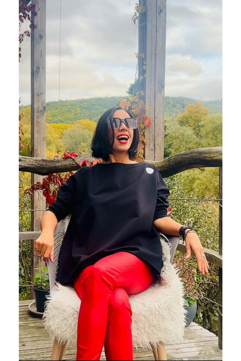 Mikina/Triko je velmi příjemná na nošení. Šijeme ji z elastické bavlněné teplákoviny. Volný střih mírně do áčka, v ramenou je mikina/triko široká a 3/4 rukáv je směrem k zápěstí zúžený a zakončený nápletem. Lodičkový výstřih.Spodní okraj nezačištěný. Délka 65cm.