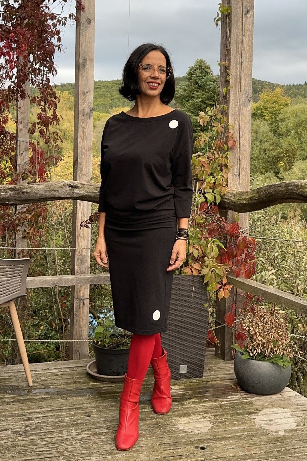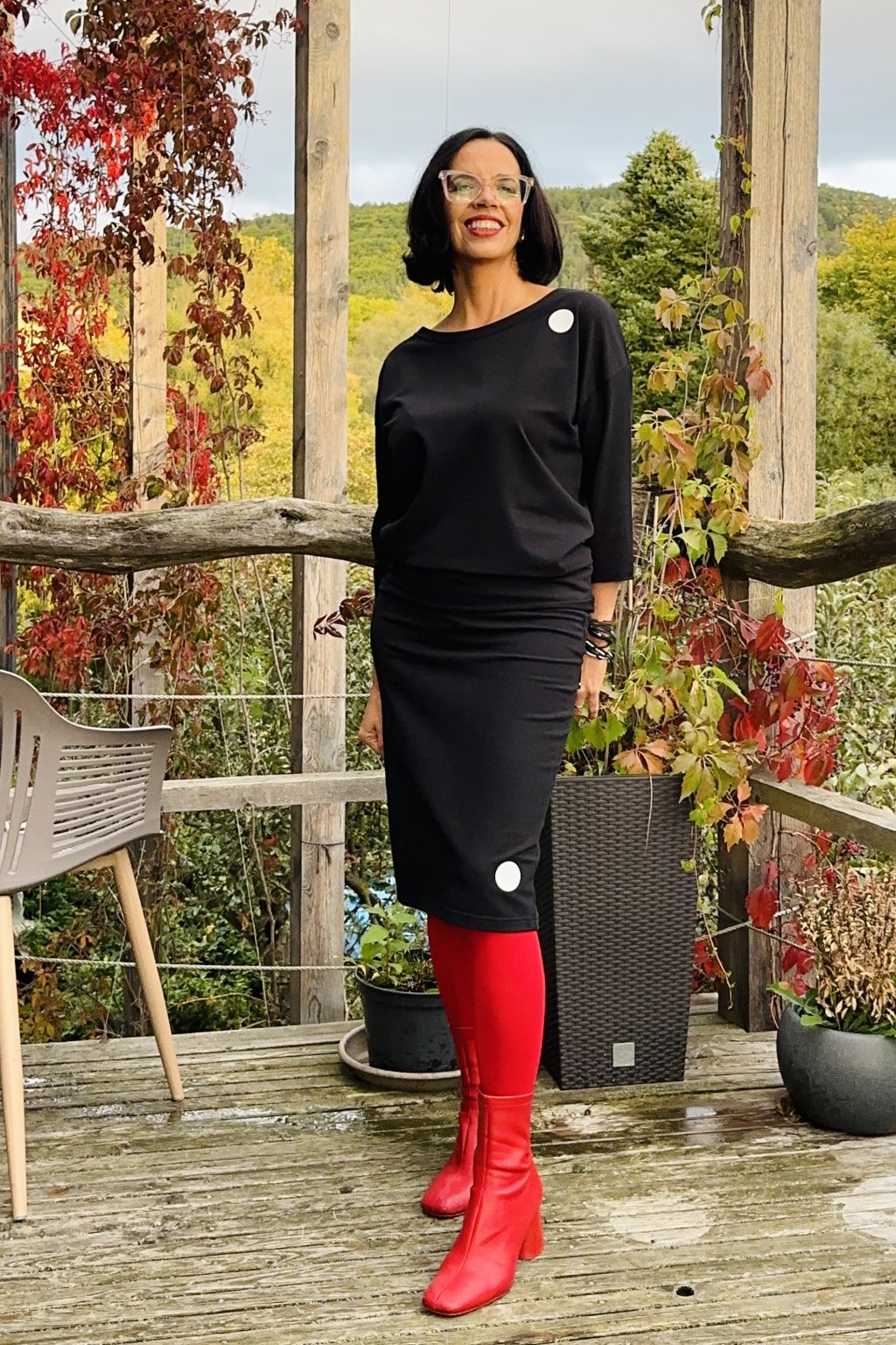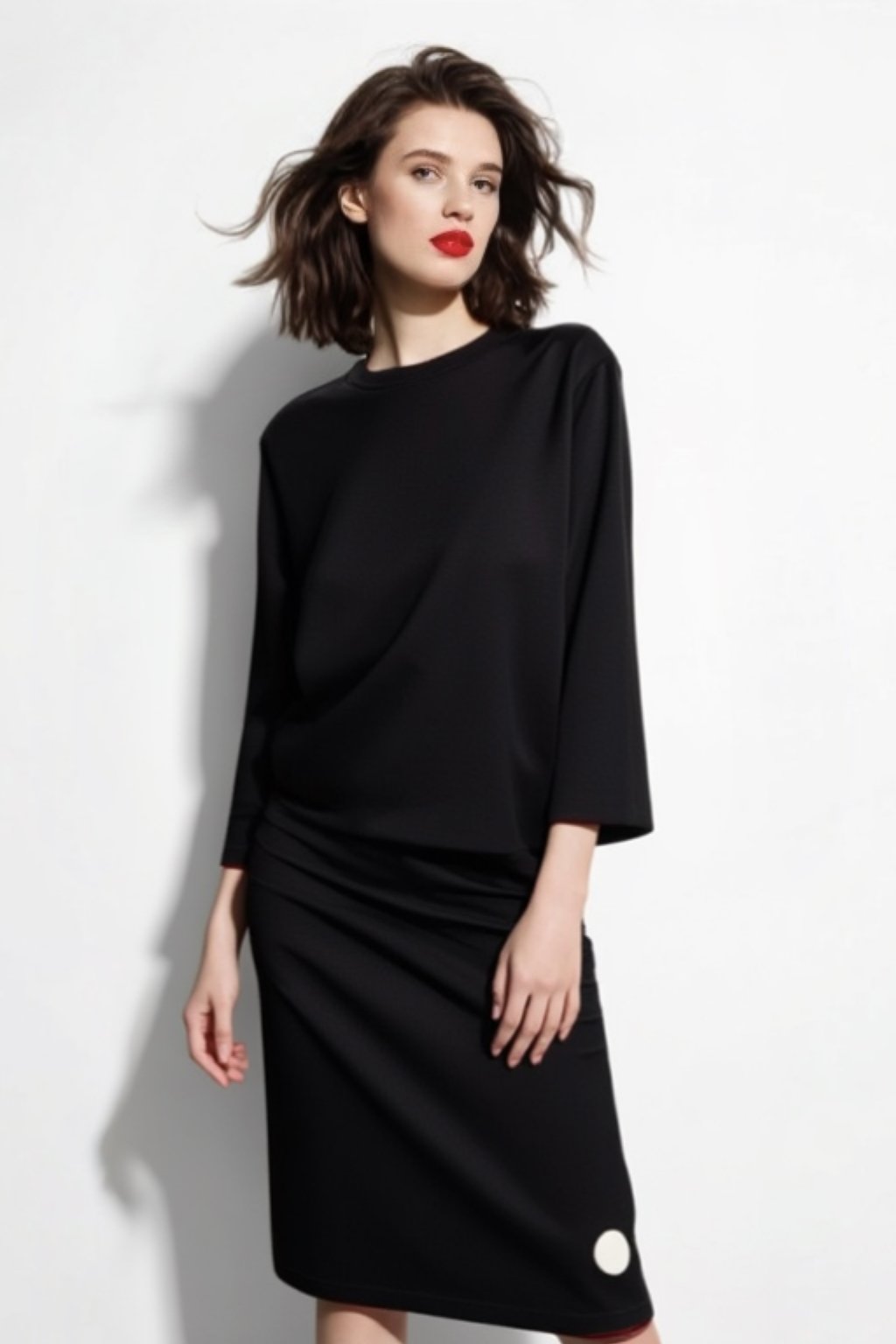 Černá úzká sukně s puntíkem z měkké teplákoviny, v délce po kolena. V pase je všitá guma pro maximální komfort při nošení. Minimalistický puntík dodává elegantní detail pro každý den.