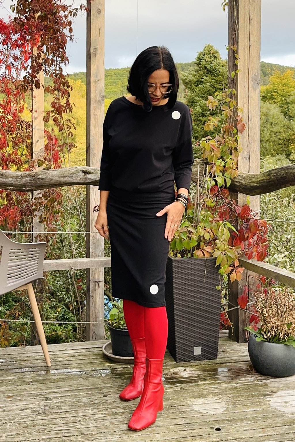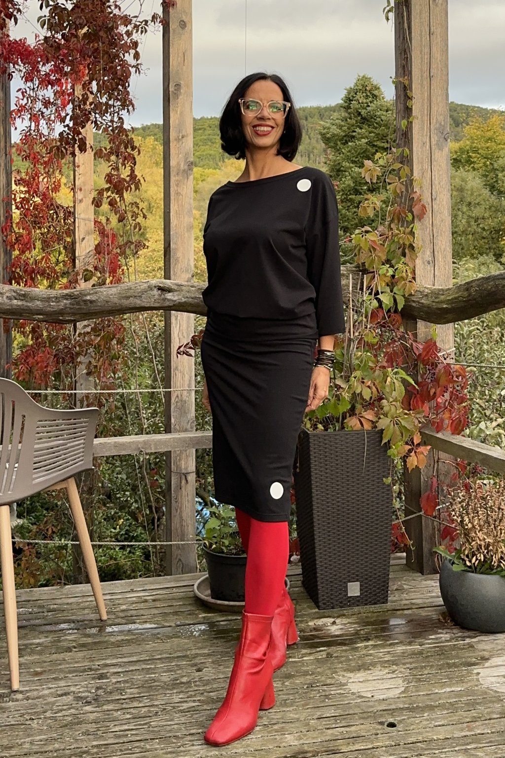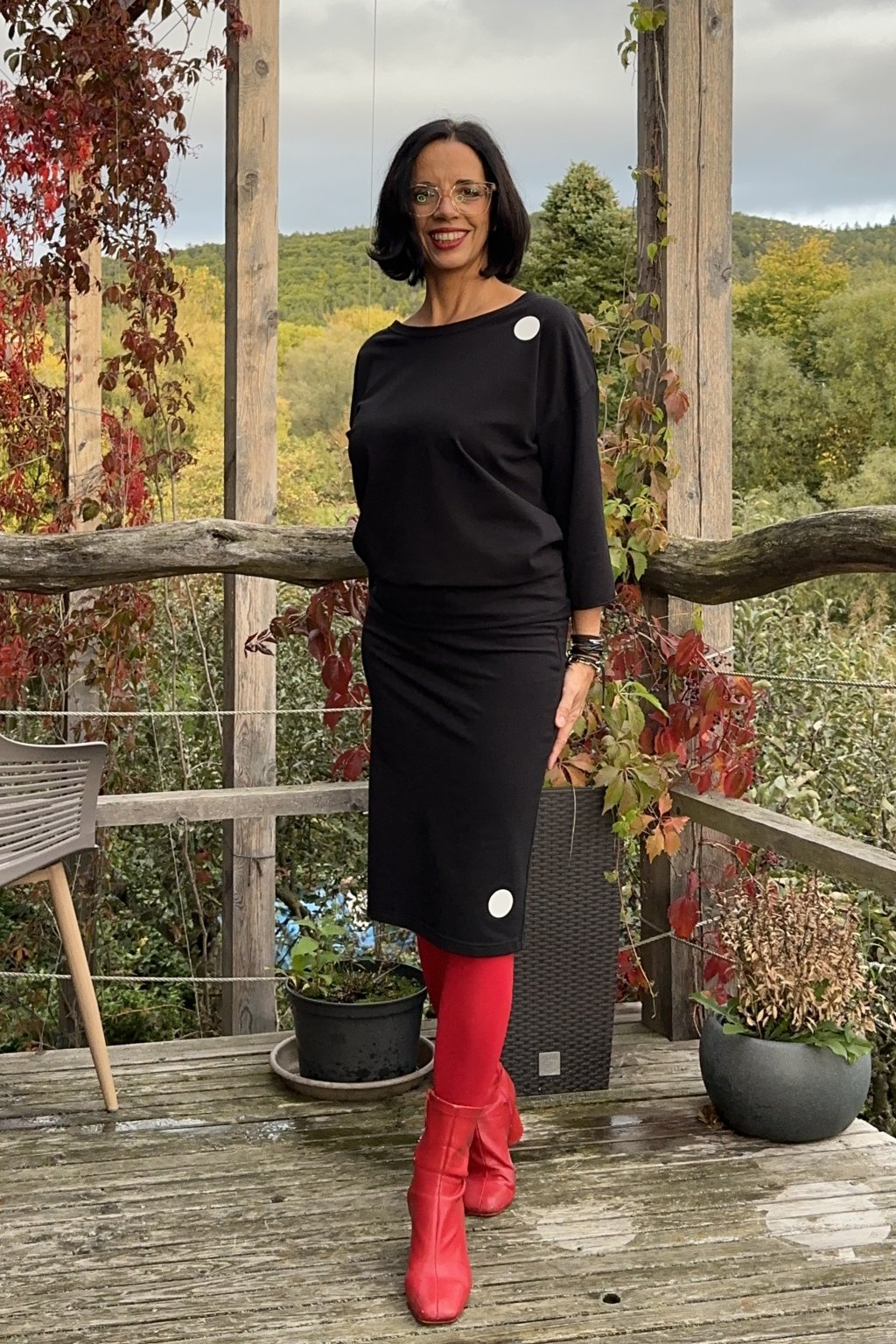 Černá úzká sukně s puntíkem z měkké teplákoviny, v délce po kolena. V pase je všitá guma pro maximální komfort při nošení. Minimalistický puntík dodává elegantní detail pro každý den.