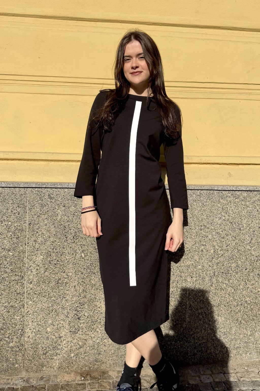 Šaty jsou rovného střihu, stejně široké v prsou a v bocích. Lodičkový výstřih. 3/4 všívaný rukáv. Boční kapsy.