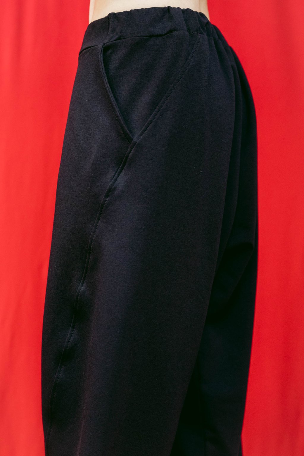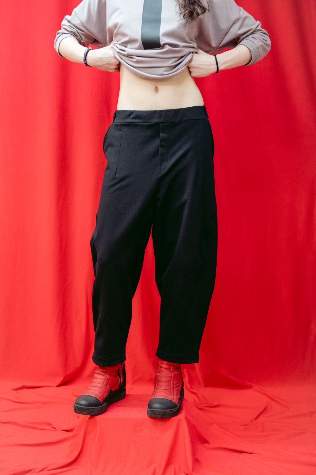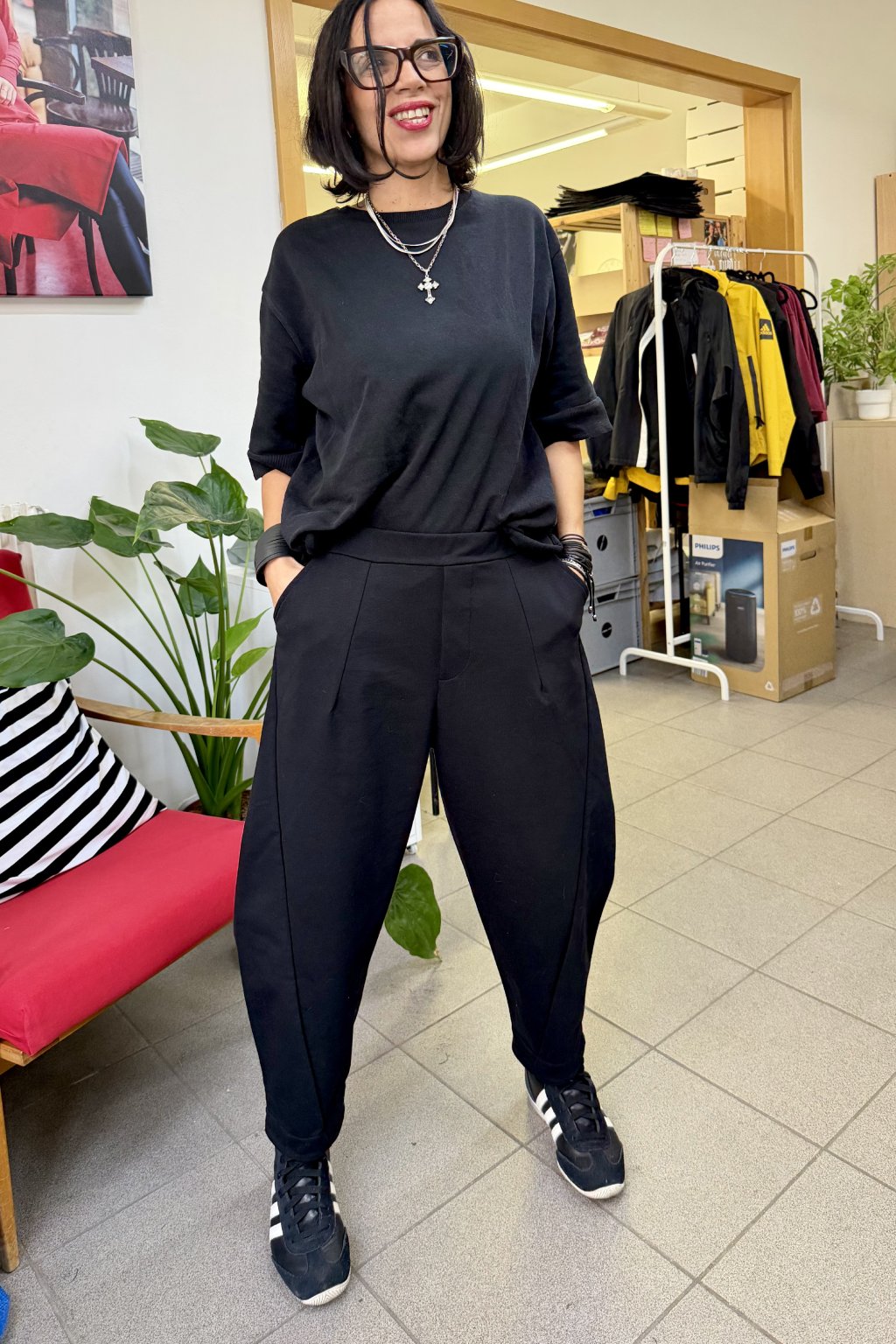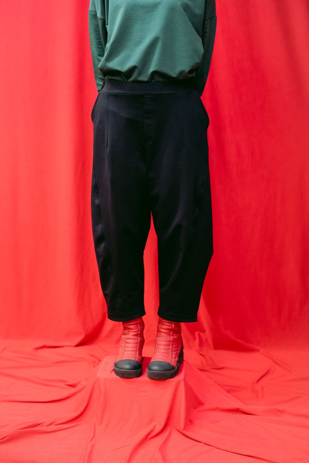 Střih kalhot je rafinovaný, soudkovitý, boční švy sahají ve spodní části dopředu a zespodu je manžeta.
