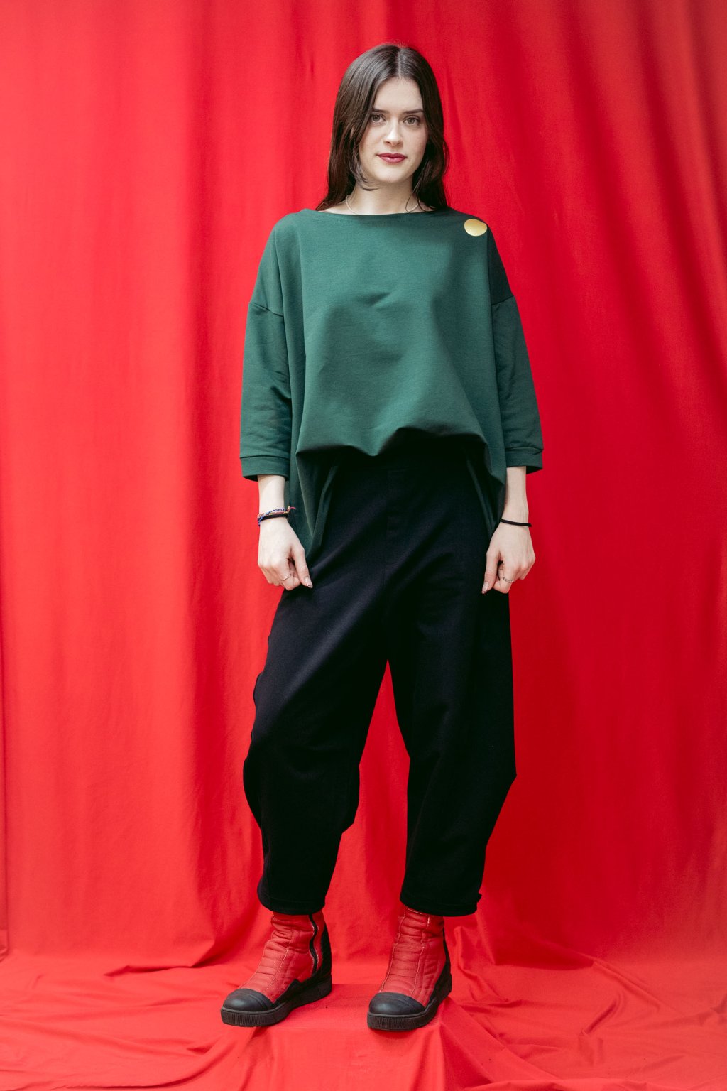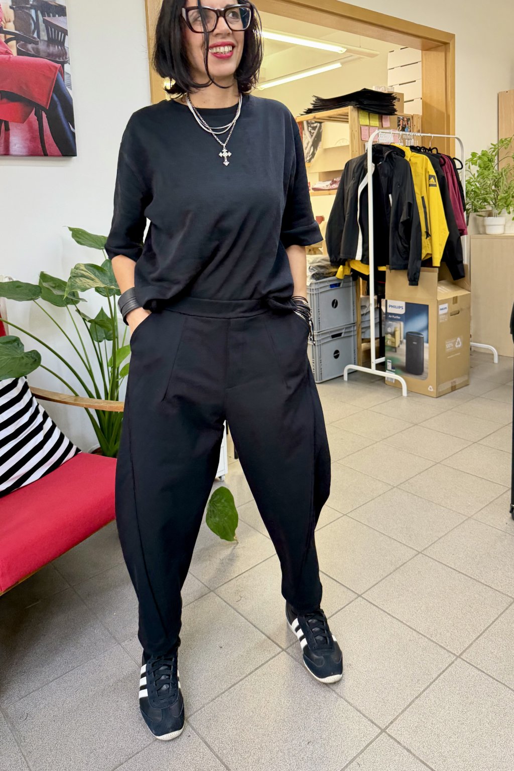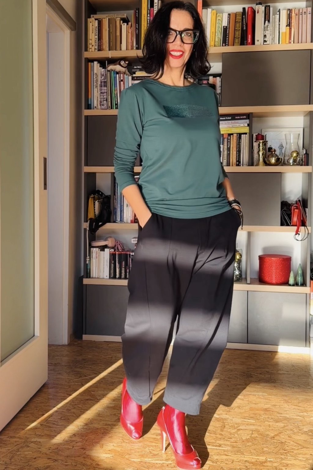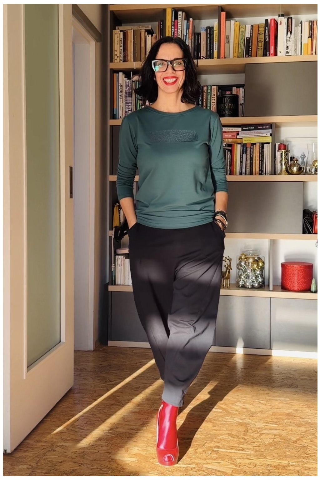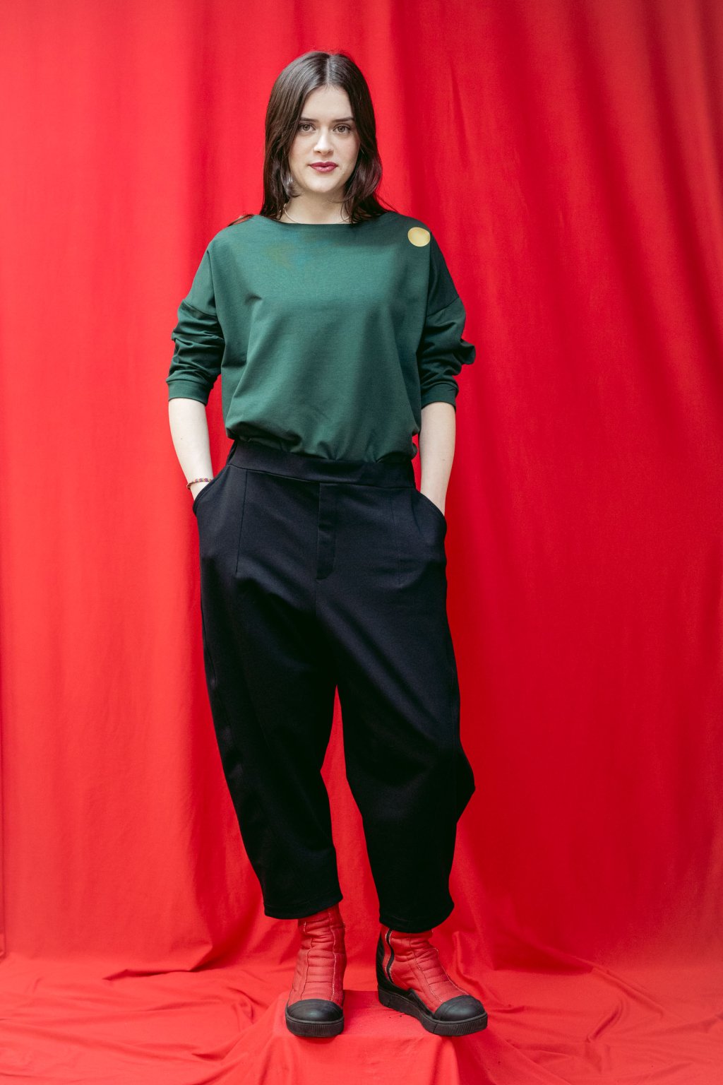 Střih kalhot je rafinovaný, soudkovitý, boční švy sahají ve spodní části dopředu a zespodu je manžeta.