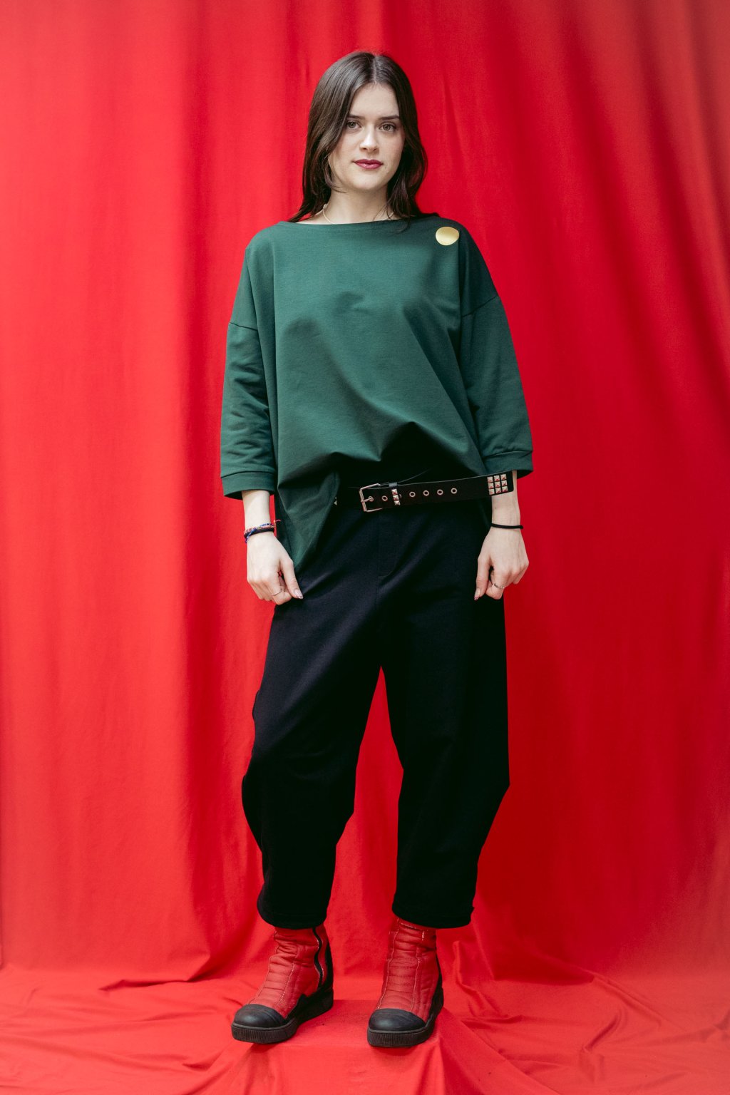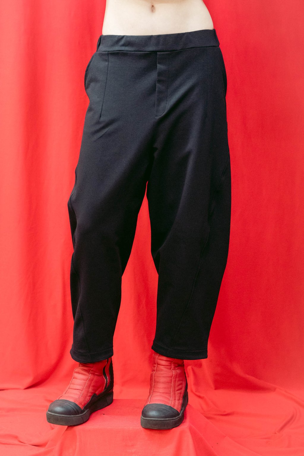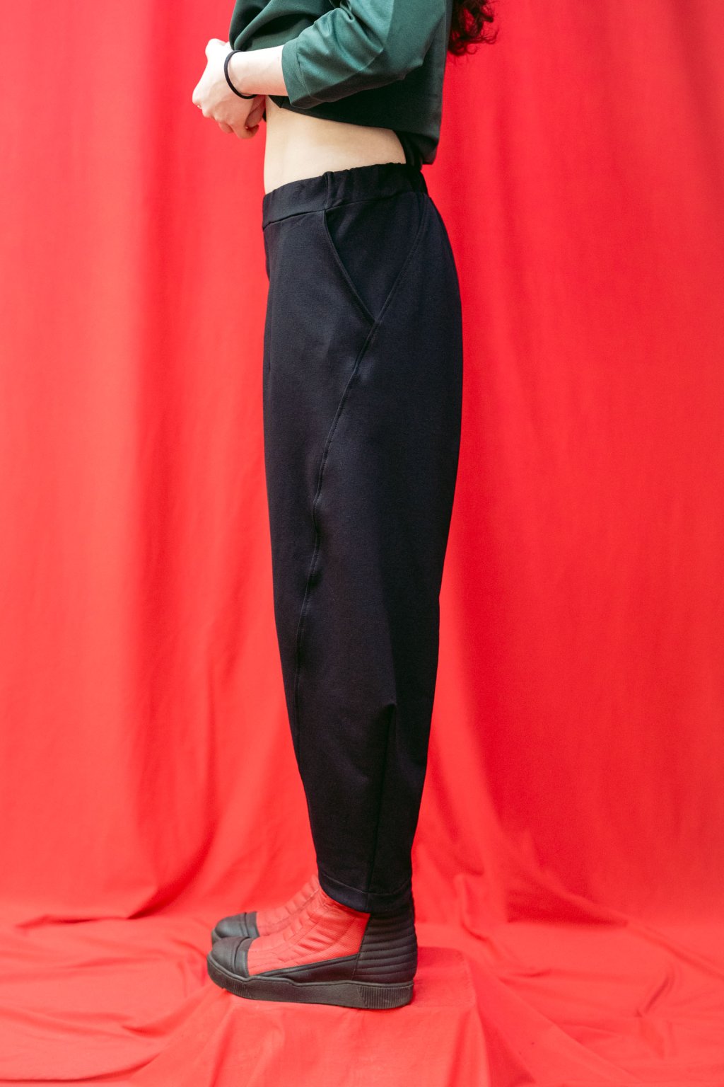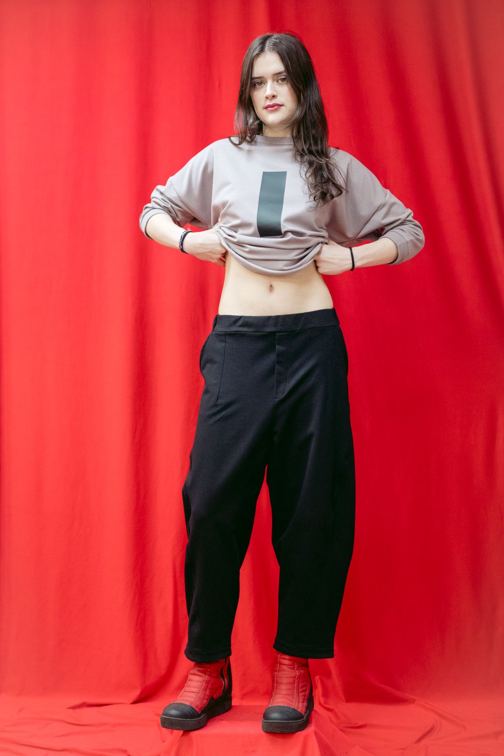 Střih kalhot je rafinovaný, soudkovitý, boční švy sahají ve spodní části dopředu a zespodu je manžeta.
