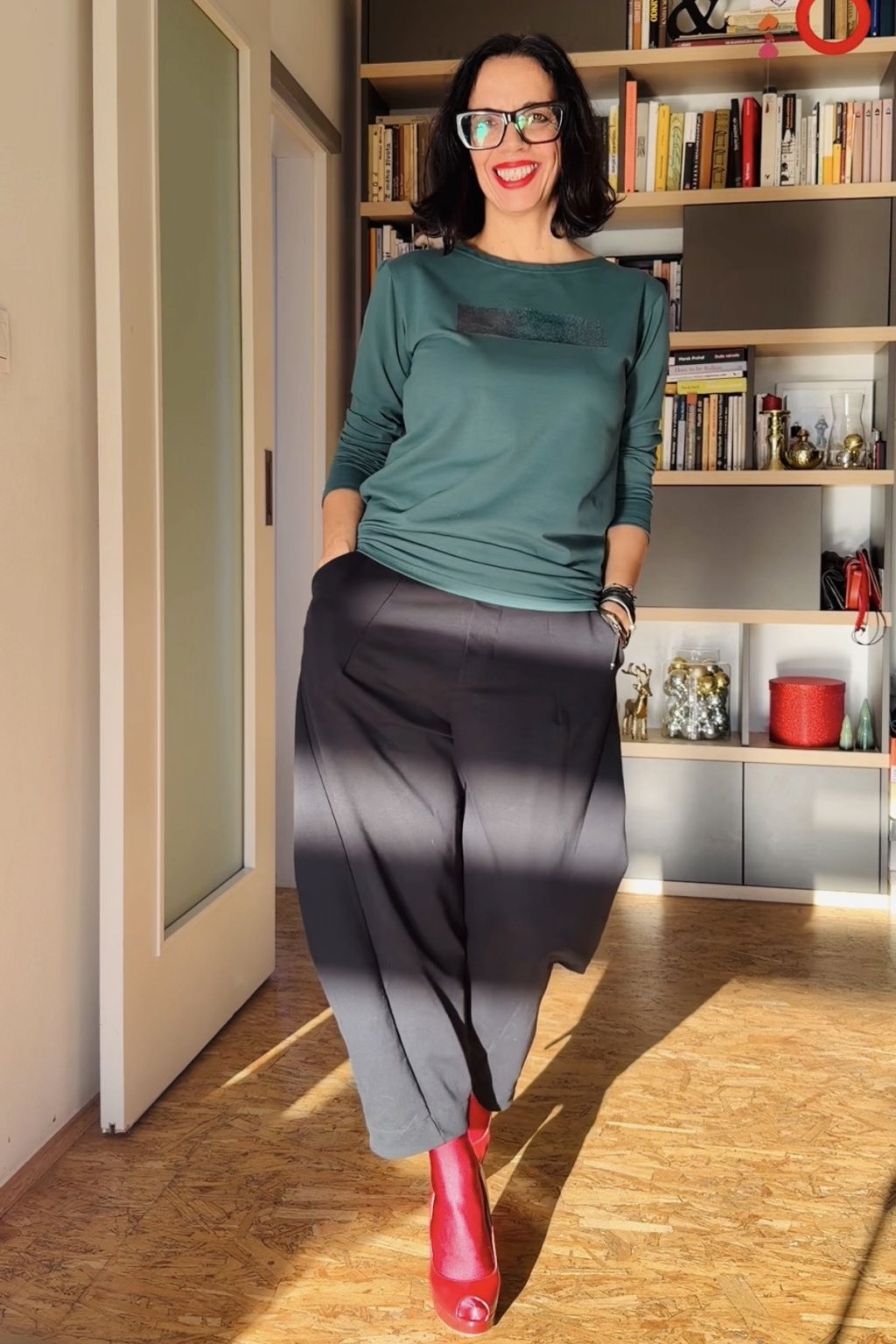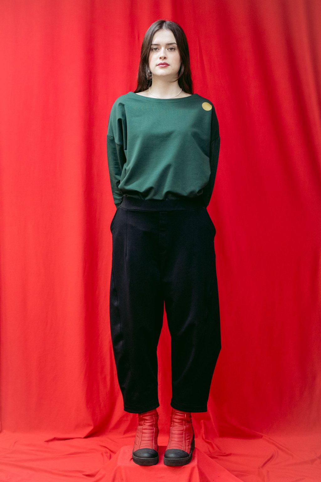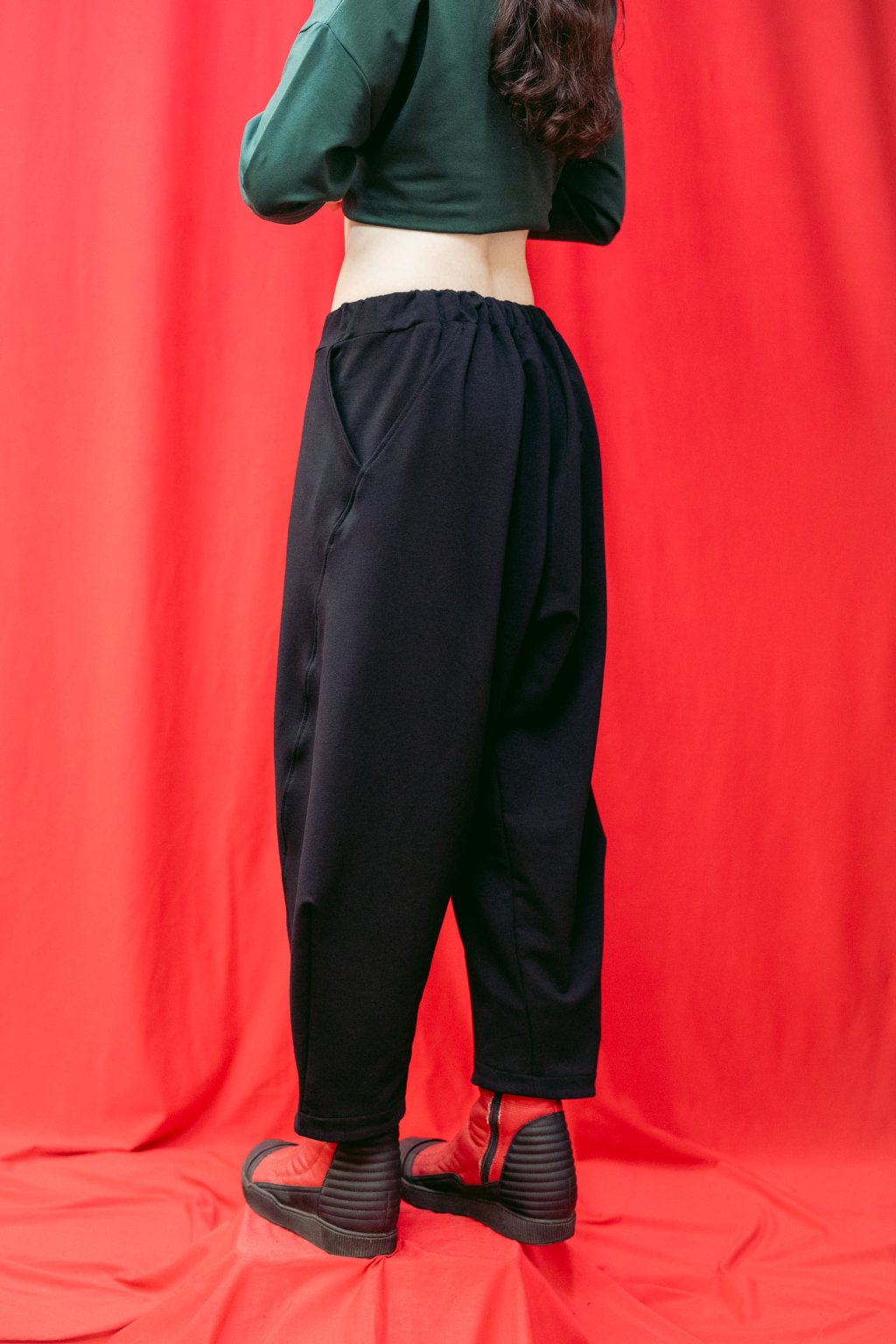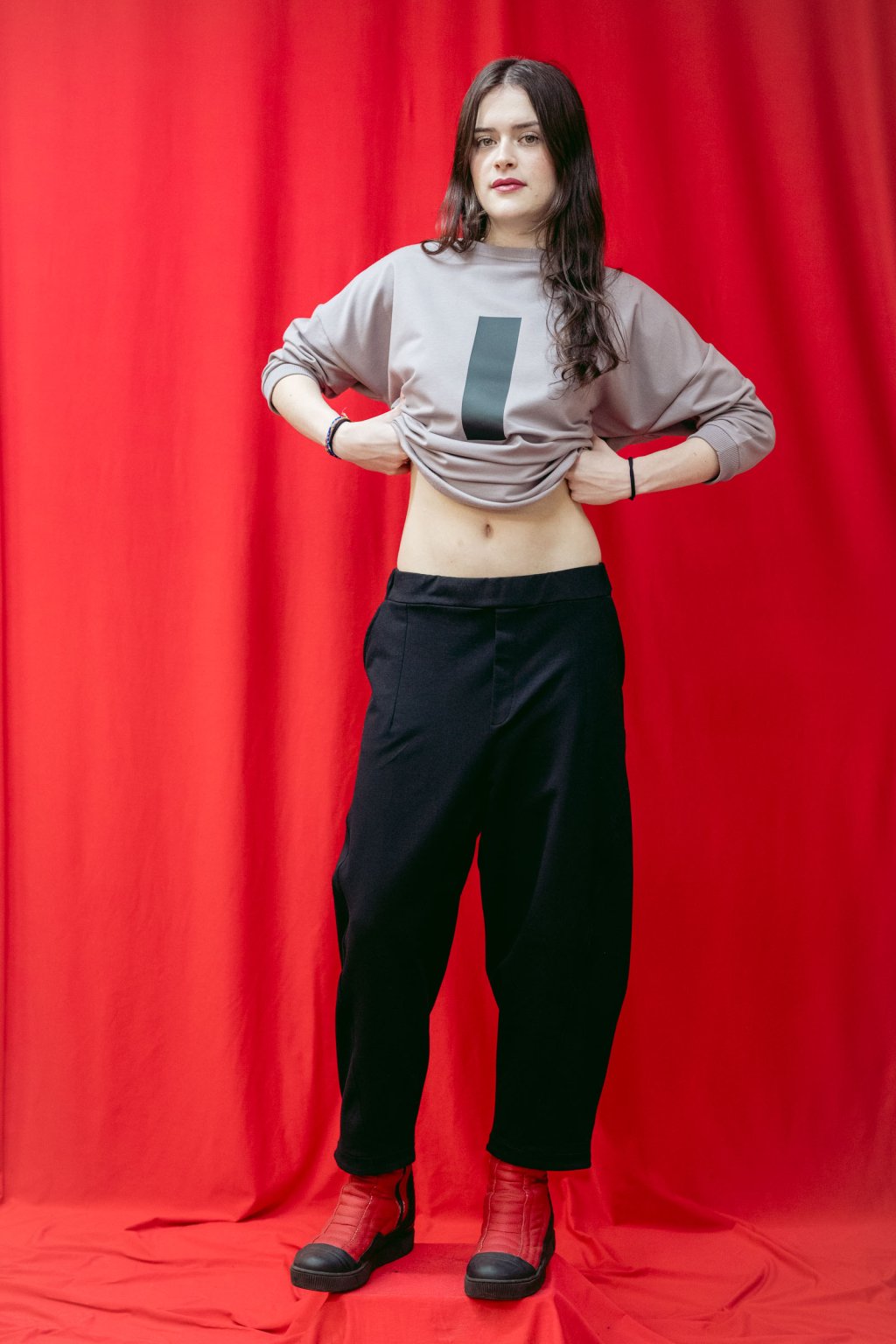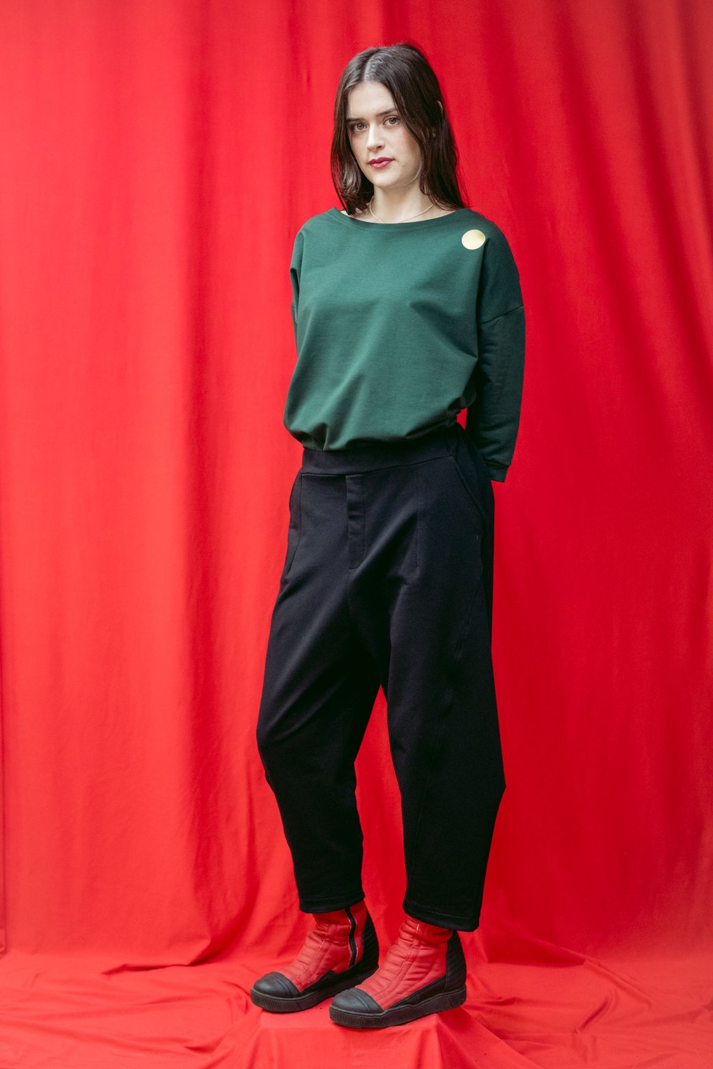 Střih kalhot je rafinovaný, soudkovitý, boční švy sahají ve spodní části dopředu a zespodu je manžeta.