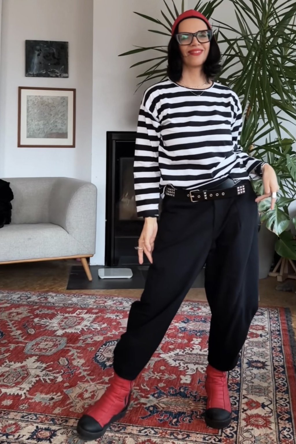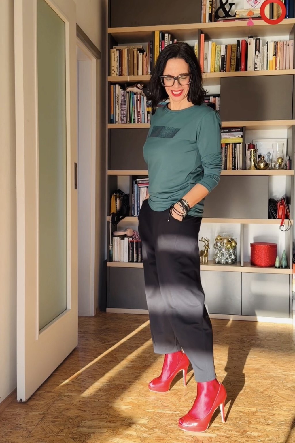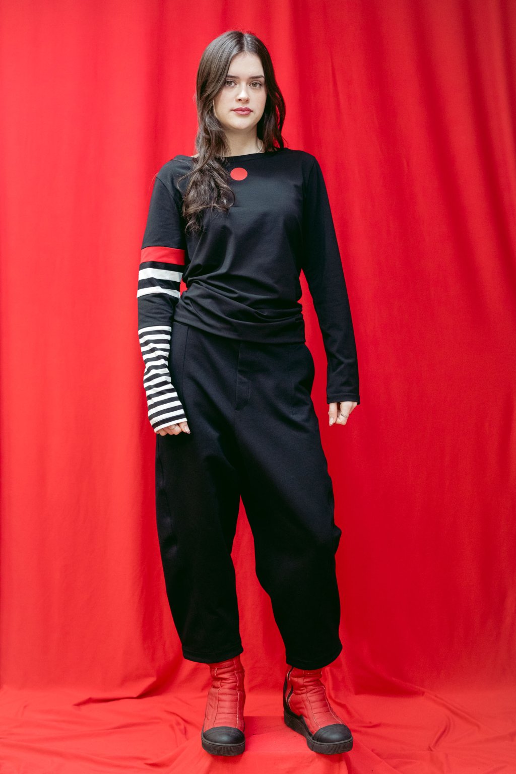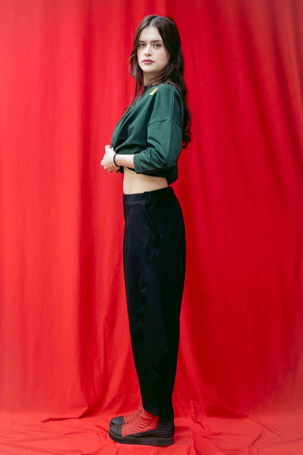 Střih kalhot je rafinovaný, soudkovitý, boční švy sahají ve spodní části dopředu a zespodu je manžeta.