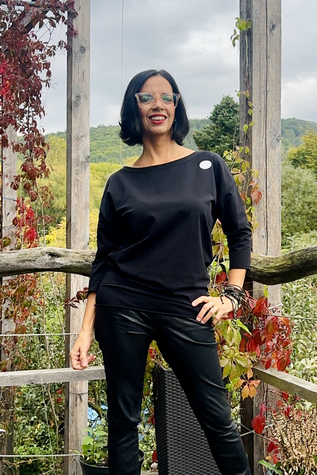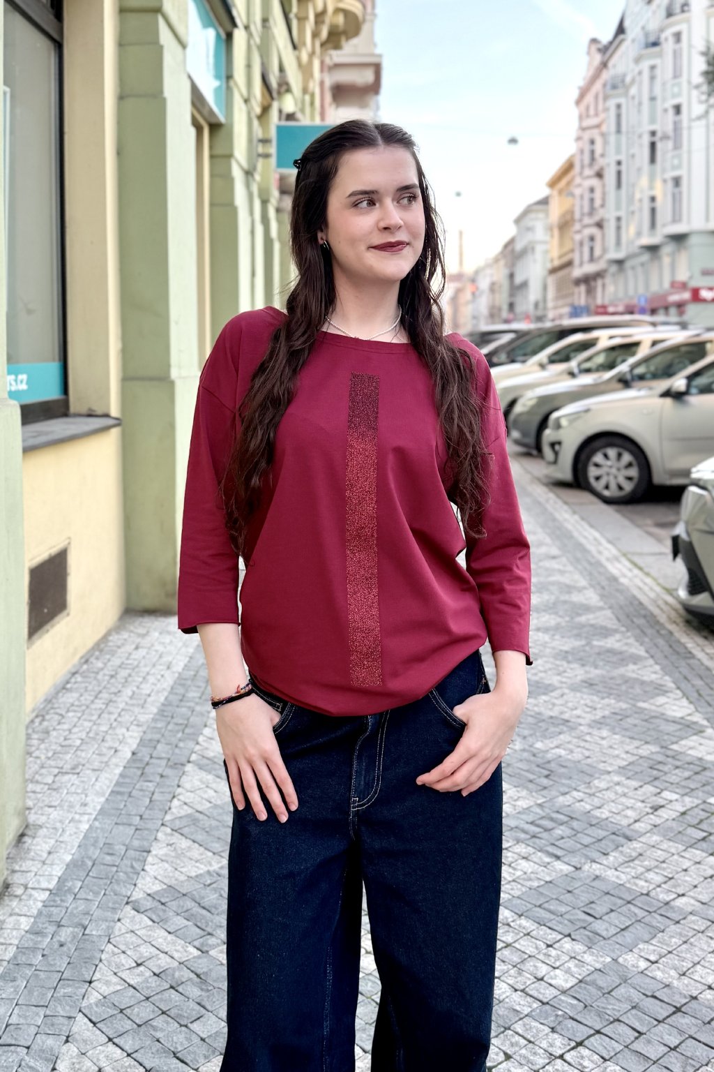 Pohodlné tričko, které Vás provede celým dnem. My ho nosíme s oblíbenou sukní, dobře bude vypadat i s džínami nebo plátěnými kalhotami. Glitter pruh dodává tričku slávnostnější ráz, ale proč neslavit každy den?