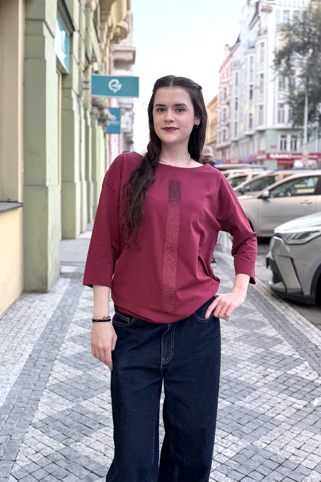 Tričko je netopýřího střihu, v ramenou široké, v bocích zúžené, úzký 3/4 rukáv, okraje nezačištěné. Lodičkový výstřih.
