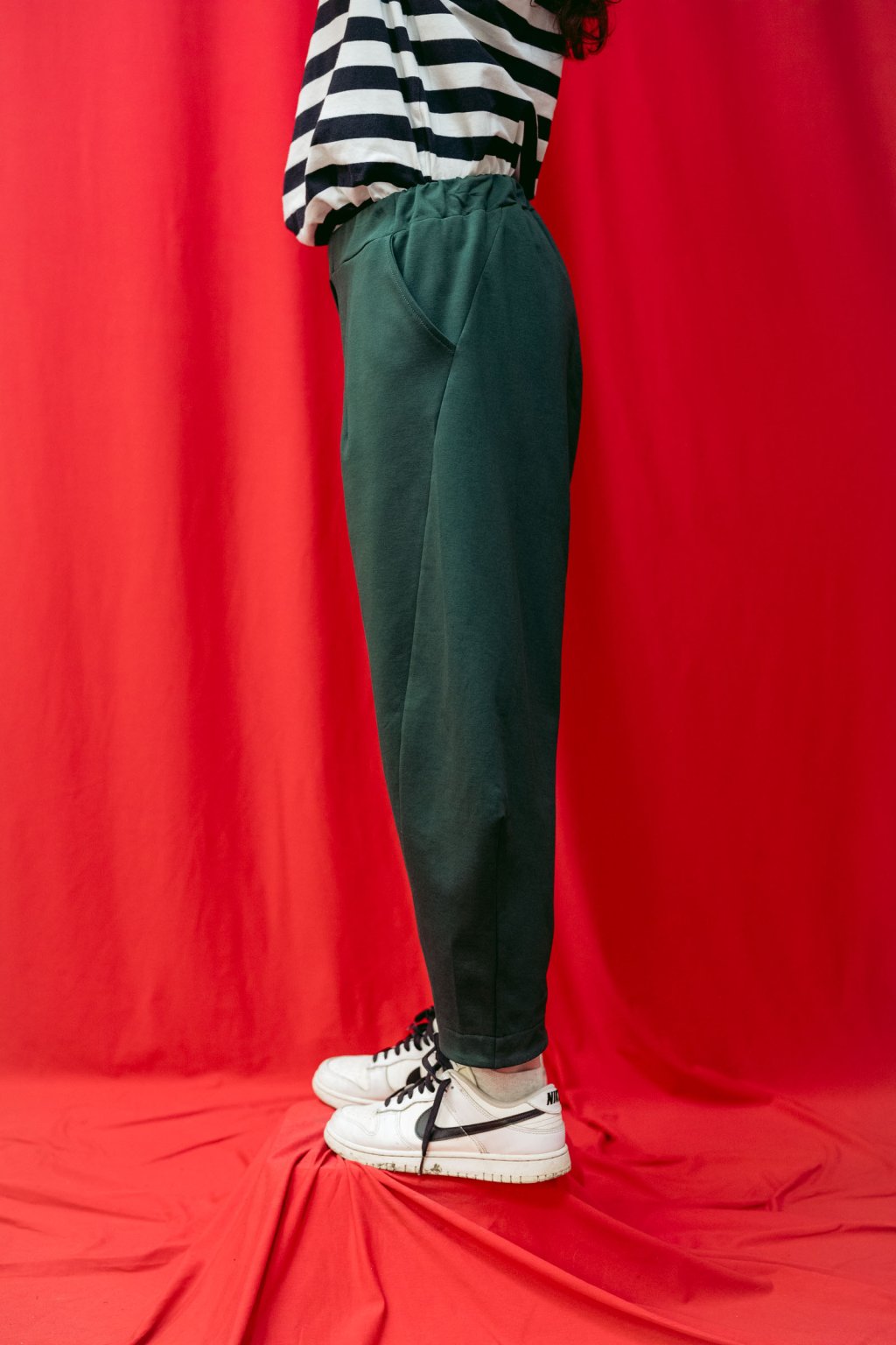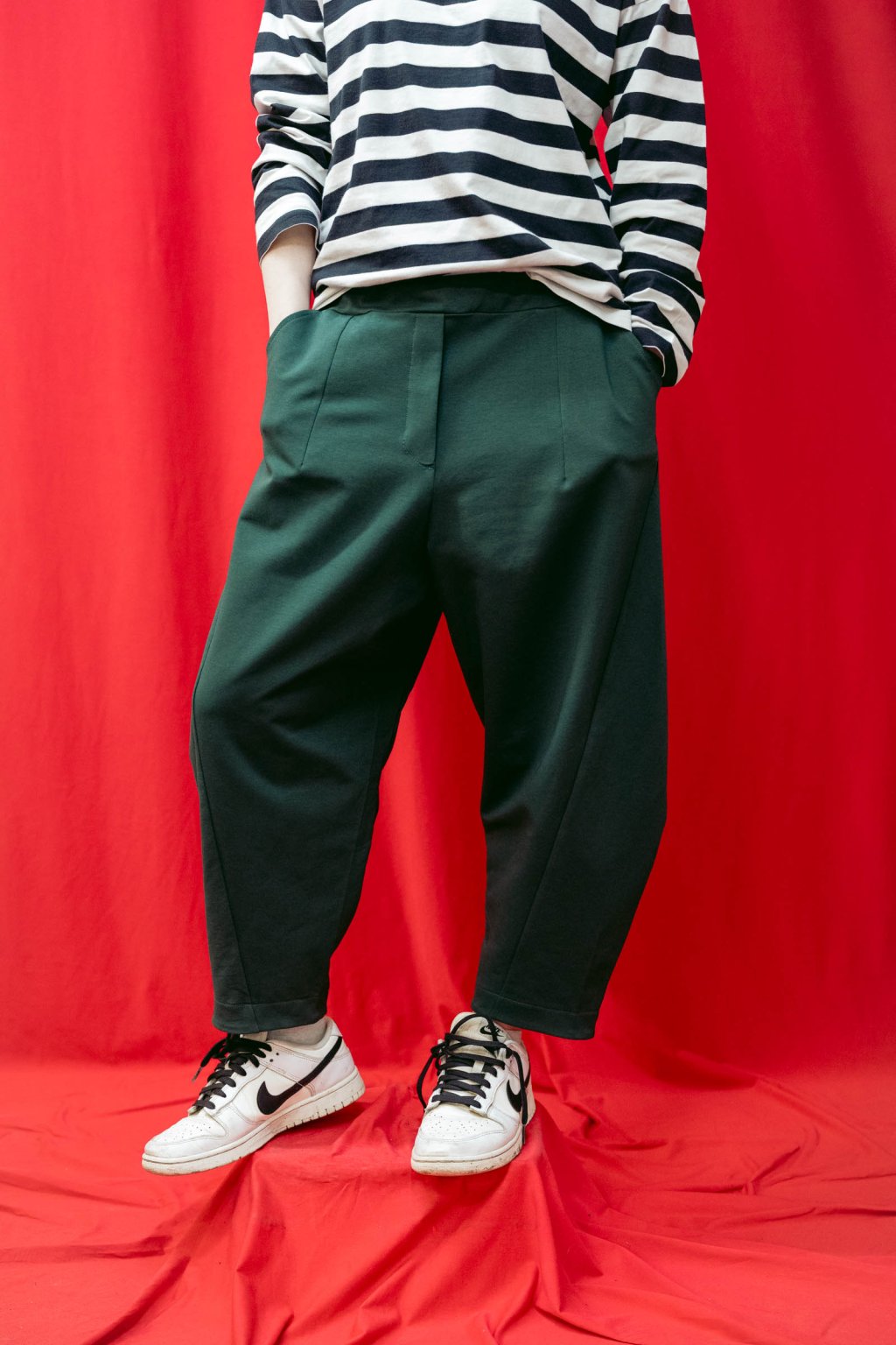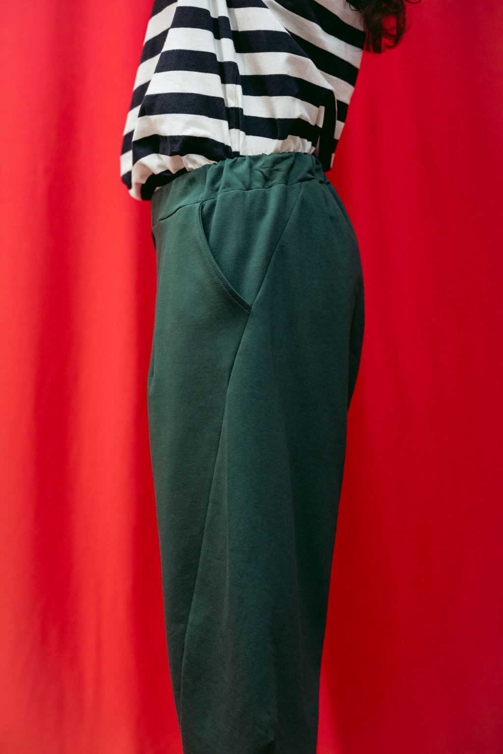 Střih kalhot je rafinovaný, soudkovitý, boční švy sahají ve spodní části dopředu a zespodu je manžeta.