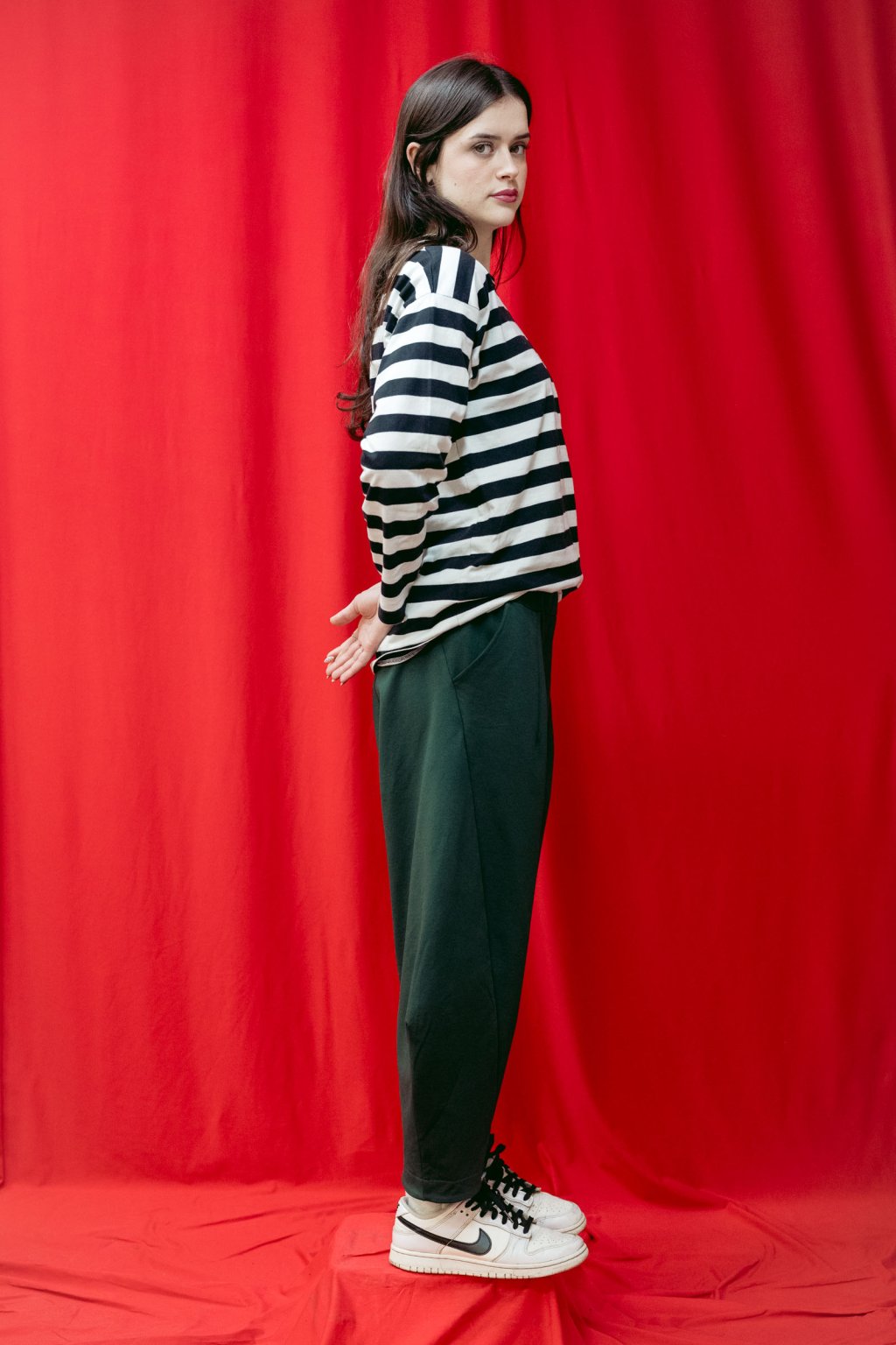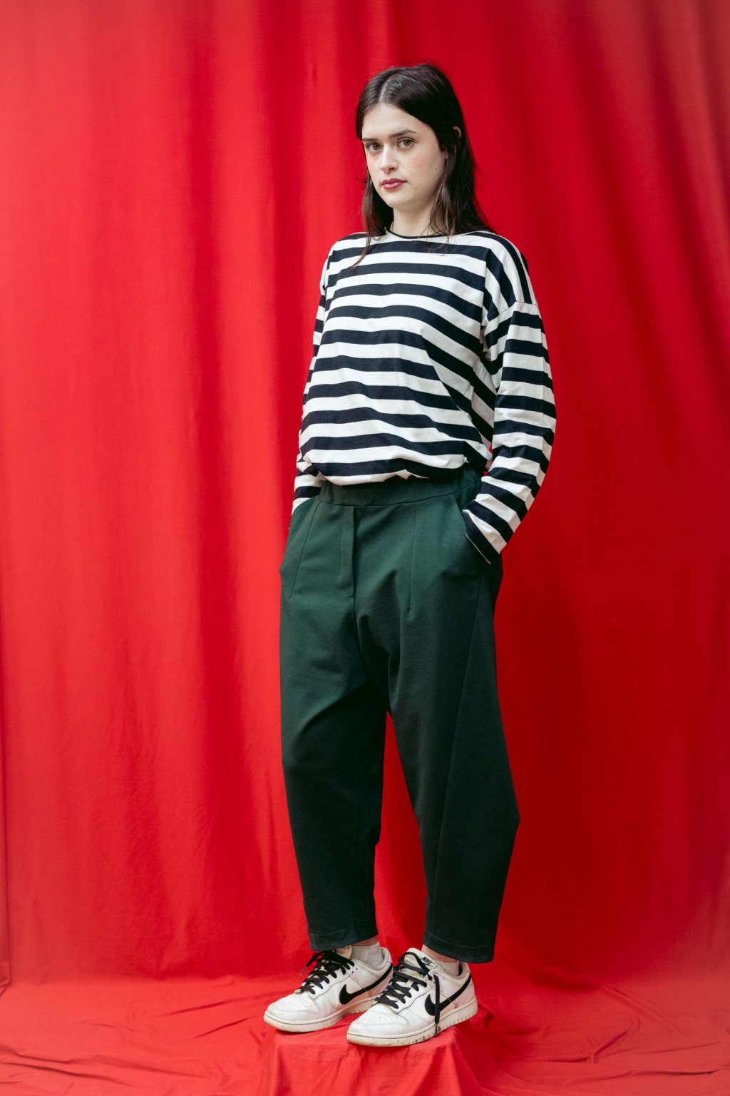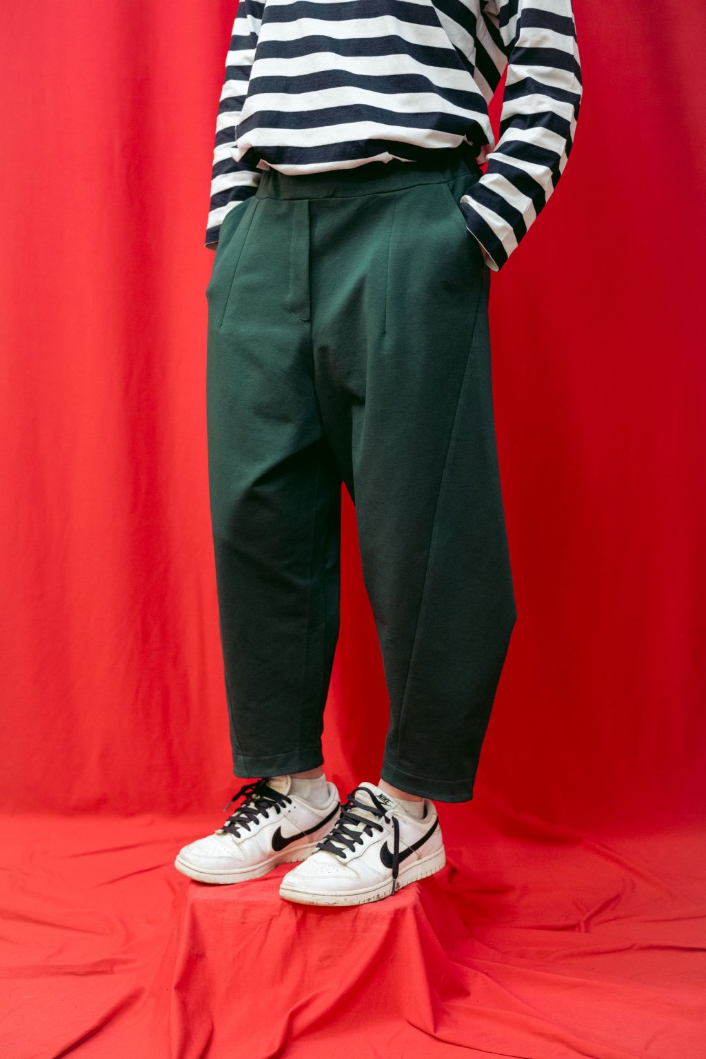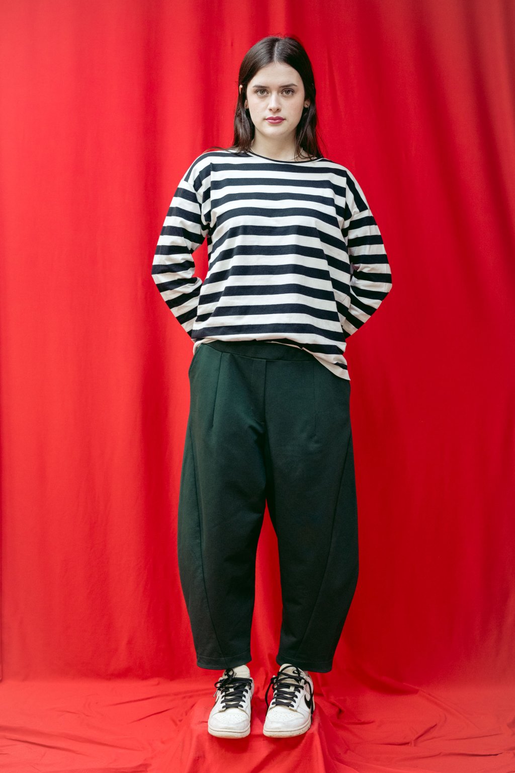 Střih kalhot je rafinovaný, soudkovitý, boční švy sahají ve spodní části dopředu a zespodu je manžeta.