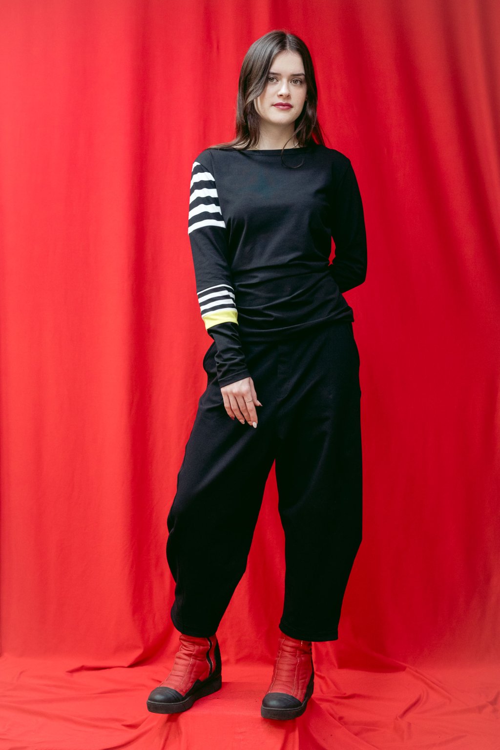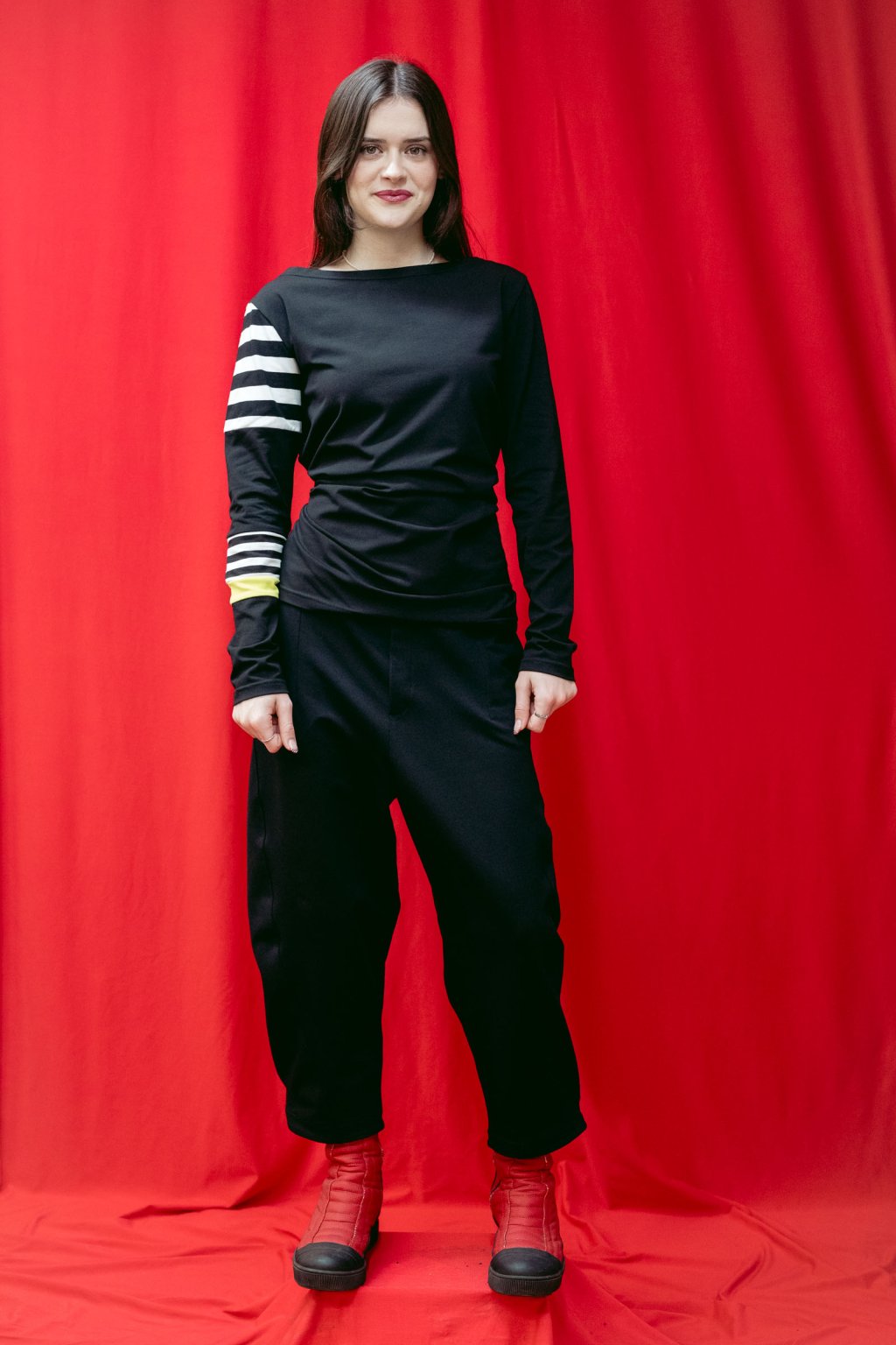 Triko je úzké, v bocích víc zúžené, dlouhý rukáv. Lodičkový výstřih.