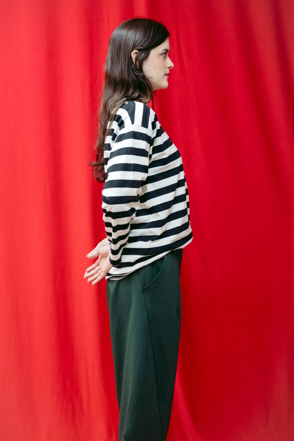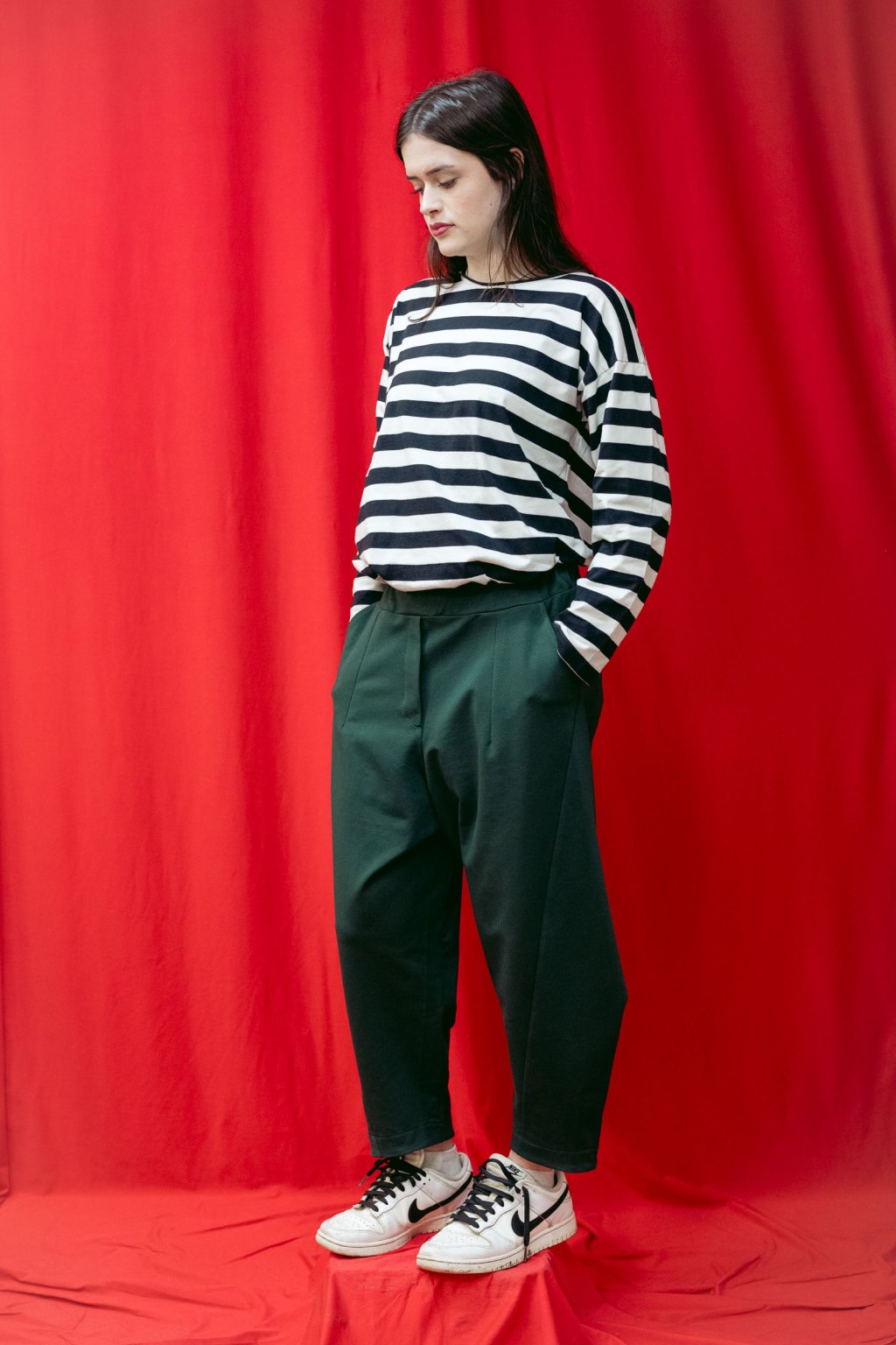 Triko šijeme z bavlněného elastického úpletu. Basic střih je mírně upraven do oversized, v ramenou je triko široké a rukávy jsou směrem k zápěstí trochu zúžené. Kulatý výstřih je zakončený jednoduchým lemem. Rukávy a spodek je začištěn.