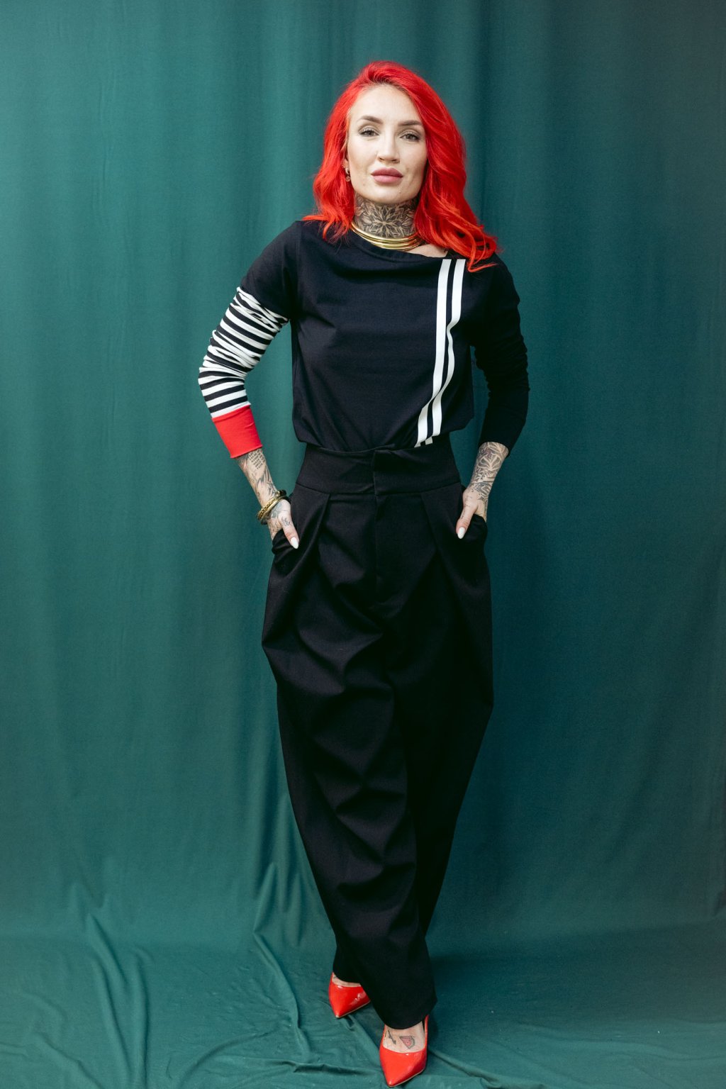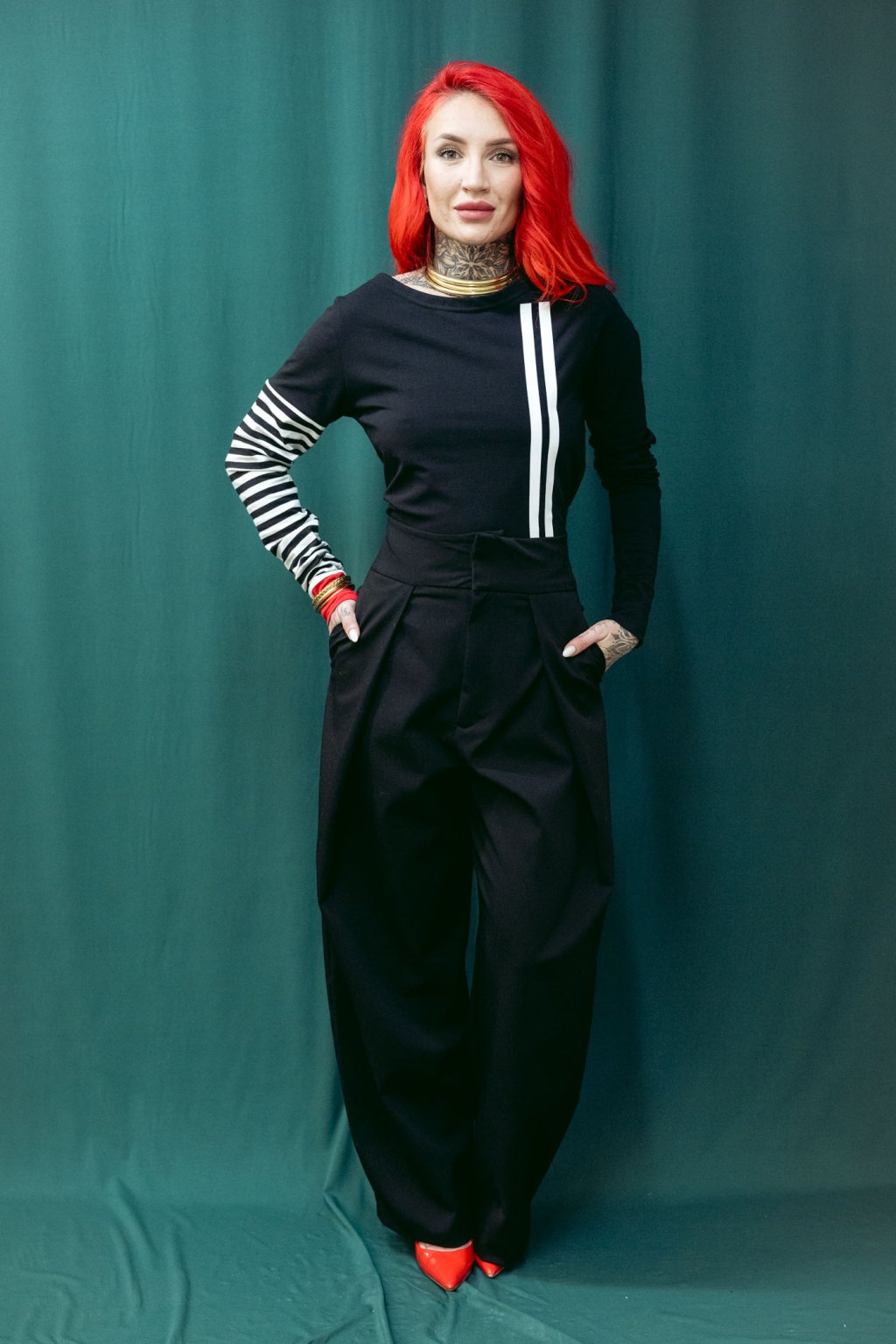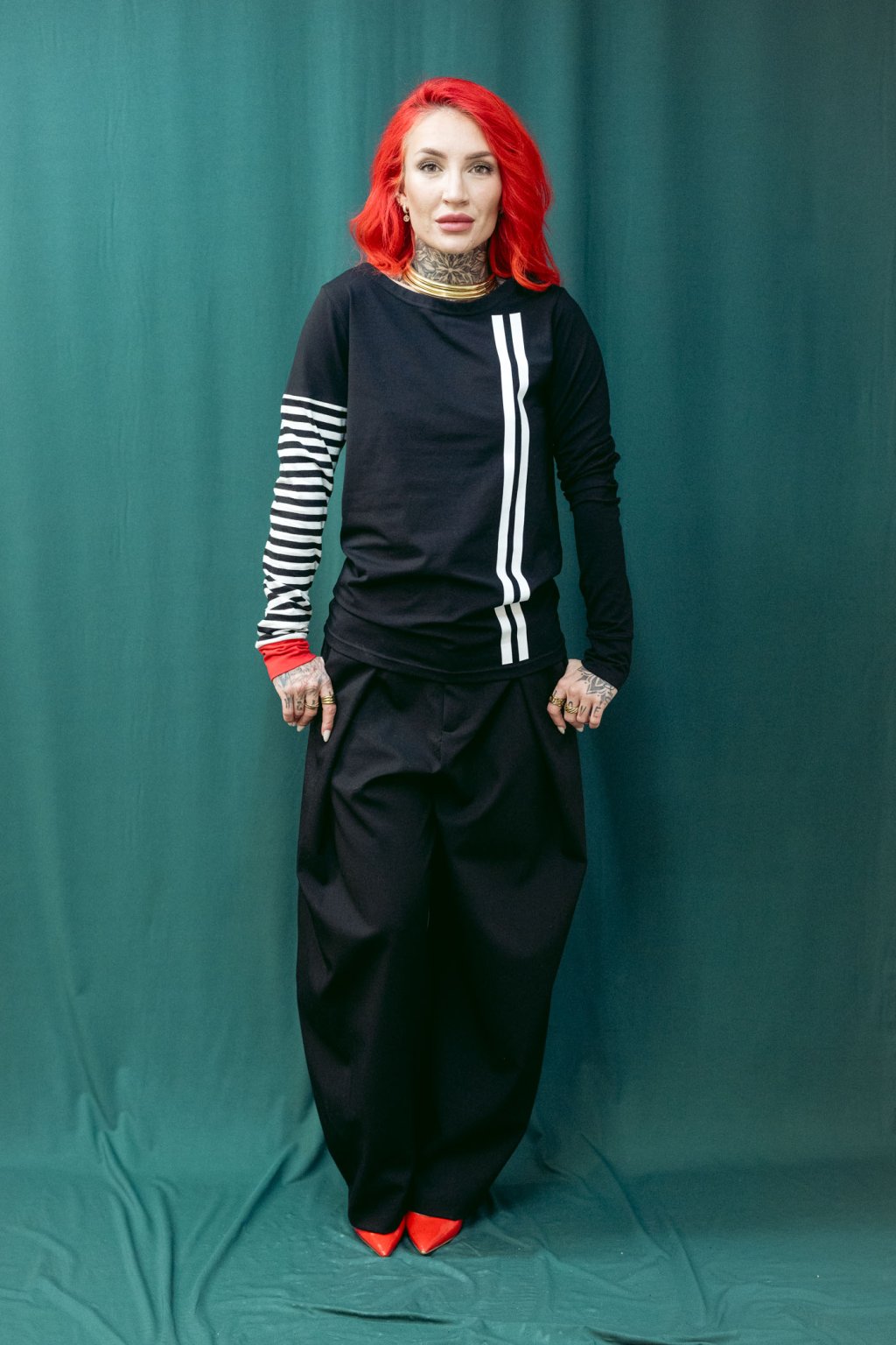 Triko je úzké, v bocích víc zúžené, dlouhý rukávy s lemem. Lodičkový výstřih.