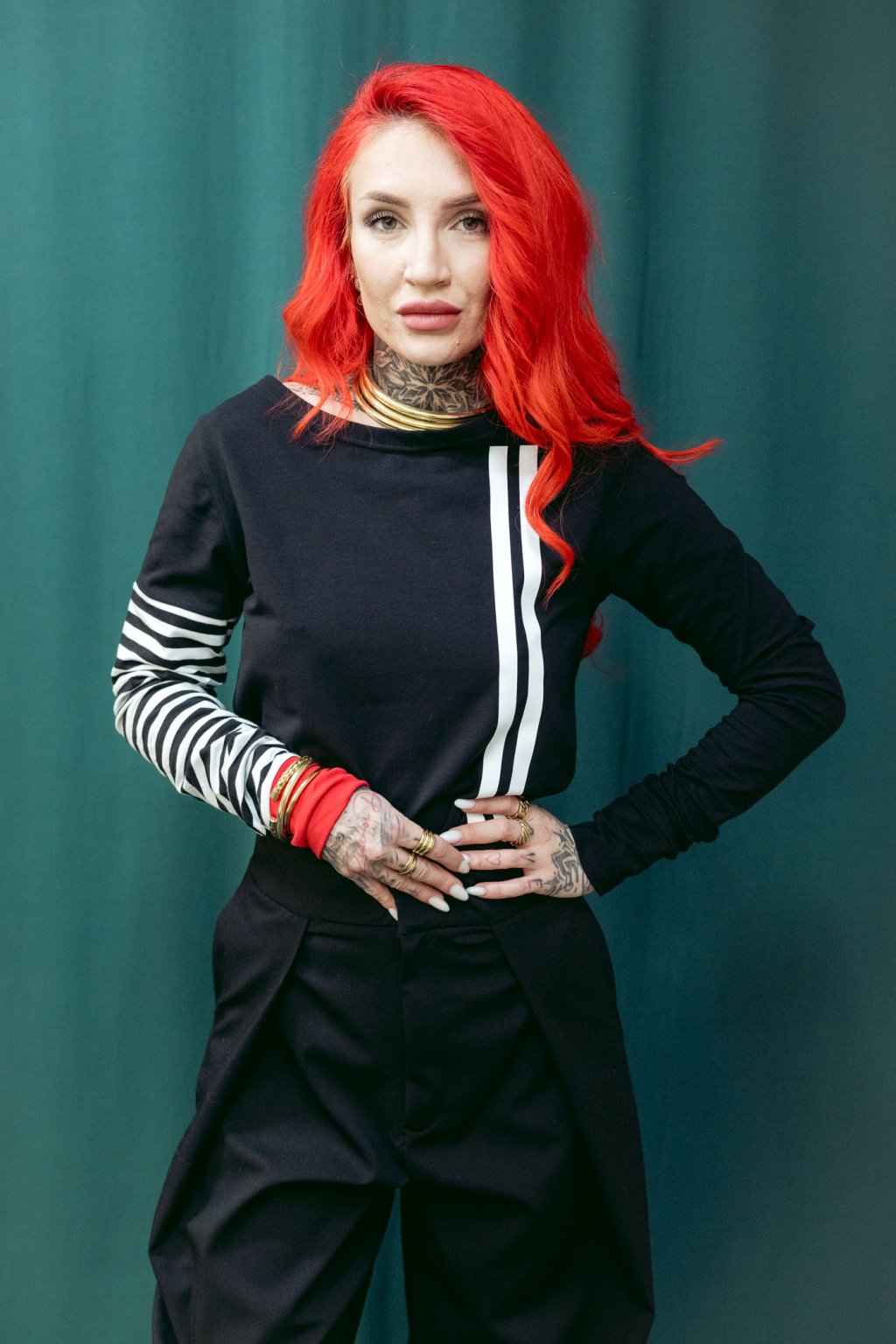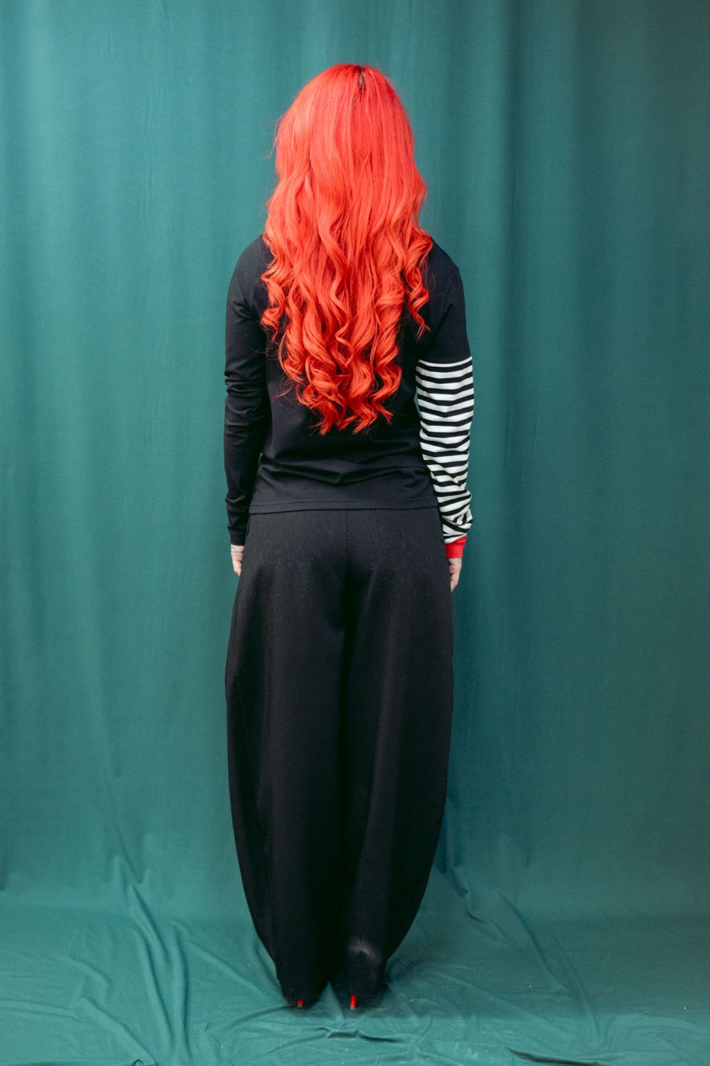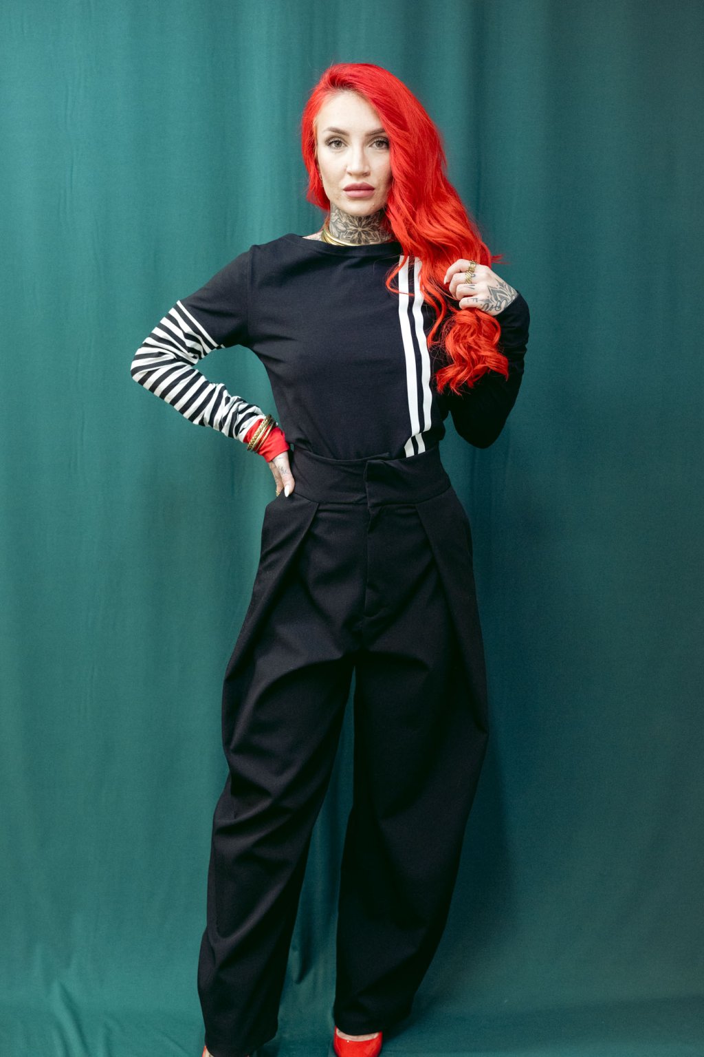 Triko je úzké, v bocích víc zúžené, dlouhý rukávy s lemem. Lodičkový výstřih.