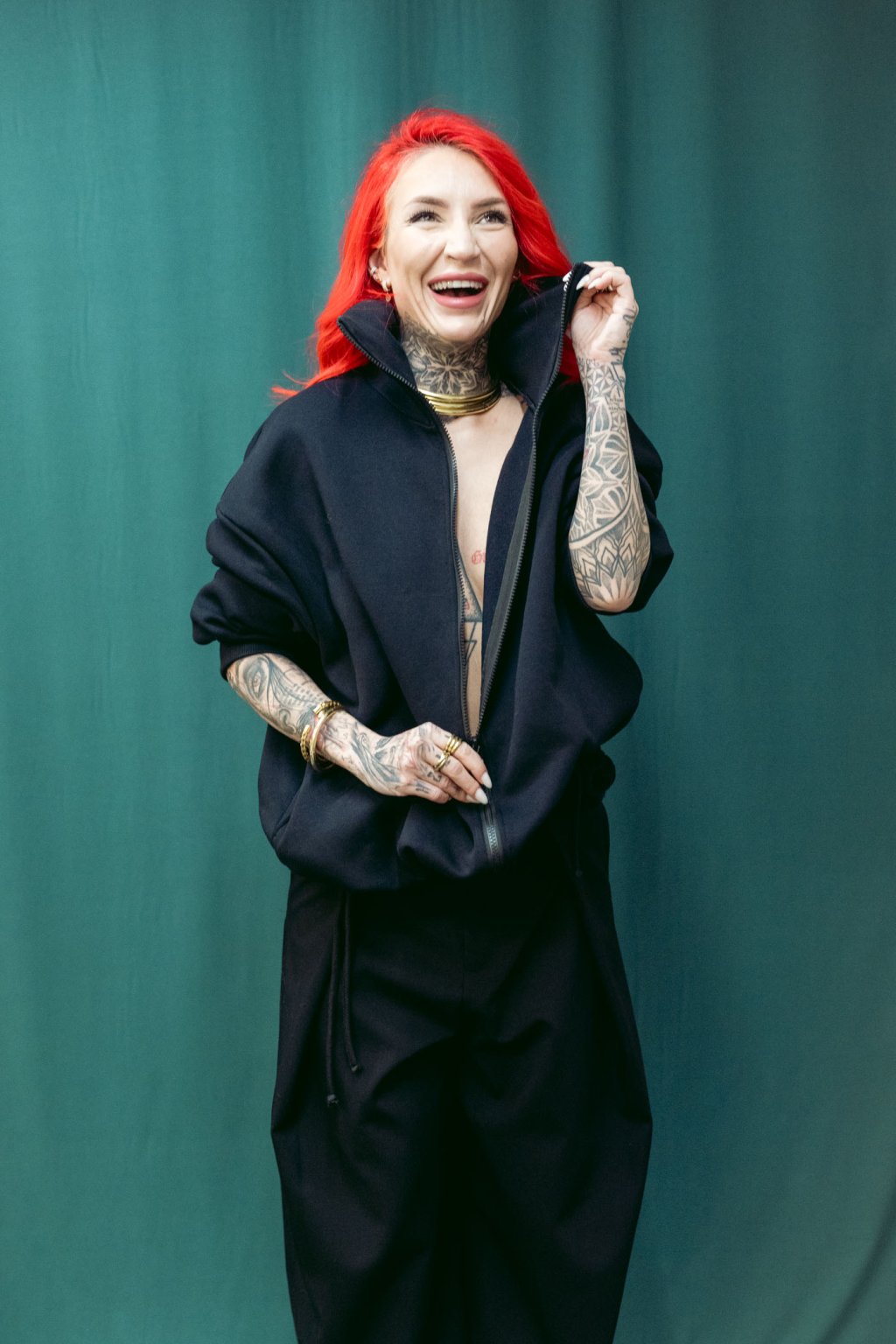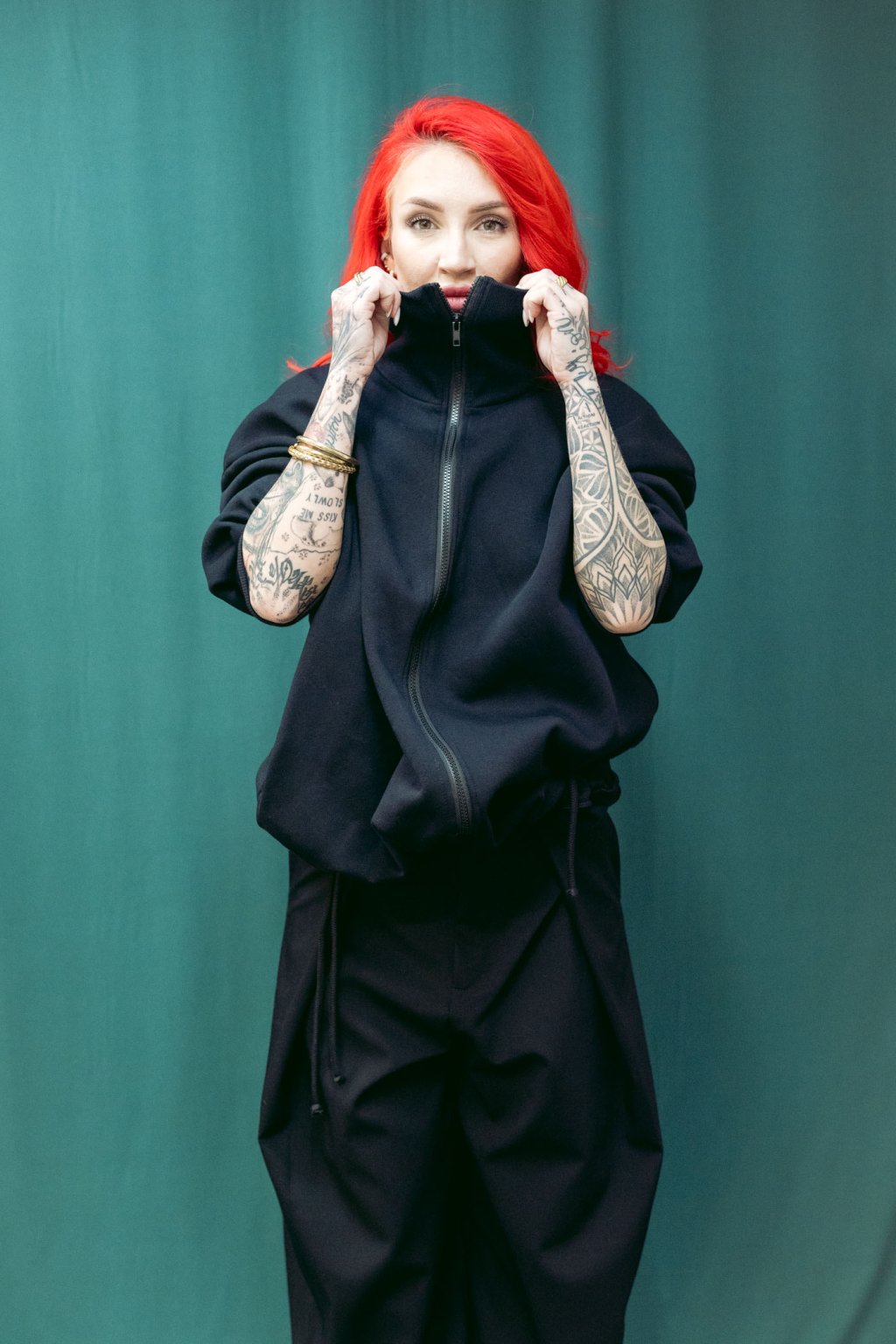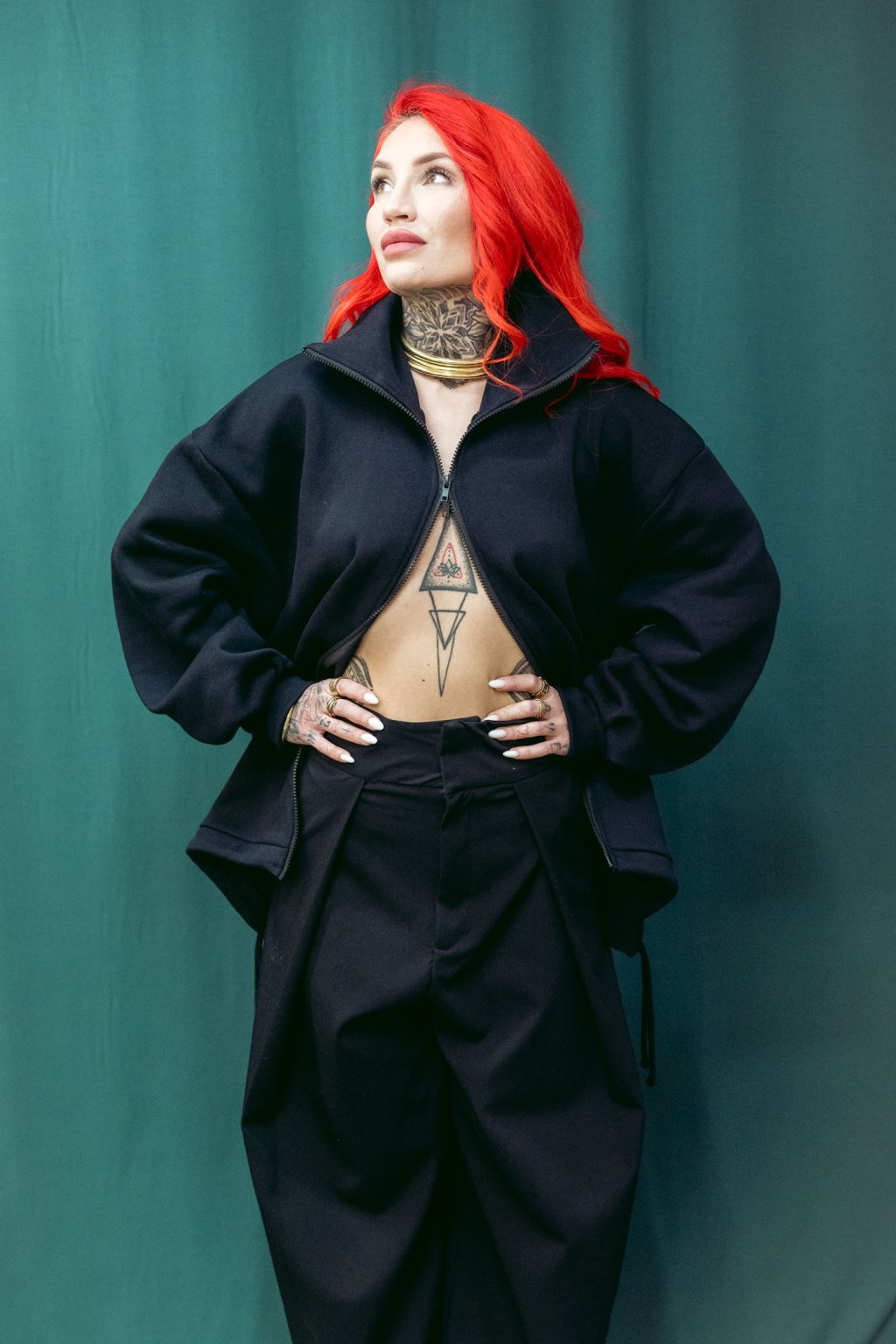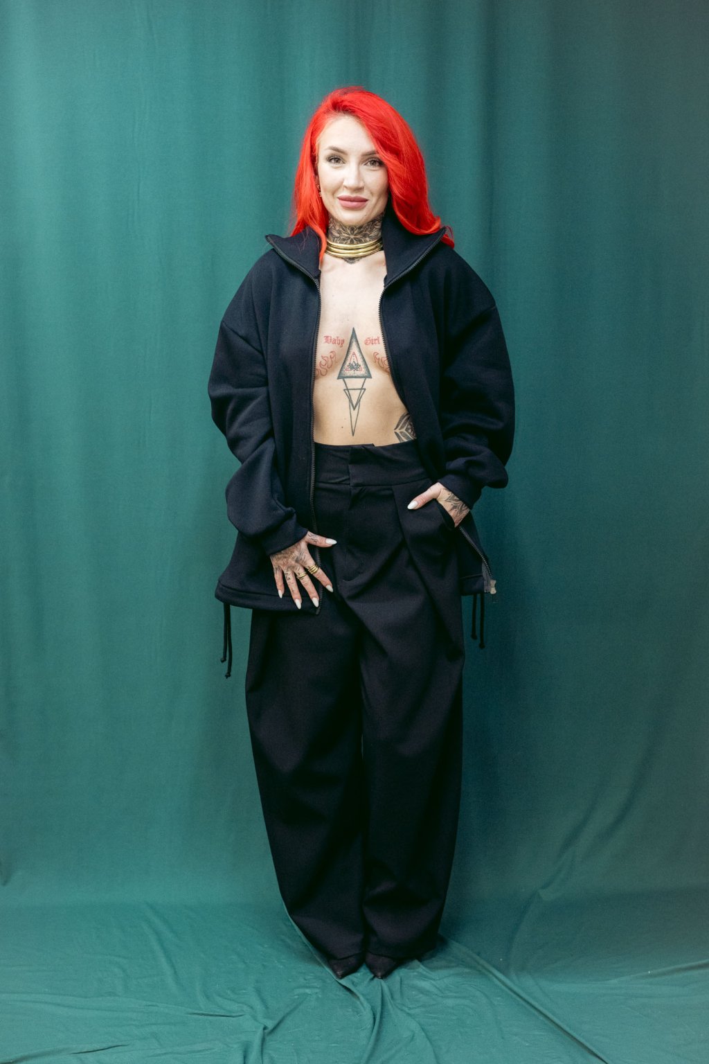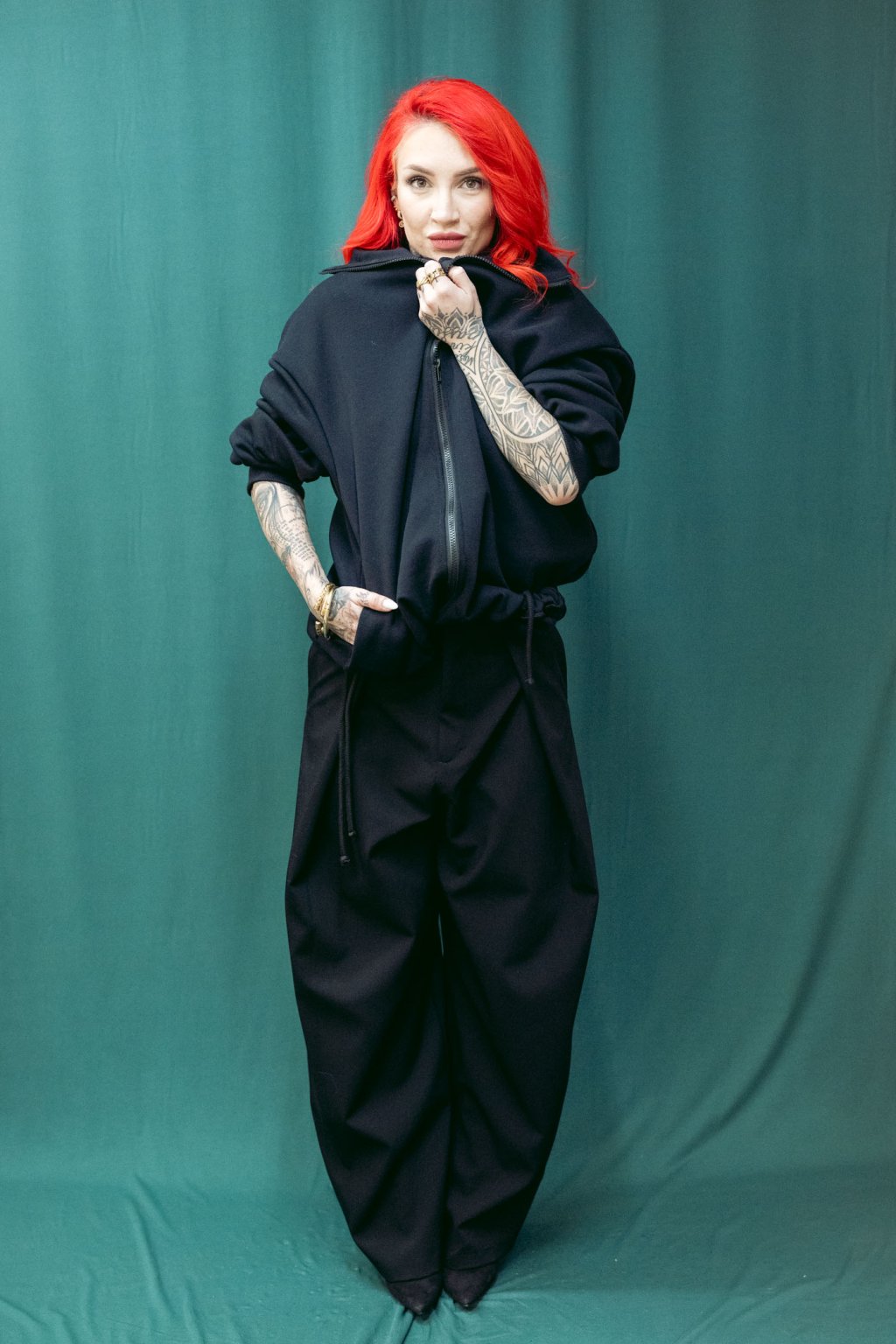 Tento bomber nese čsté nadčasové linie. Je z tlusté bavlněné počesané teplákoviny. Střih je oversized, v ramenou i dole široký. Dlouhé rukávy se sklady u zápěstí. V pase šňúrka, pomocí které upravujete délku bombru. Lze nosit jako delší kousek i stažený třeba až do pasu. Ozdobné červené lemy na vniřní straně. Minimalistický potisk a kapsy z bombru dělají stylový kousek, který se výborně nosí a je skvěle kombinovatelný s kousky z vašeho šatníku.