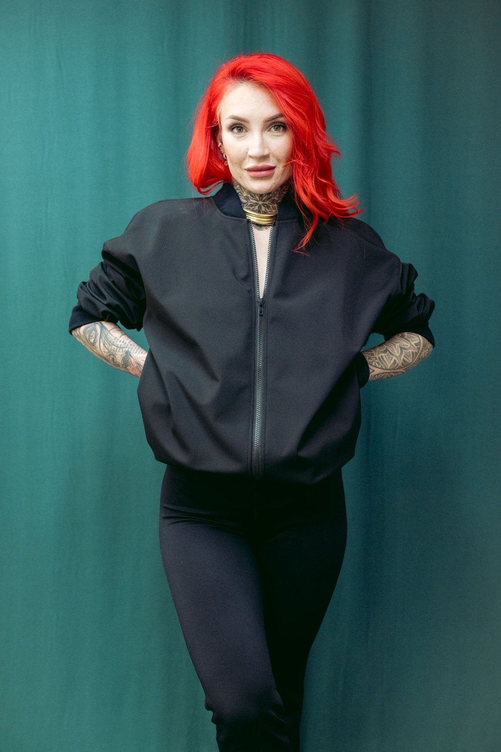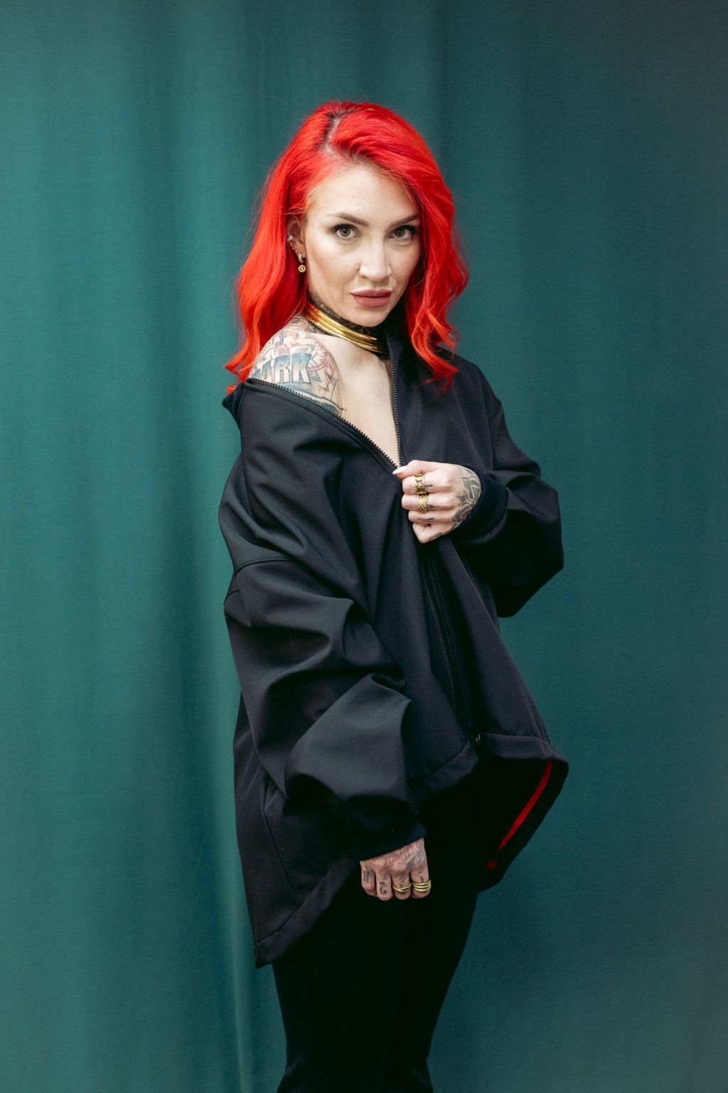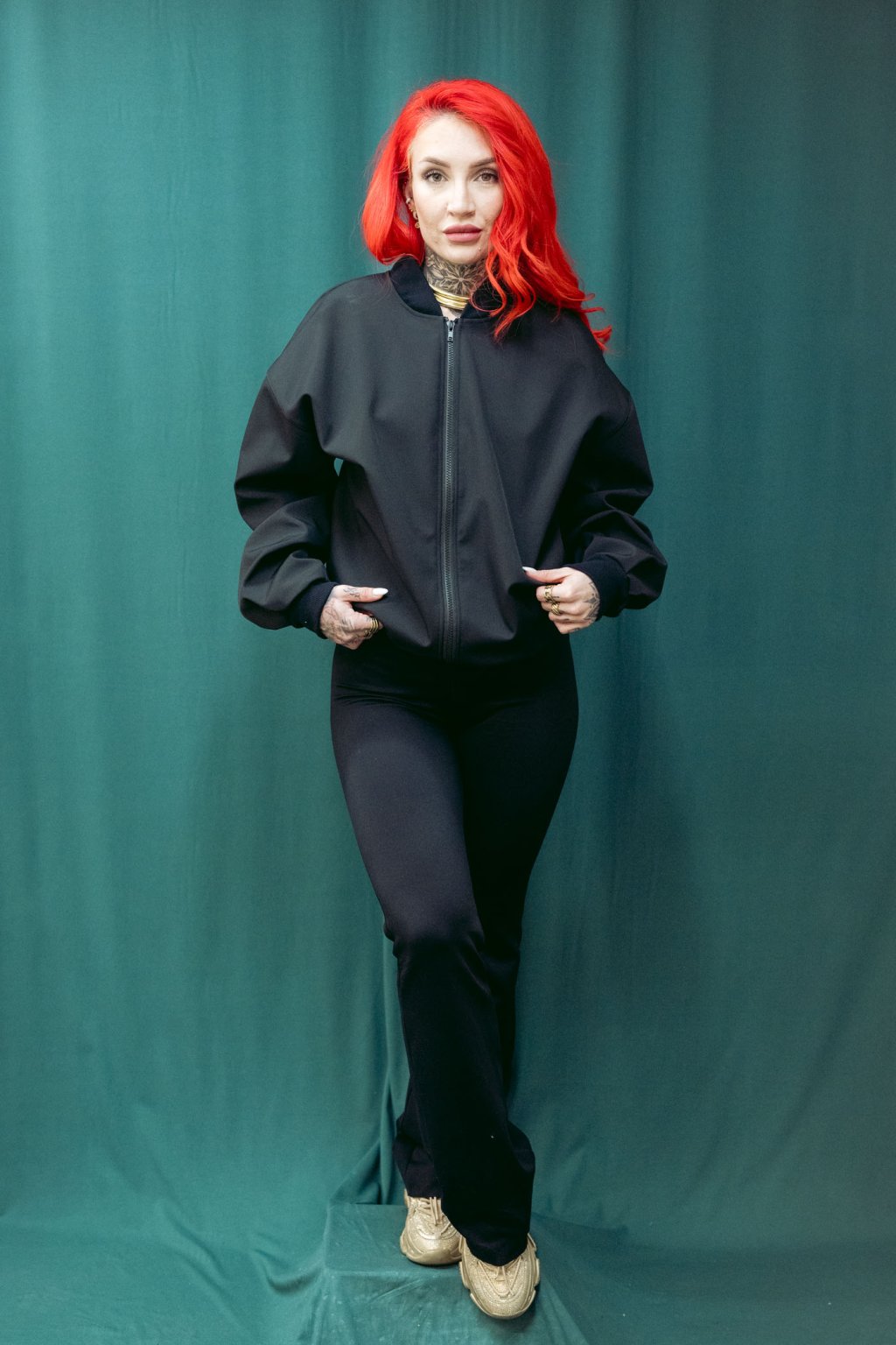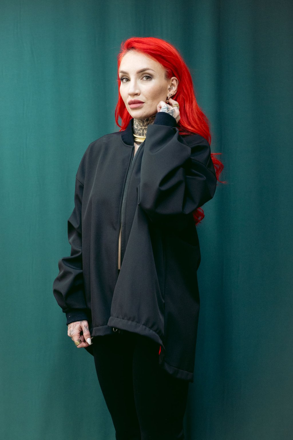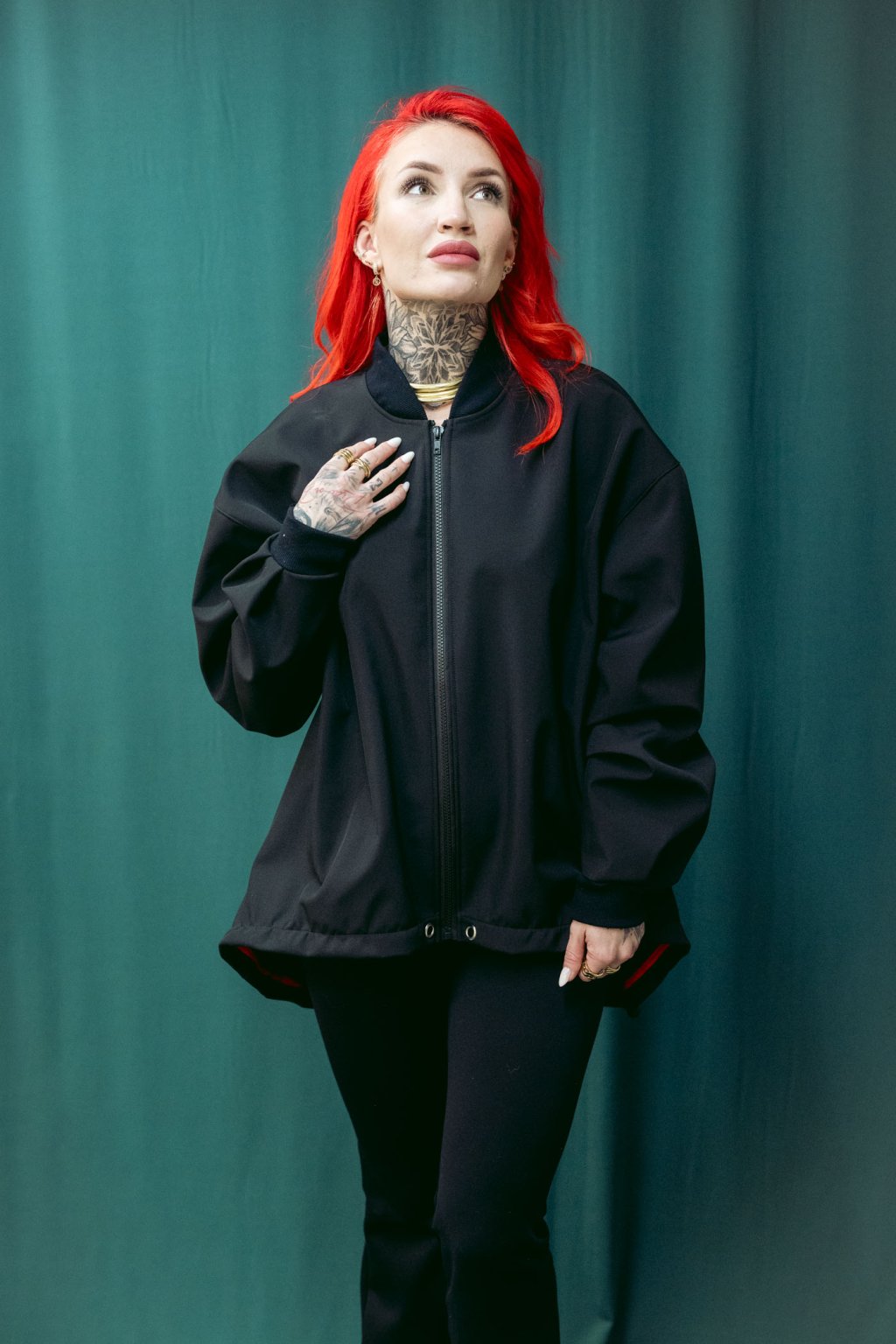 Tento softshelový bomber nese čsté nadčasové linie. Střih je oversized, v ramenou i dole široký. Dlouhé rukávy se sklady u zápěstí. V pase šňúrka, pomocí které upravujete délku bombru. Lze nosit jako delší kousek i stažený třeba až do pasu. Ozdobné červené lemy na vniřní straně a kapsy z bombru dělají stylový kousek, který se výborně nosí a je skvěle kombinovatelný s kousky z vašeho šatníku.