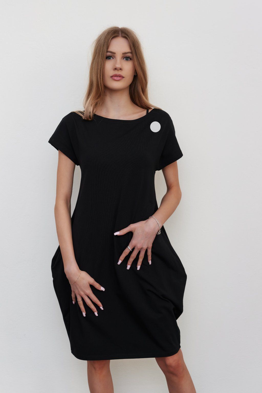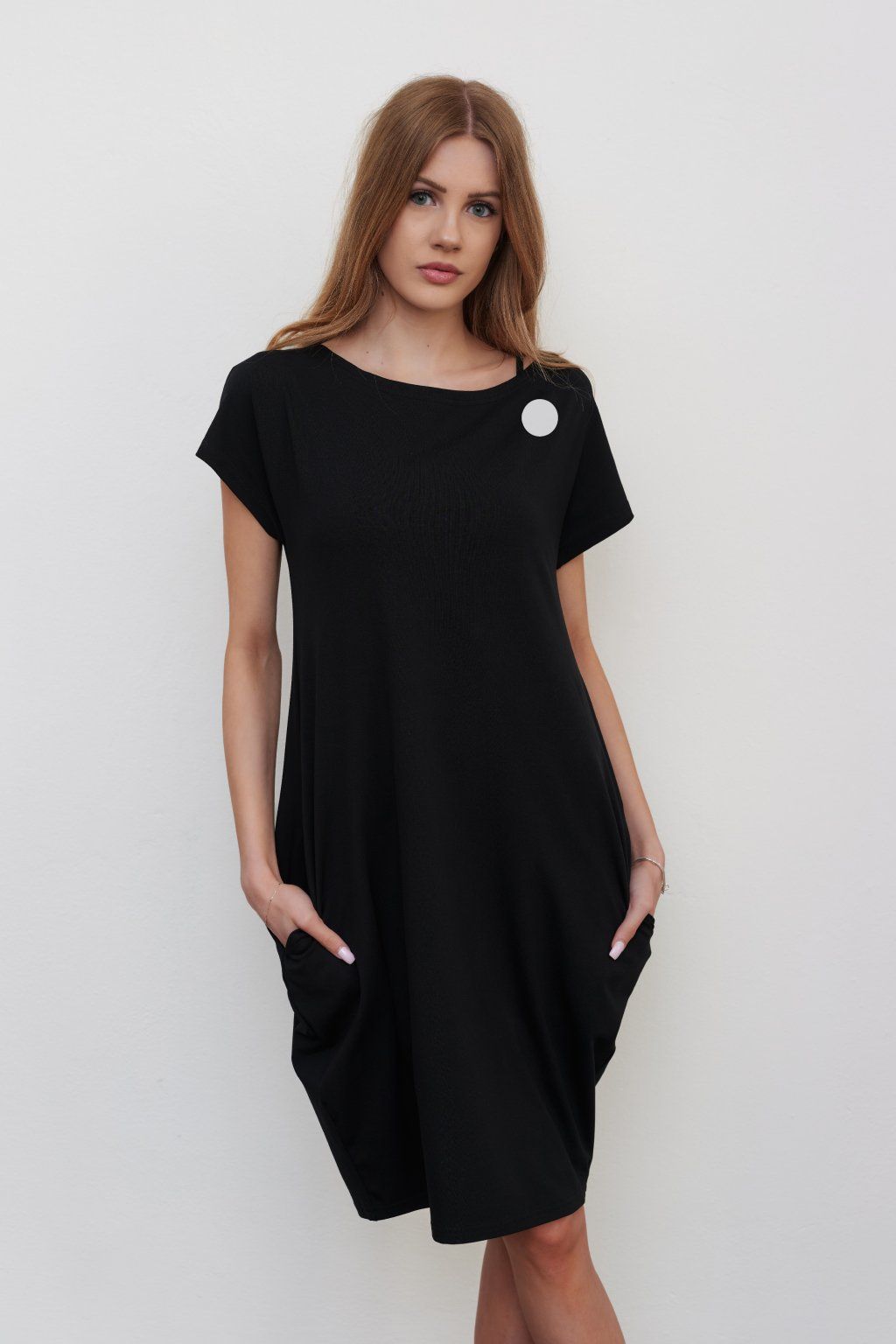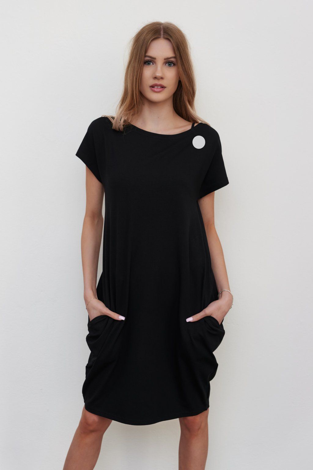 Šaty se směrem dolů rozšiřují, pak zaoblují a mírně zužují. Lodičkový výstřih. Krátký kimono rukáv. Boční kapsy.