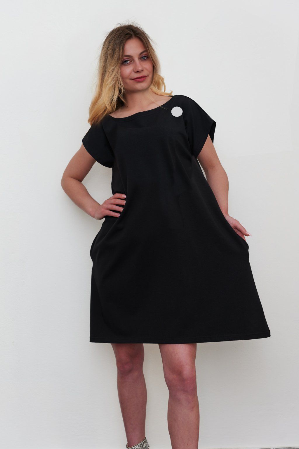 Lodičkový výstřih a kimono rukáv. S bočními kapsami.