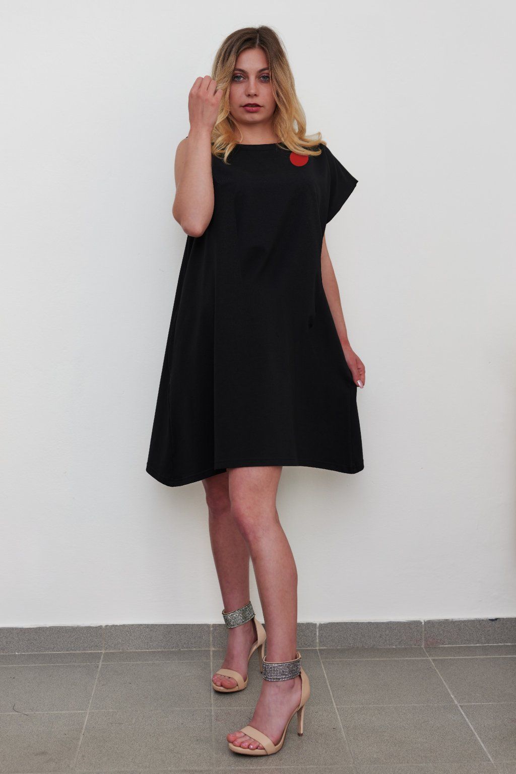 Šaty jsou dostupné s bílým, červeným nebo černým puntíkem.