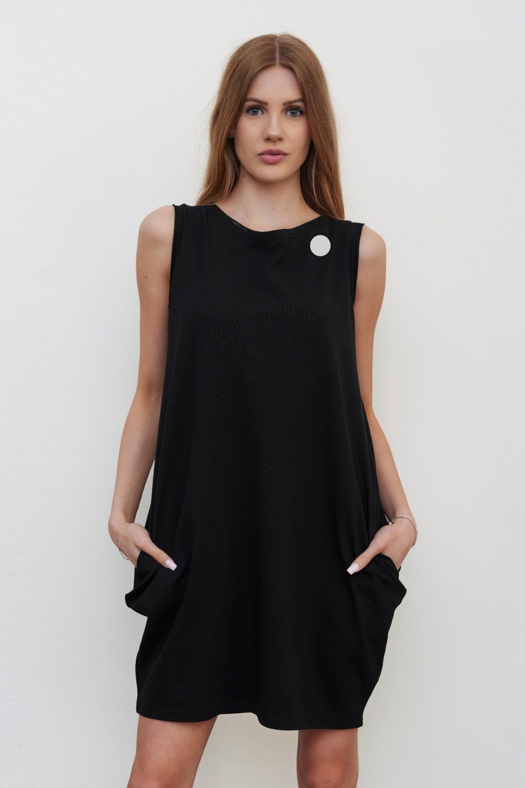 Šaty se směrem dolů rozšiřují pak zaoblují a mírně zužují. Lodičkový výstřih. Bez rukávu.Jednoduchý lem. Boční kapsy.