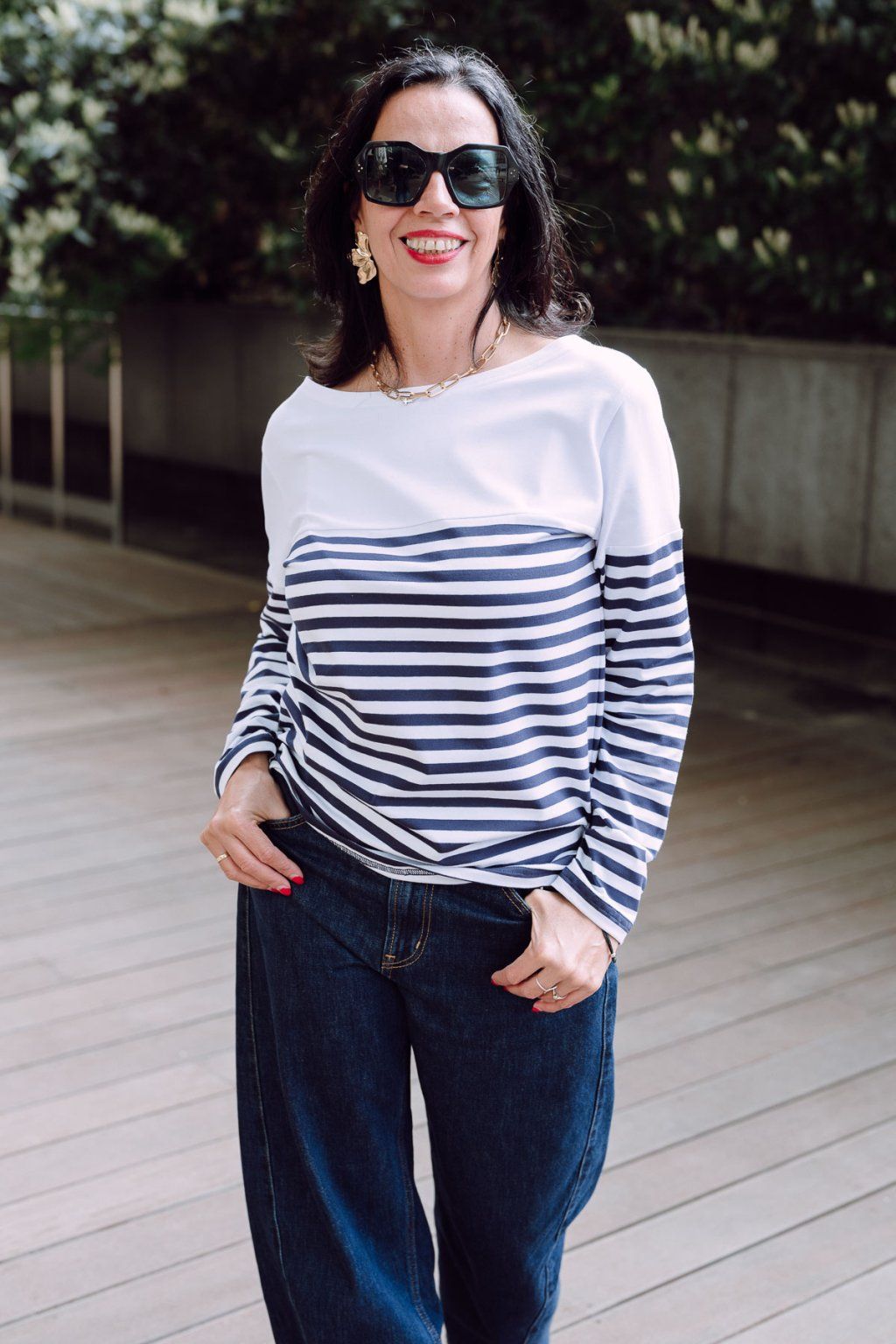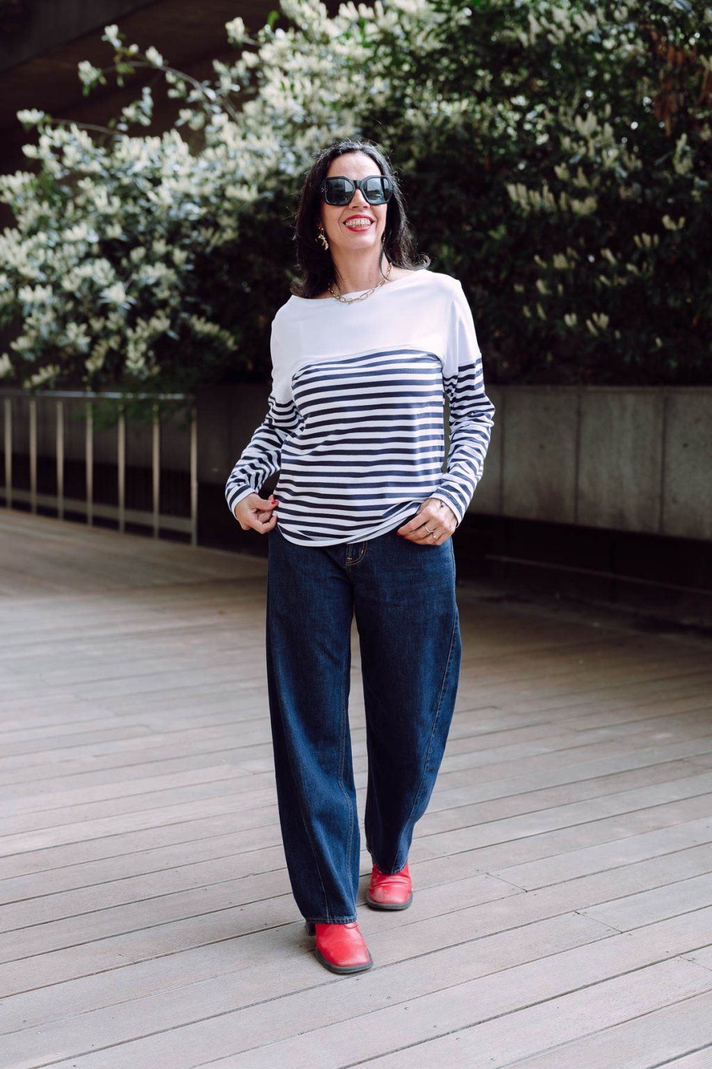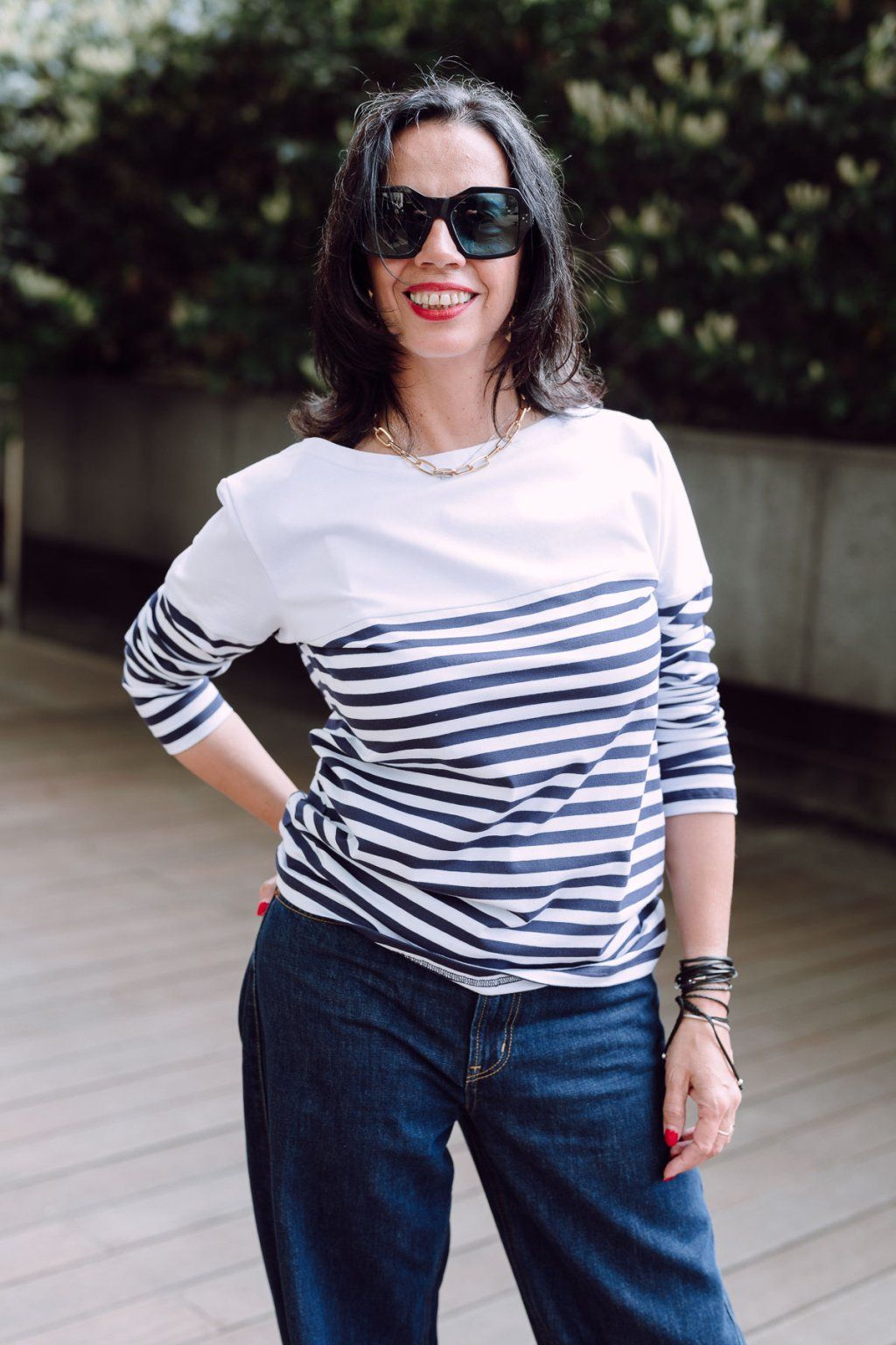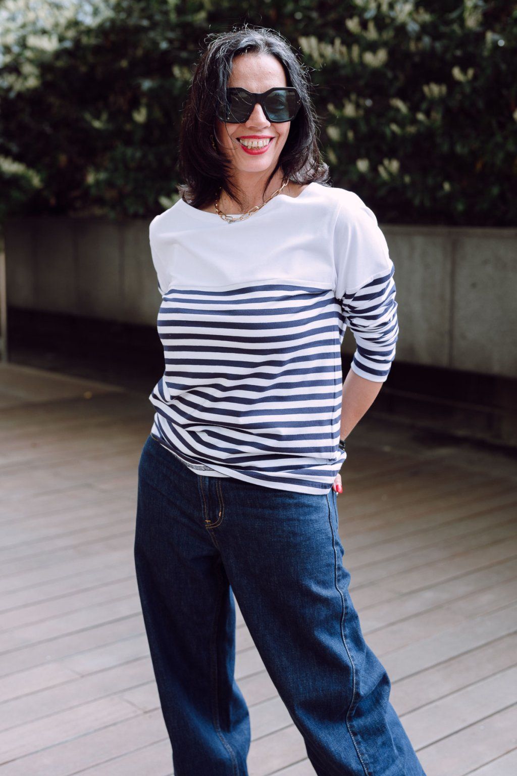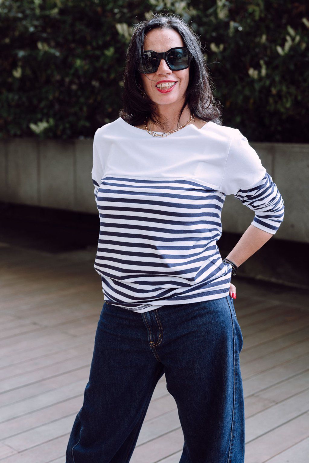 Tričko rovného střihu s lodičkovým výstřihem. Kombinace modro-bílého proužku s bílým úpletem ve stylu J.P.Gaultiera.