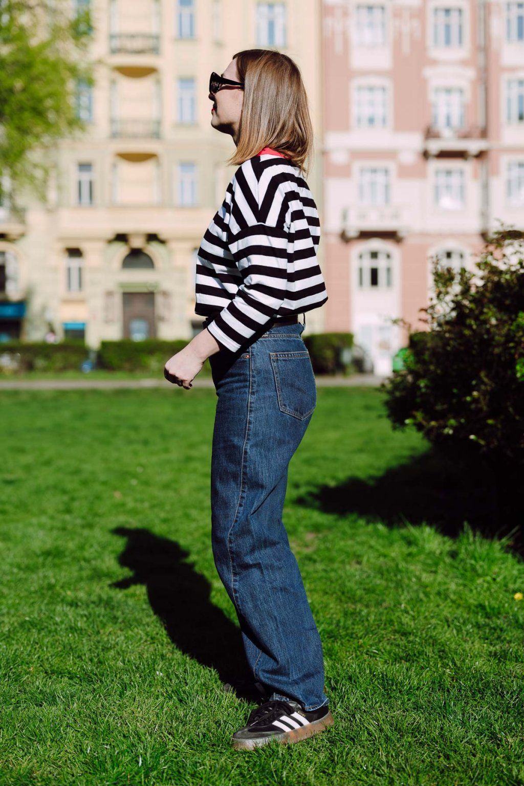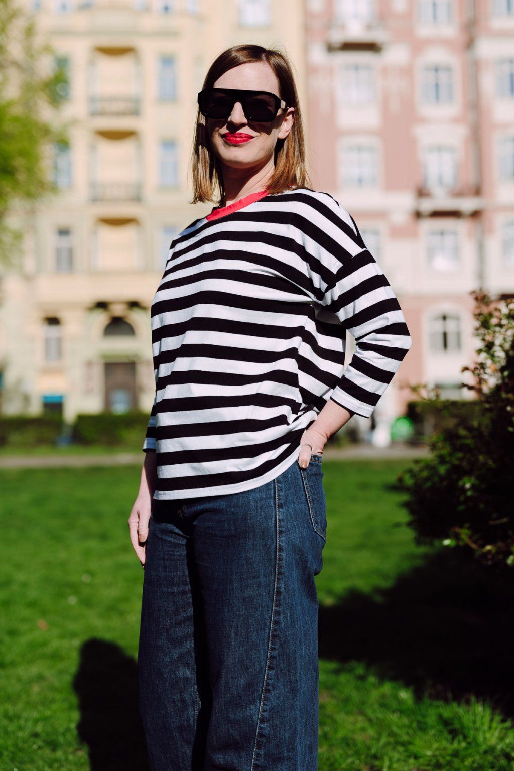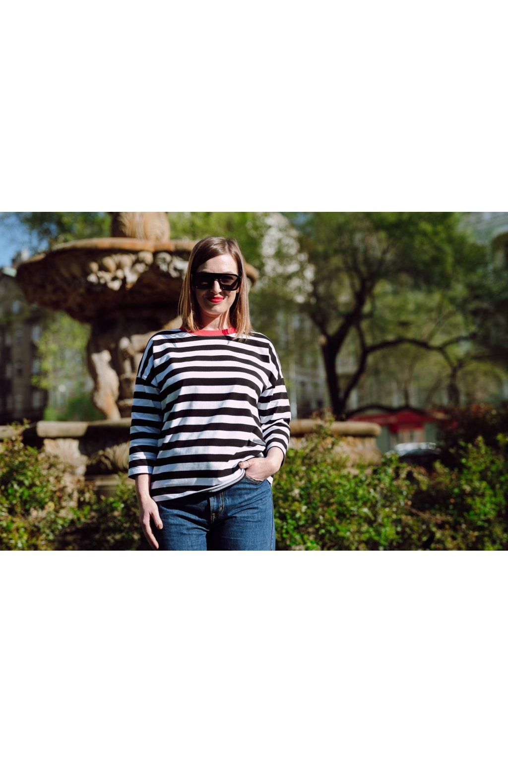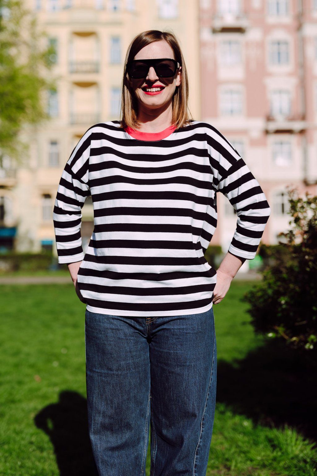 Triko šijeme z bavlněného elastického úpletu. Basic střih je mírně upraven do oversized, v ramenou je triko široké a rukávy jsou směrem k zápěstí trochu zúžené. Kulatý výstřih je zakončený širším dvojitým červeným lemem.