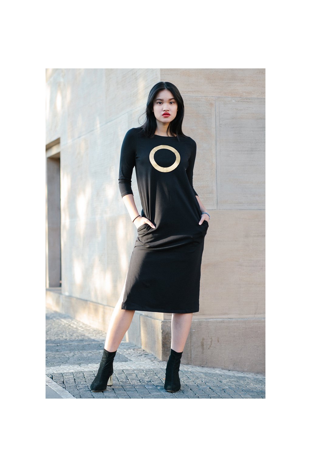 Šaty jsou rovného střihu, stejně široké v prsou a v bocích. Lodičkový výstřih. 3/4 všívaný rukáv. Boční kapsy. Rozparky po stranách.