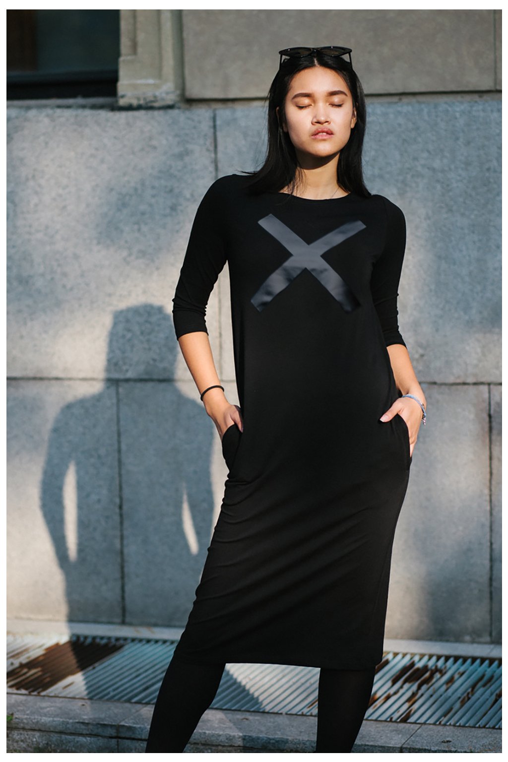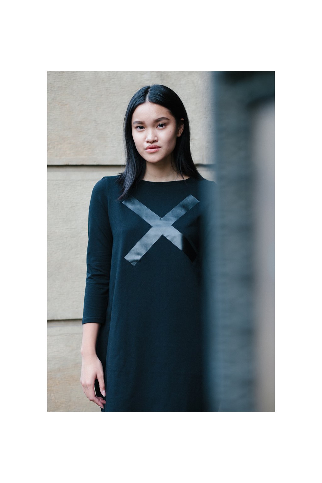 Šaty jsou rovného střihu, stejně široké v prsou a v bocích. Lodičkový výstřih. 3/4 všívaný rukáv. Boční kapsy.