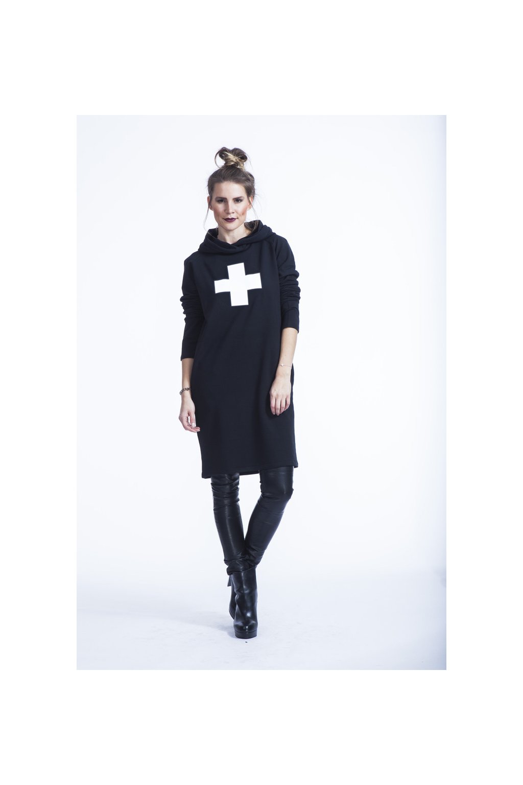 Šaty jsou rovného střihu. Dlouhý raglánový rukáv. Boční kapsy. Kapuce.