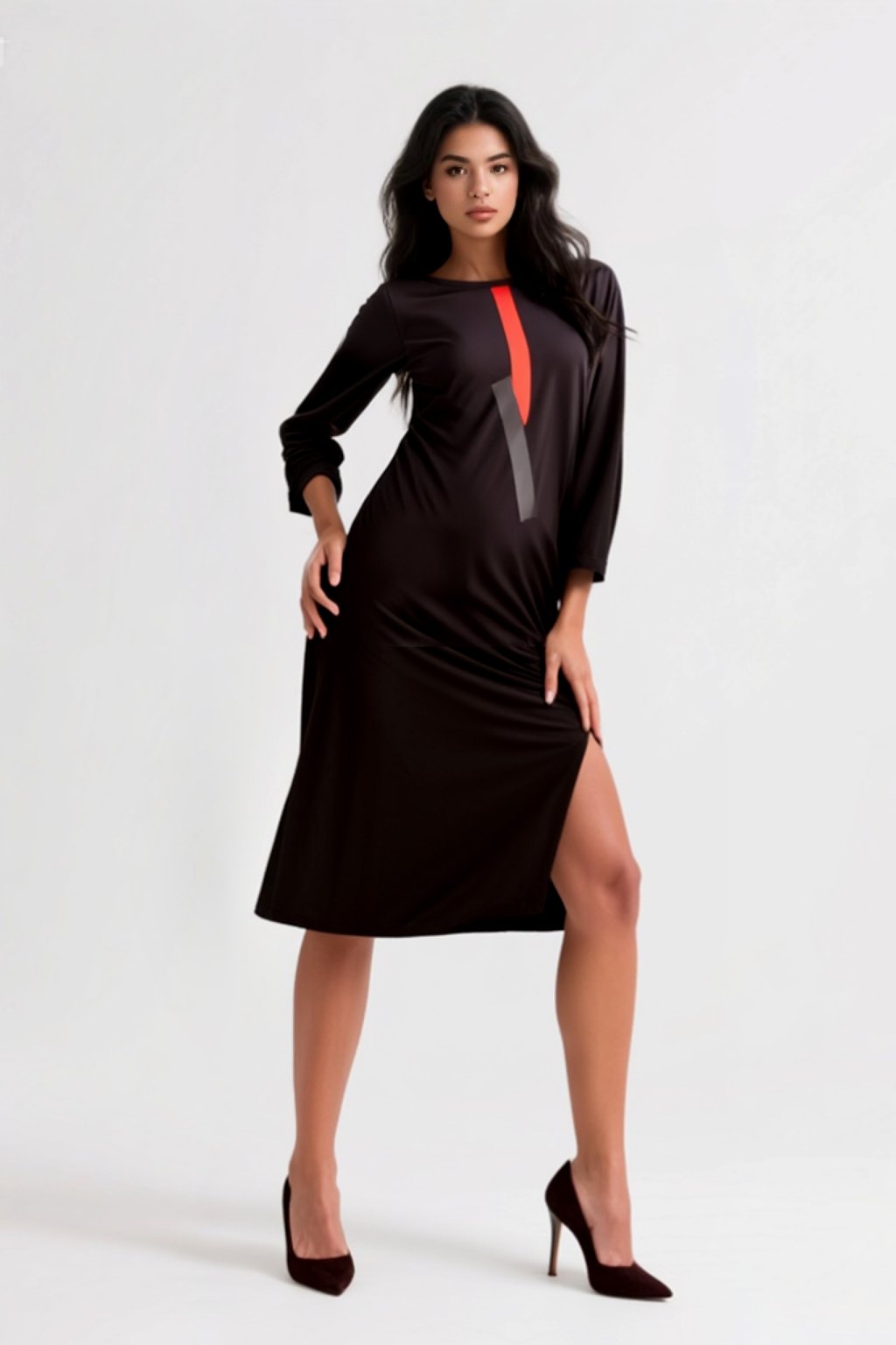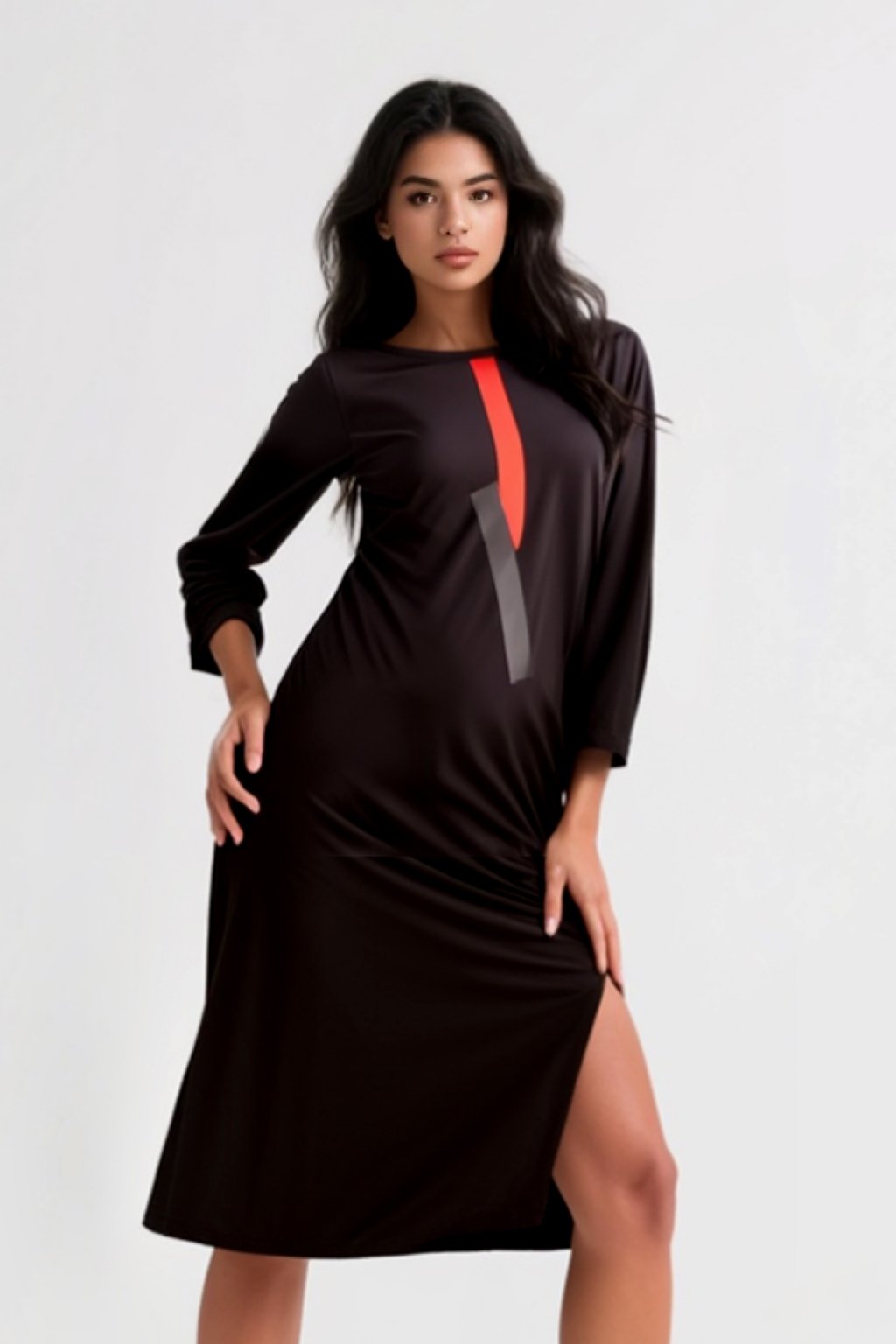 Šaty jsou rovného střihu, stejně široké v prsou a v bocích. Lodičkový výstřih. 3/4 všívaný rukáv. Boční kapsy. Rozparky na bocích.