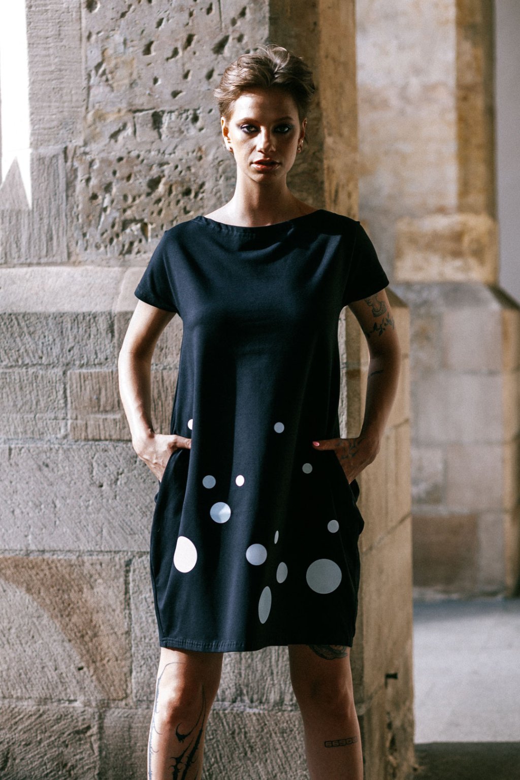 Šaty se směrem dolů rozšiřují, pak zaoblují a mírně zužují. Lodičkový výstřih. Krátký kimono rukáv. Boční kapsy.