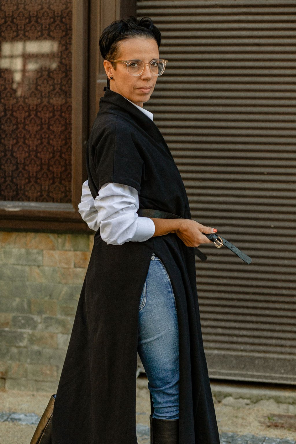 Černá dlouhá vesta se šálovým lemem je ušitá z elastické teplákoviny. Je rovného střihu a má kimono krátký rukáv a hodně hluboké rozparky po stranách.