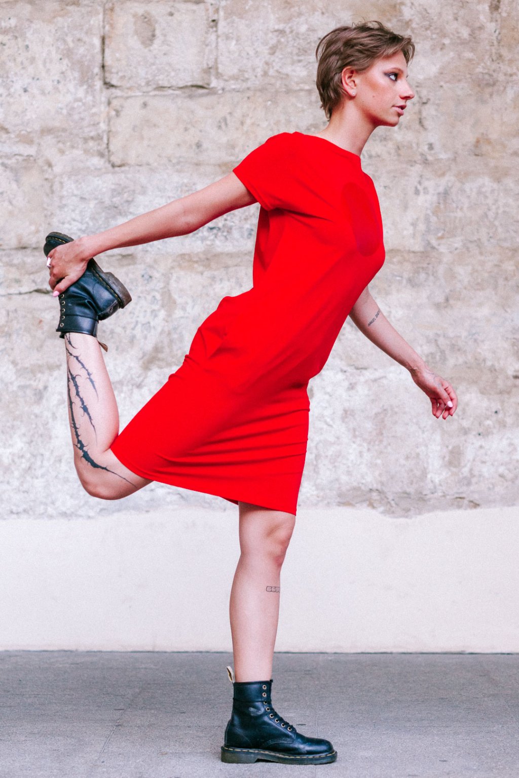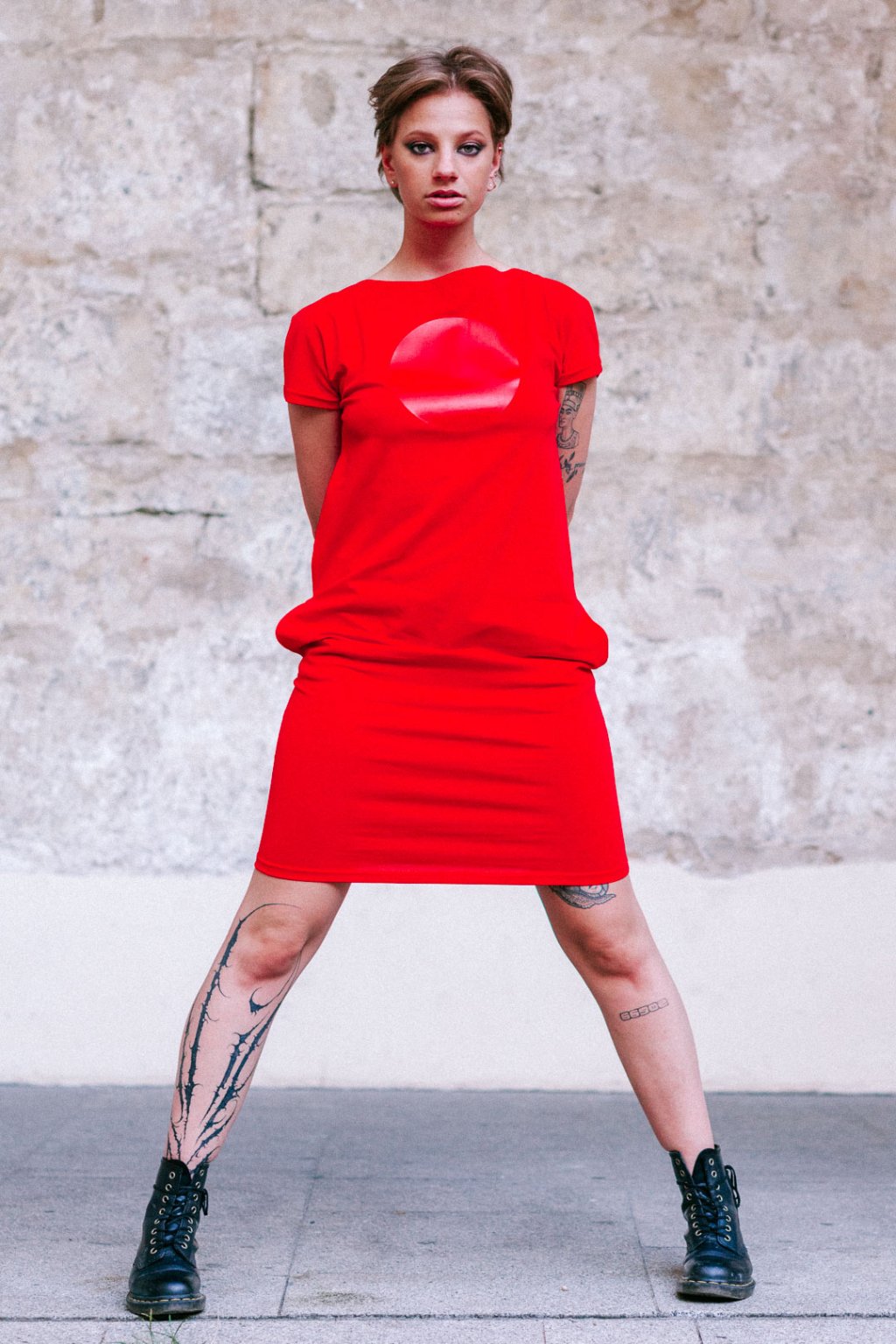 Šaty jsou rovného střihu, stejně široké v prsou a v bocích. Lodičkový výstřih. Krátký kimono rukáv. Boční kapsy.