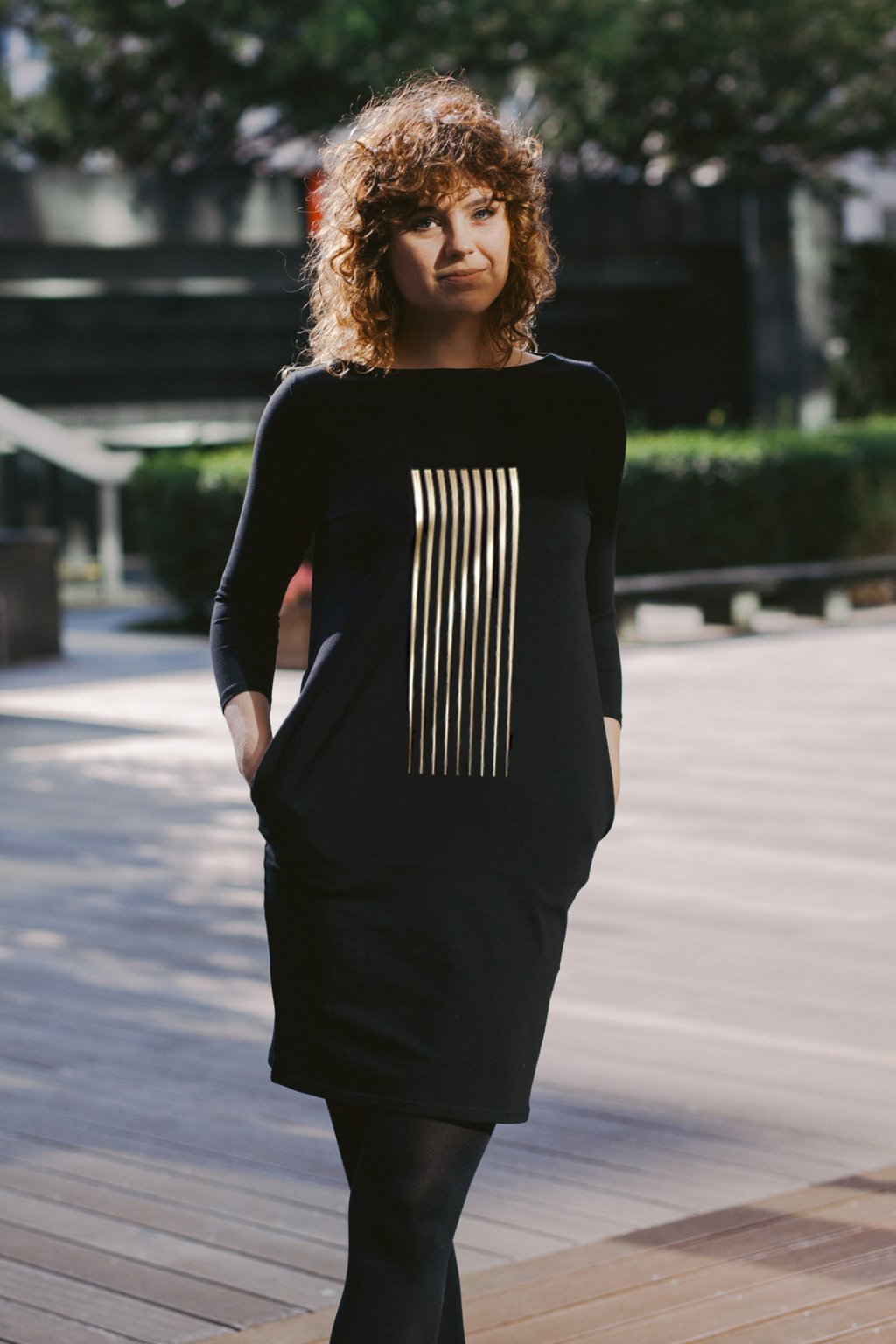 Šaty jsou rovného střihu, stejně široké v prsou a v bocích. Lodičkový výstřih. 3/4 všívaný rukáv. Boční kapsy.