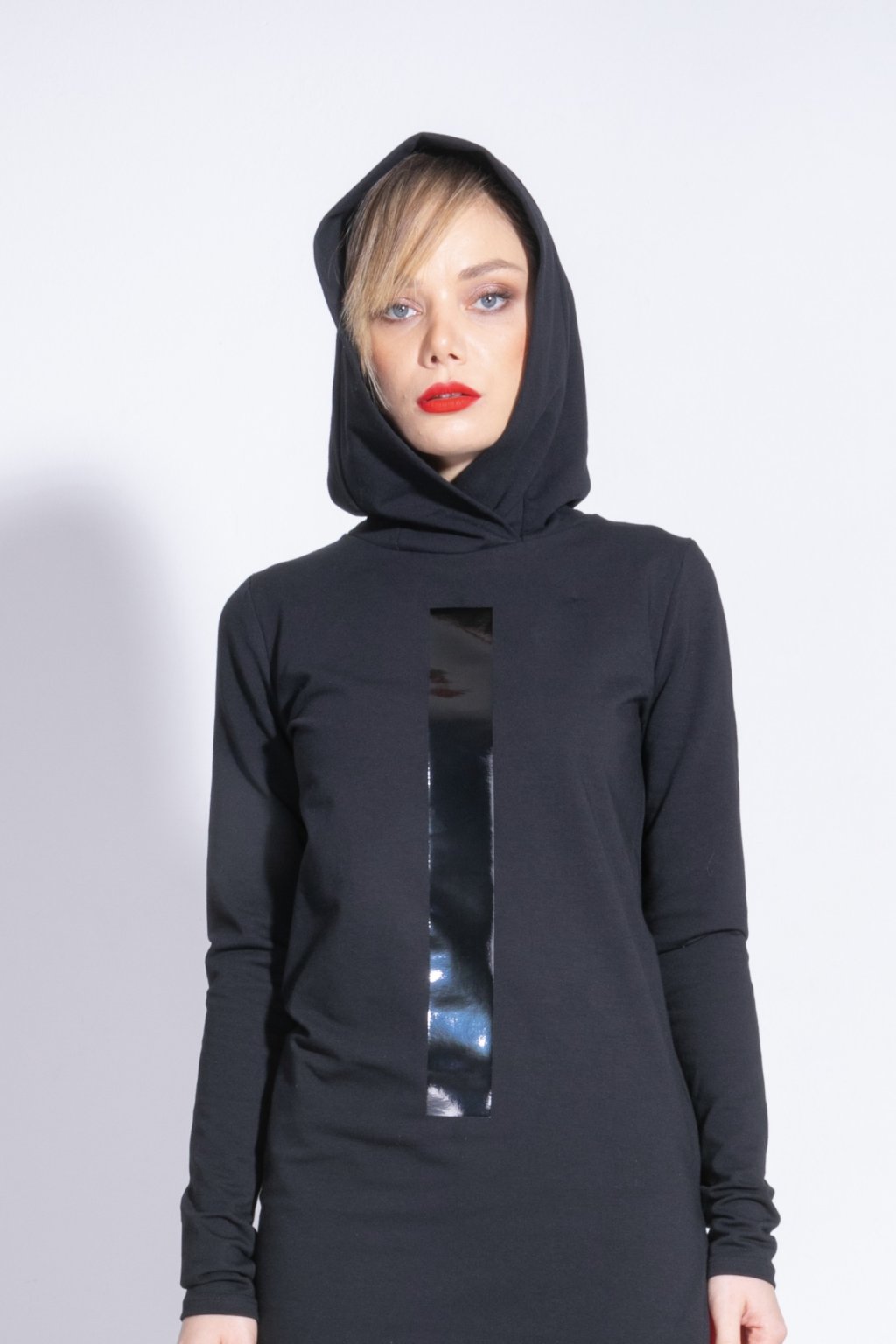 Šaty jsou rovného střihu, stejně široké v prsou a v bocích. Velká naddimenzovaná kapuce. Dlouhý raglánový rukáv. Kapsy