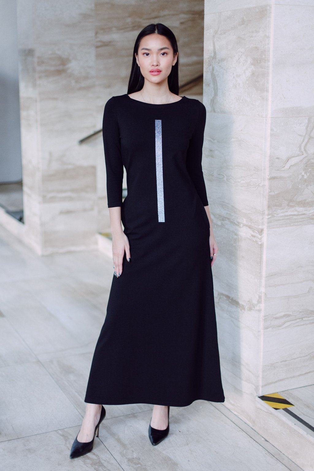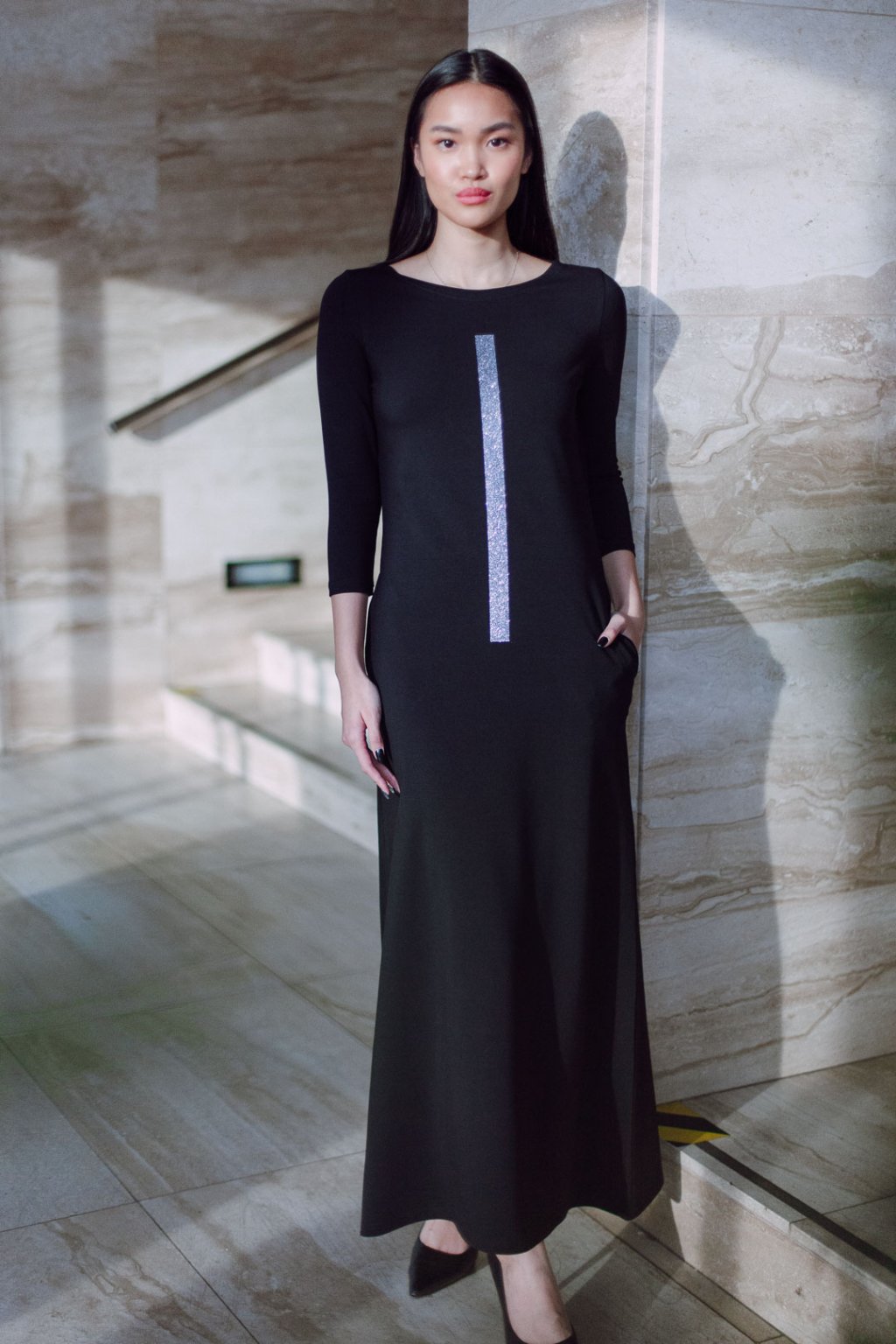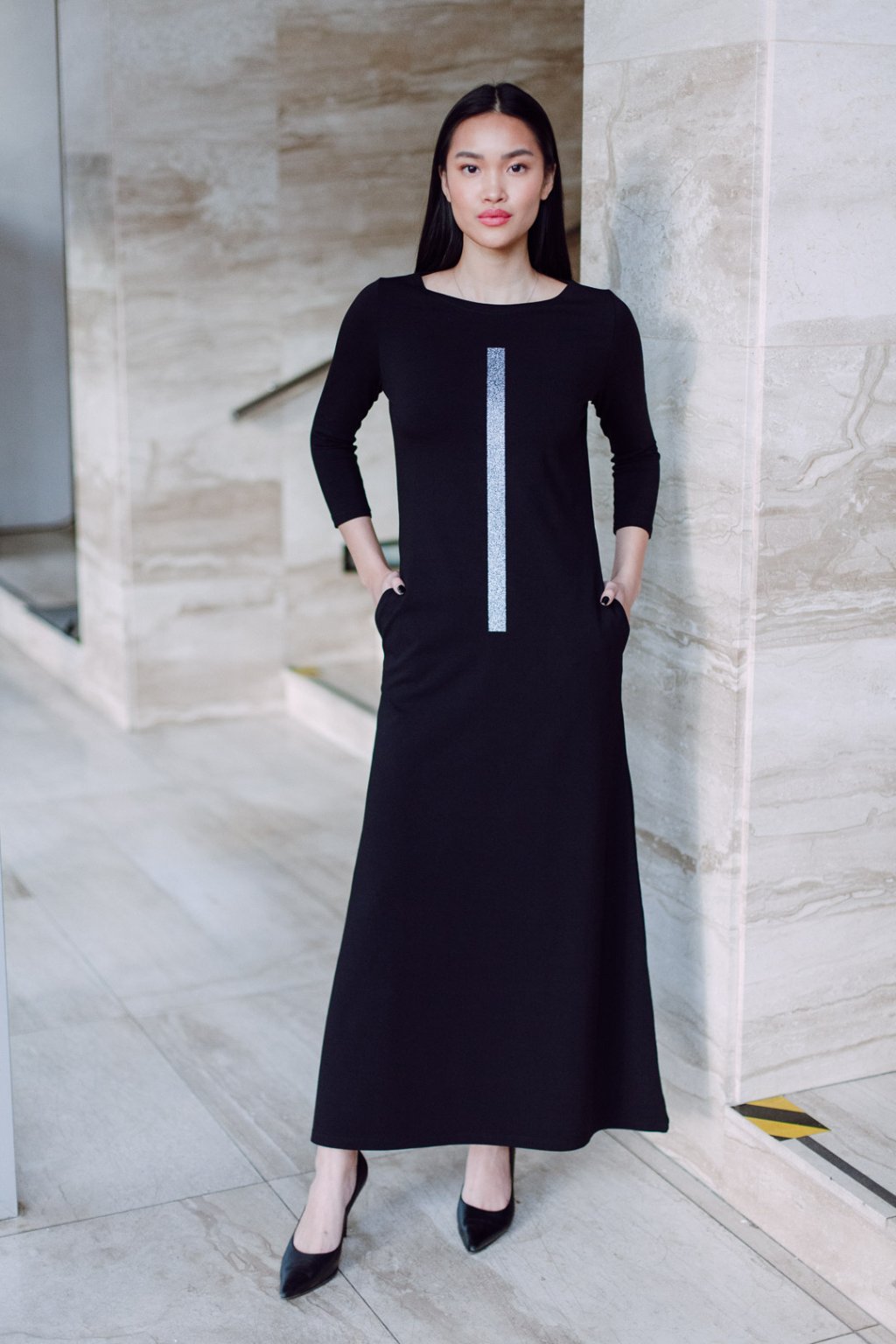 Černé úpletové šaty s lodičkovým výstřihem v oblíbené A siluetě, projmuté. Šaty v maxi délce, 3/4 všívaný rukáv, boční kapsy.