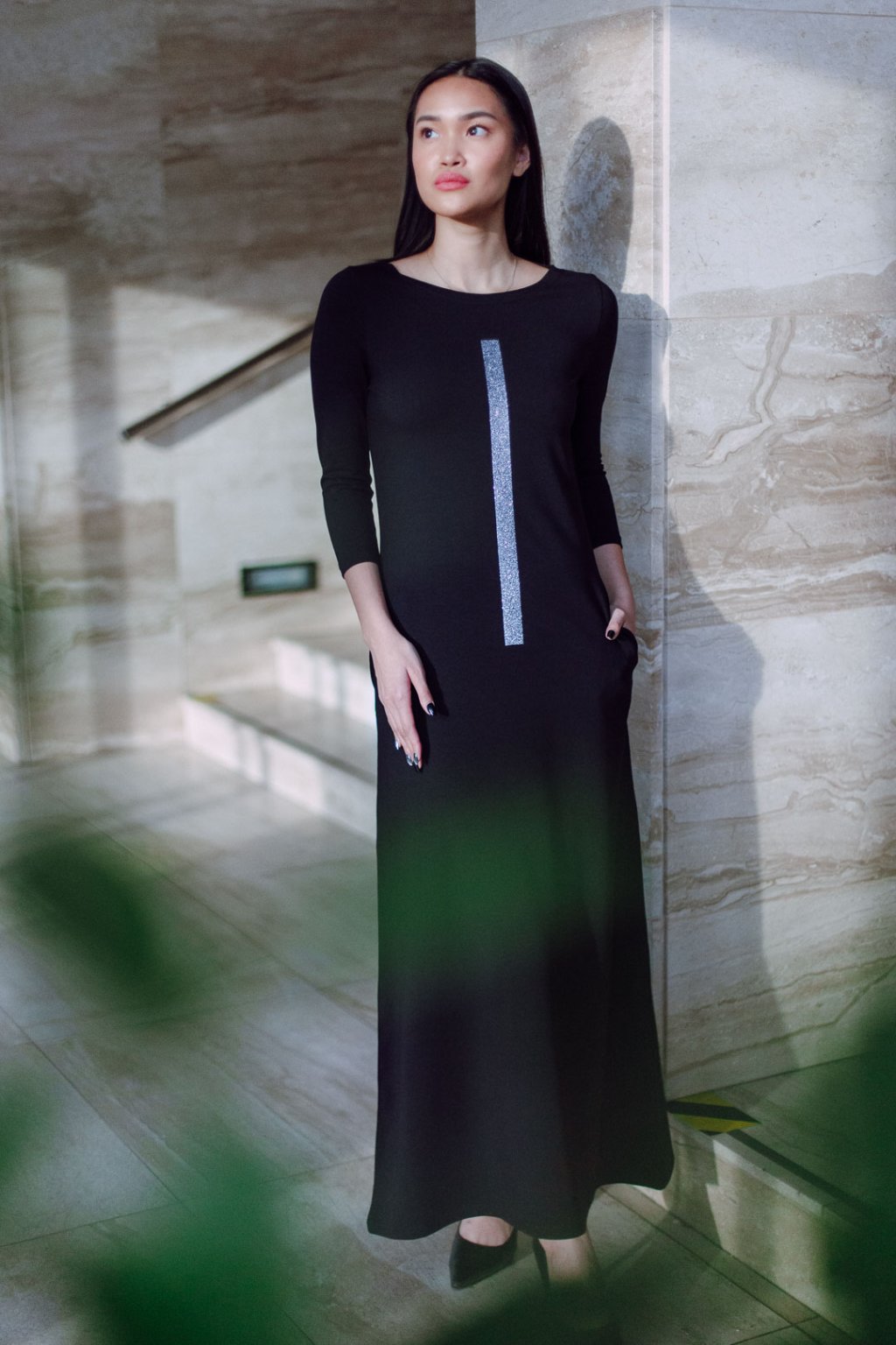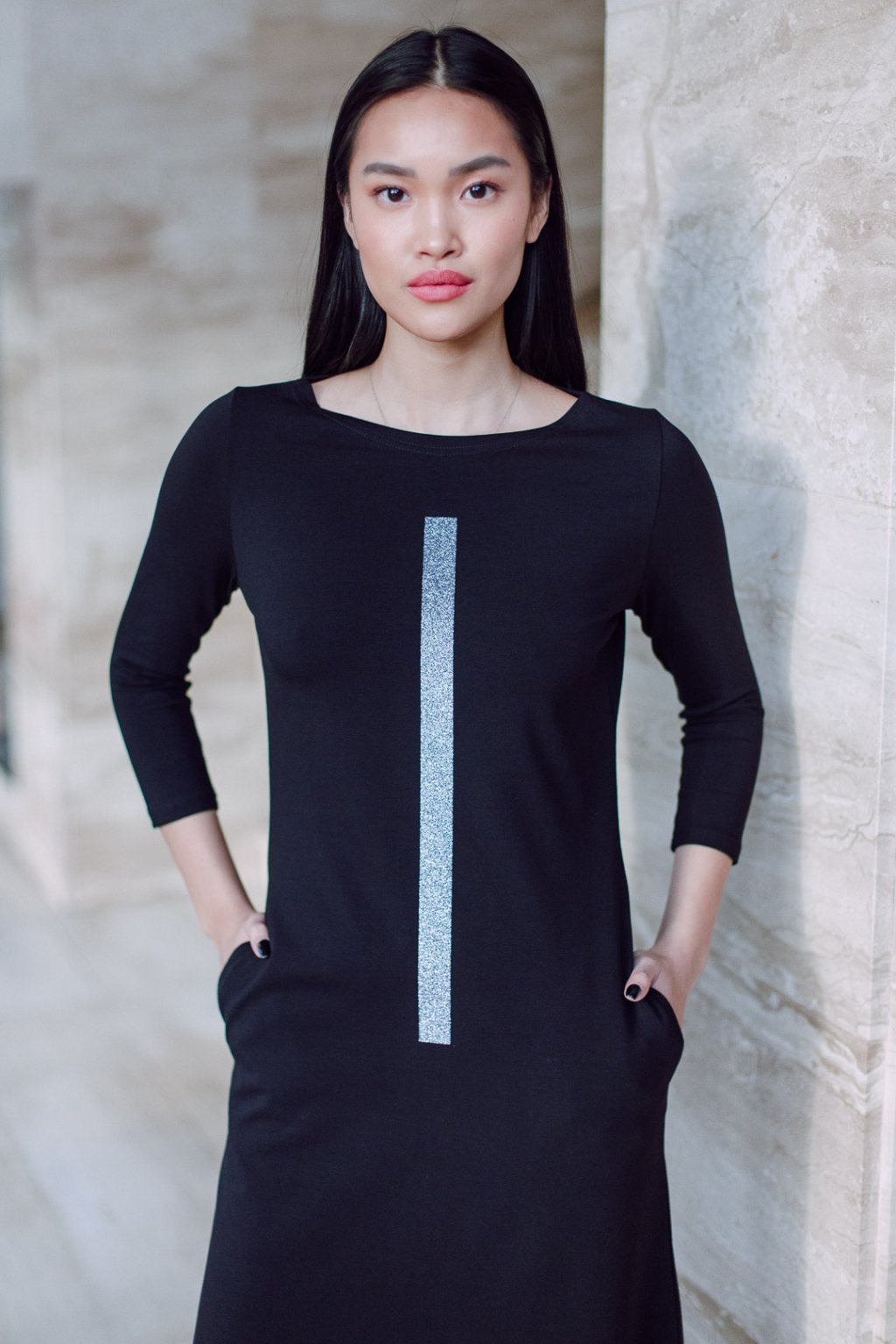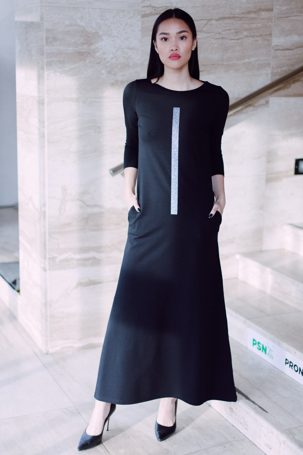 Černé úpletové šaty s lodičkovým výstřihem v oblíbené A siluetě, projmuté. Šaty v maxi délce, 3/4 všívaný rukáv, boční kapsy.