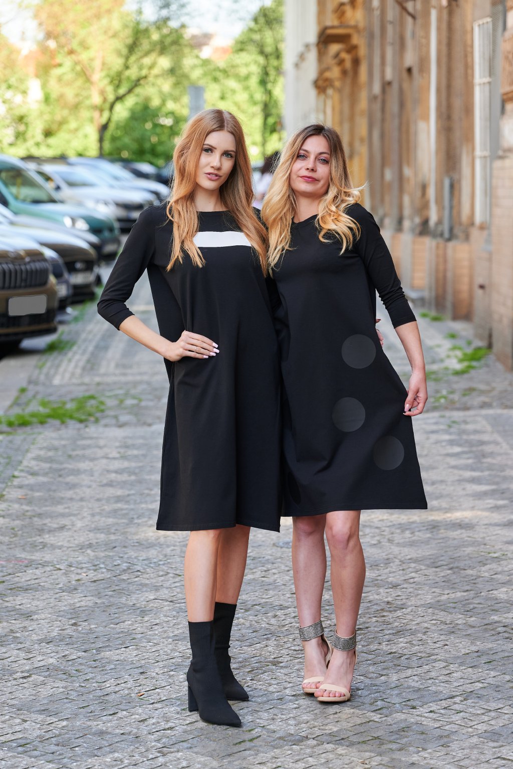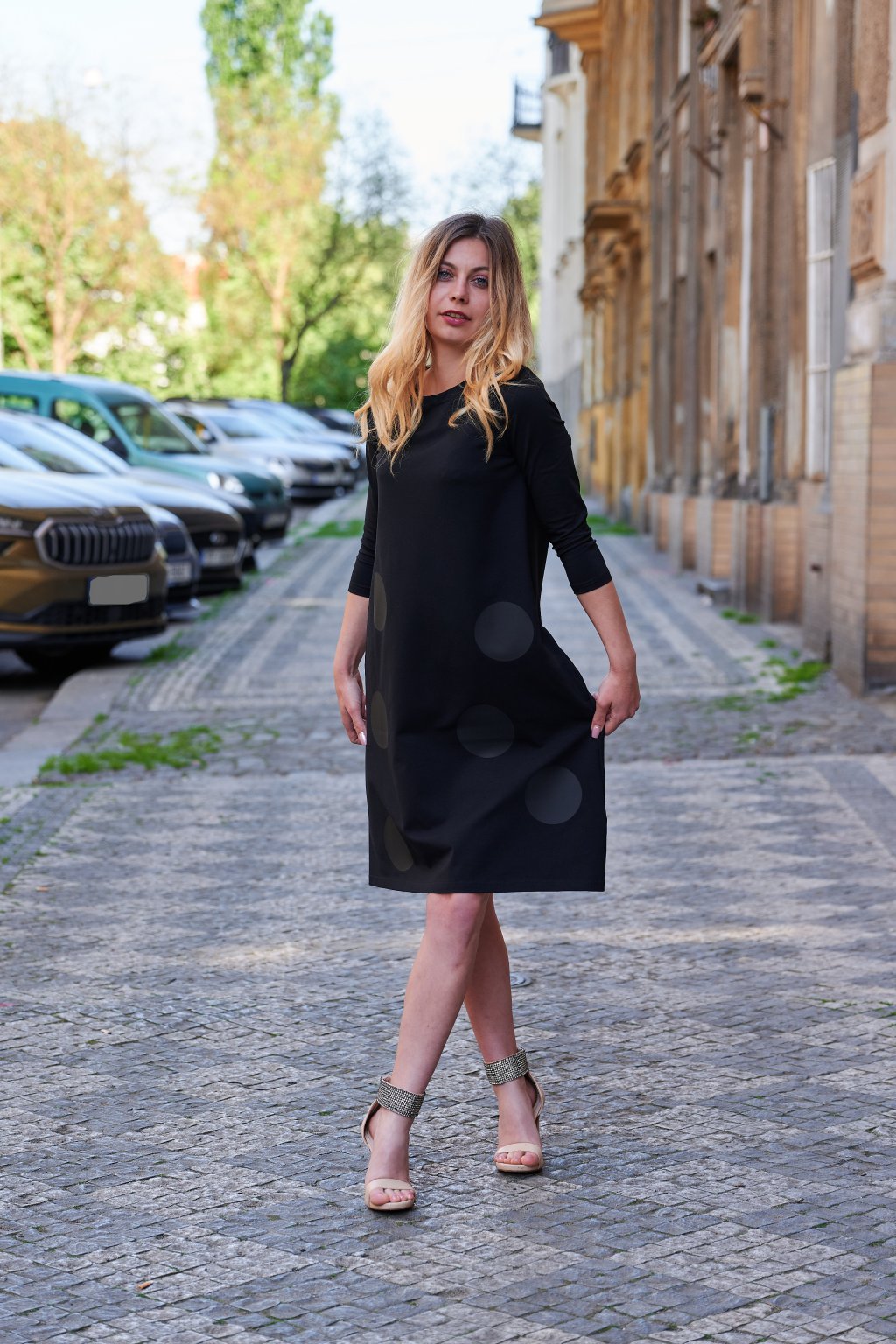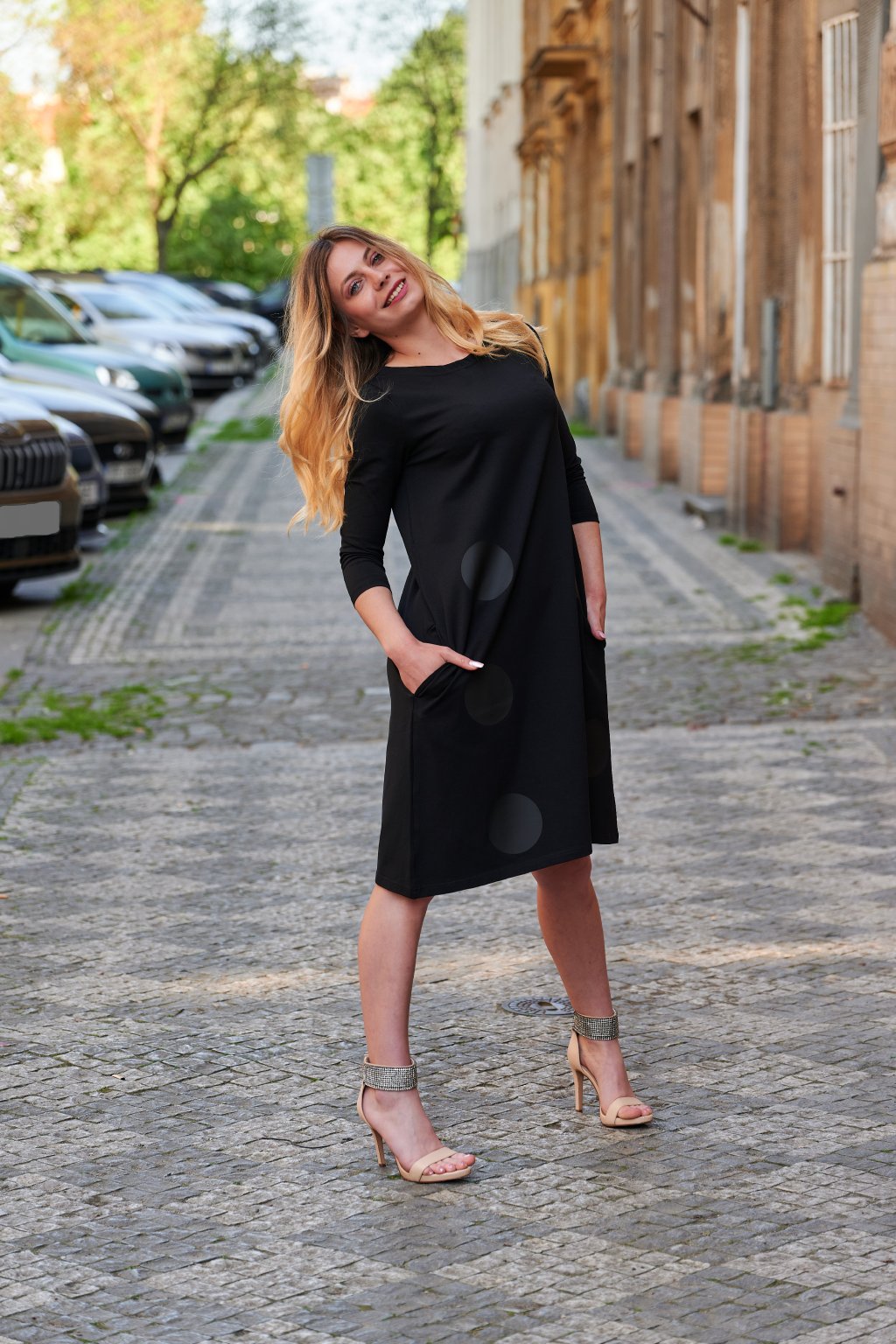 Černé úpletové šaty s kulatým výstřihem v A siluetě - mírně do áčka, s 3/43 rukávem. Spodek začištěn. V bocích kapsy.