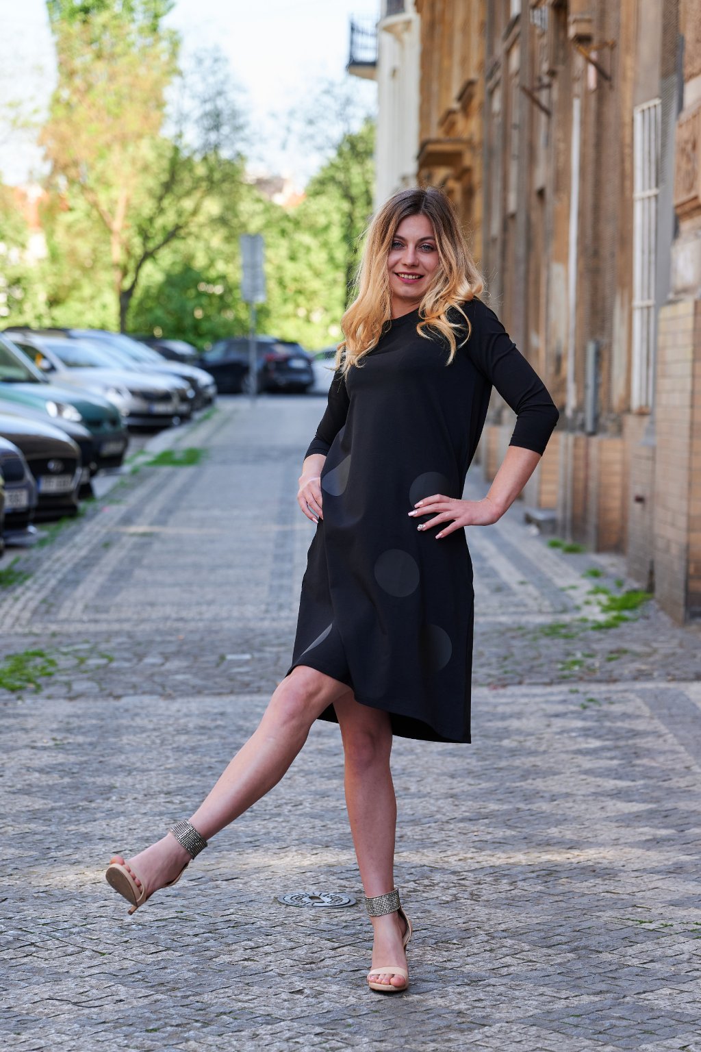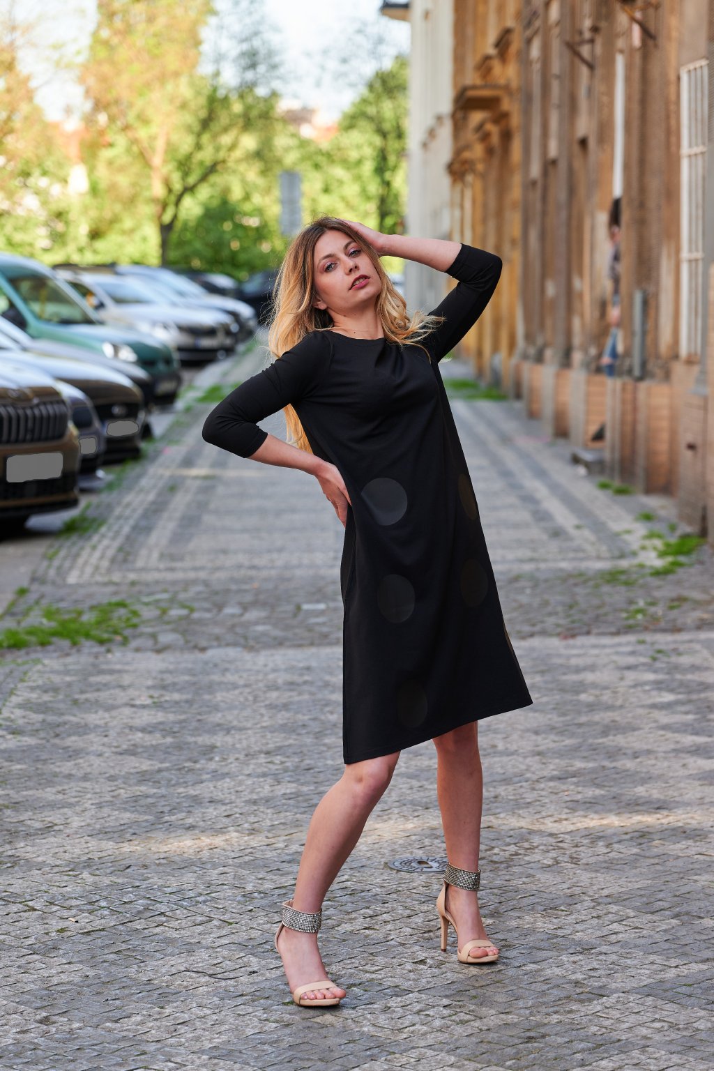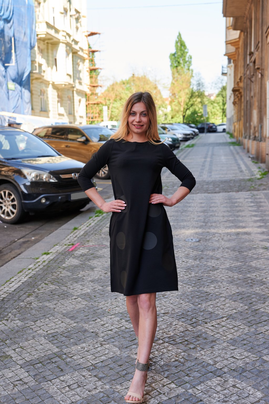 Černé úpletové šaty s kulatým výstřihem v A siluetě - mírně do áčka, s 3/43 rukávem. Spodek začištěn. V bocích kapsy.