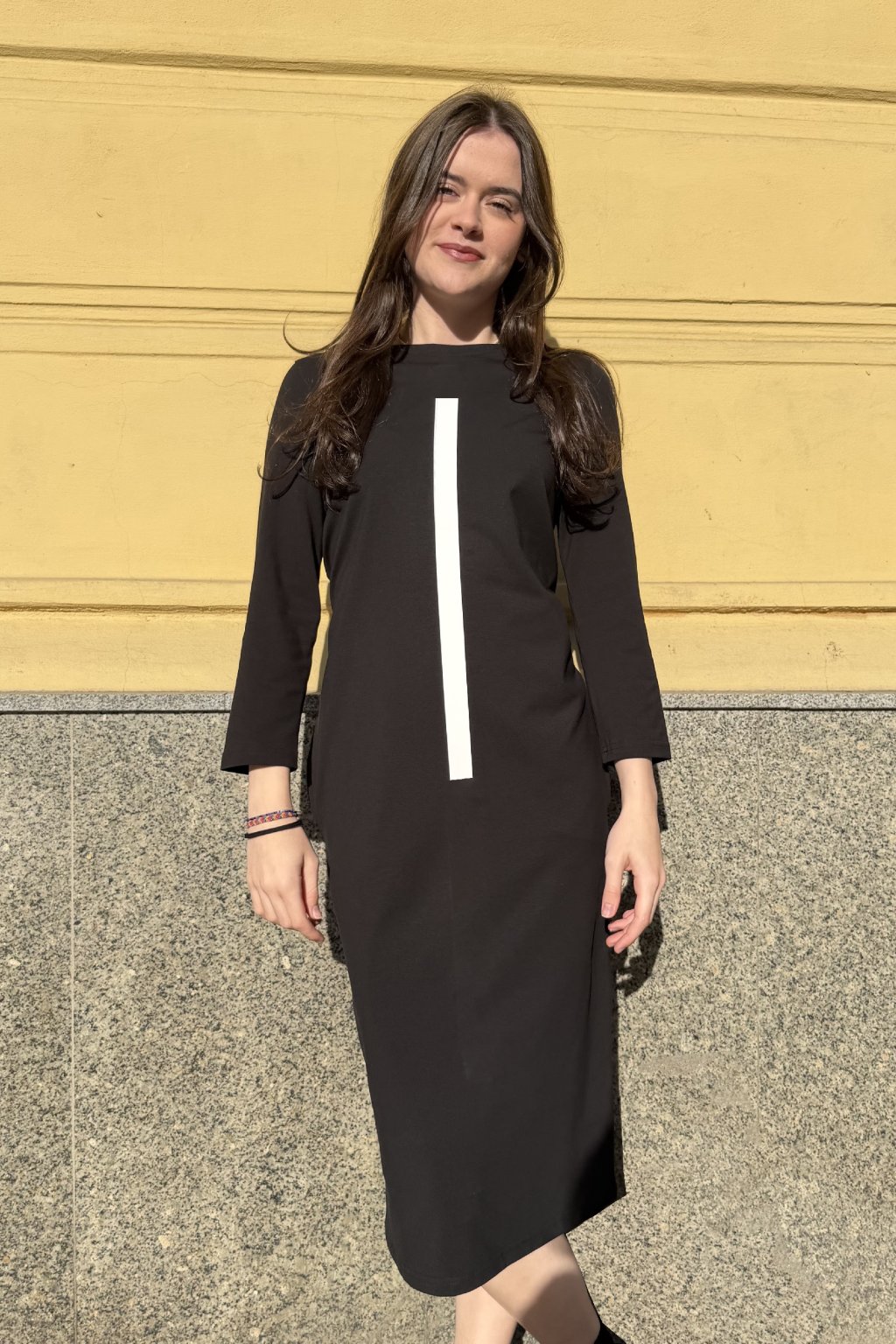 Šaty jsou rovného střihu, stejně široké v prsou a v bocích. Lodičkový výstřih. 3/4 všívaný rukáv. Boční kapsy.