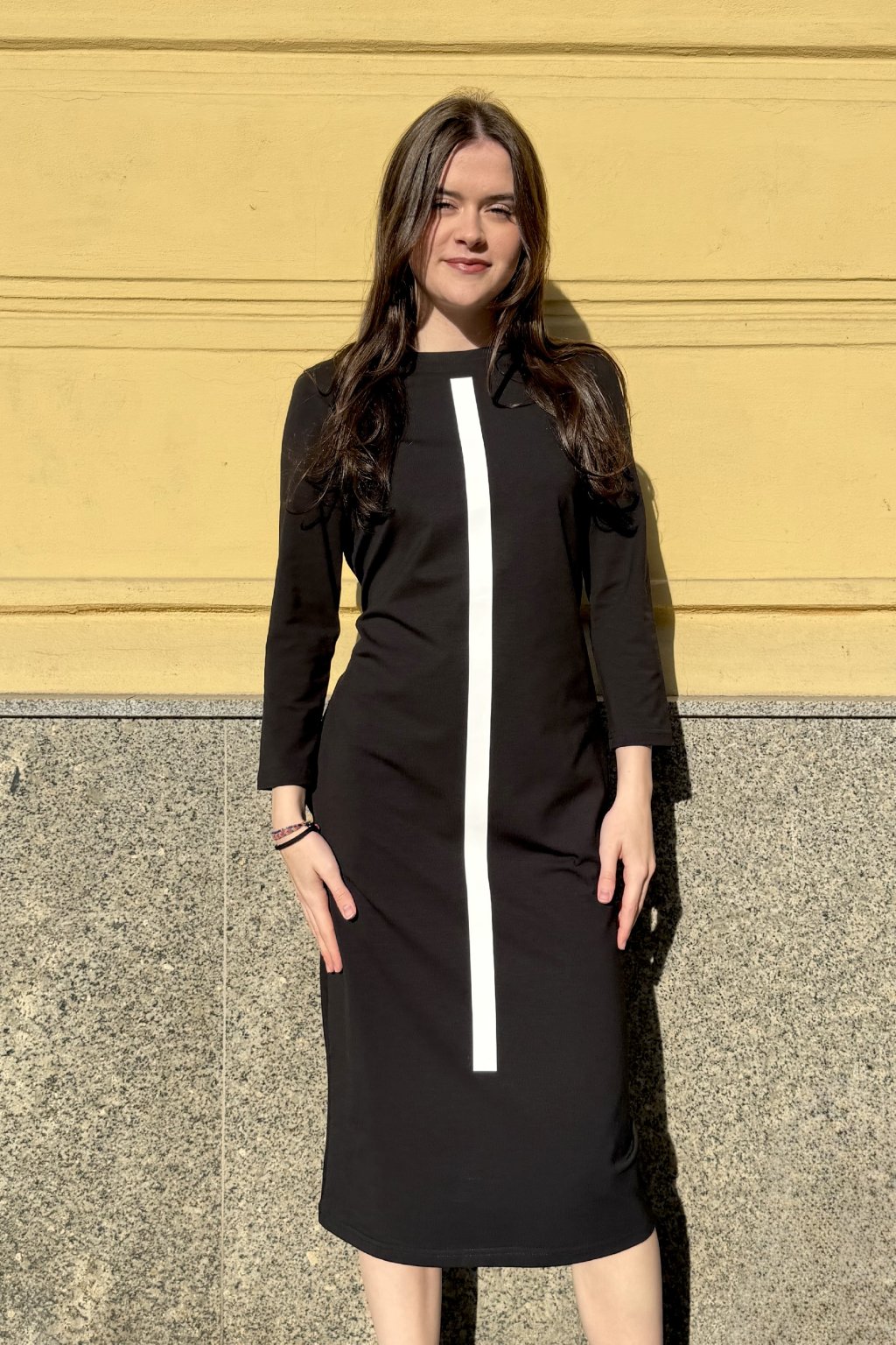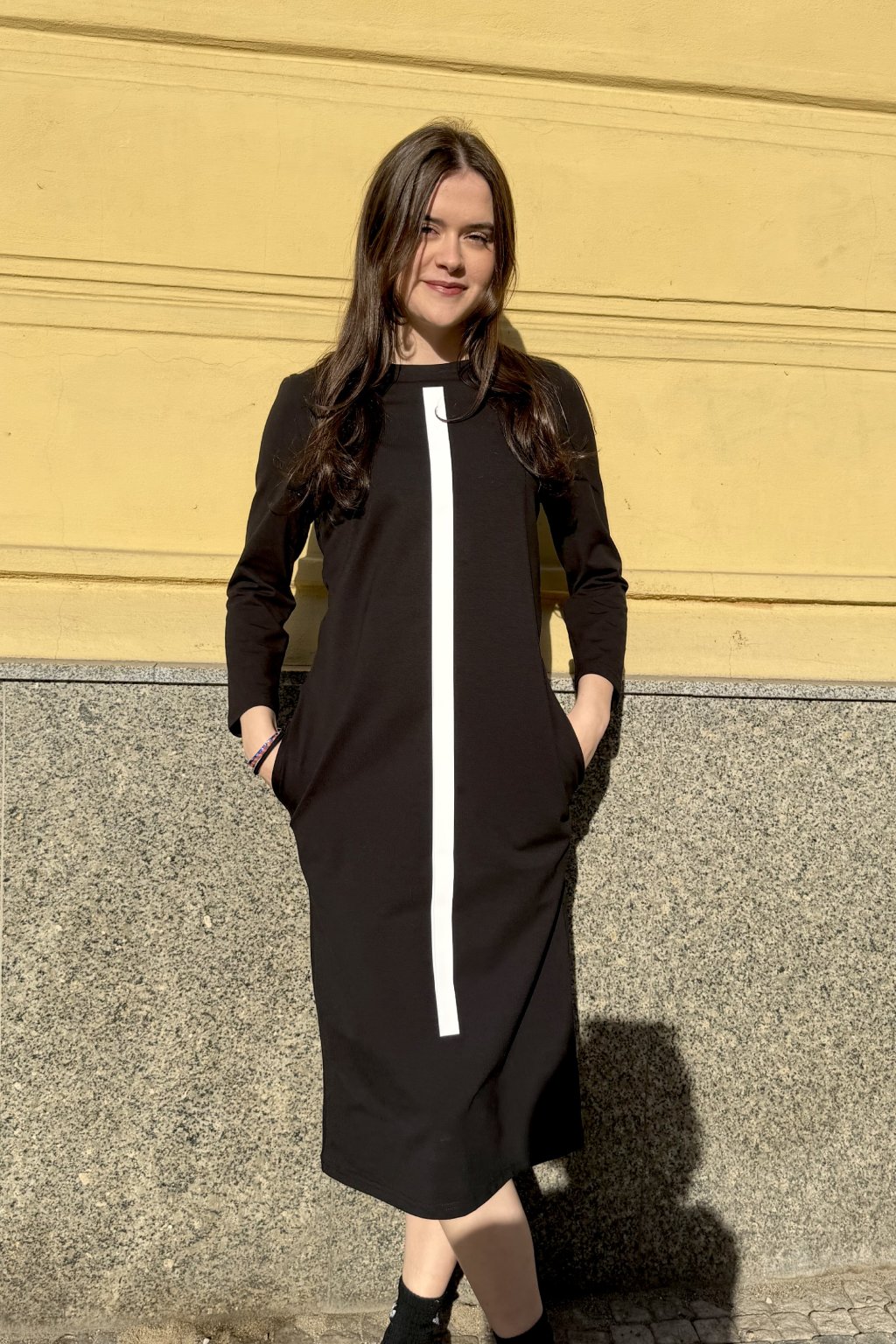 Šaty jsou rovného střihu, stejně široké v prsou a v bocích. Lodičkový výstřih. 3/4 všívaný rukáv. Boční kapsy.