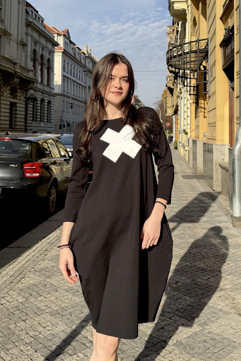 Šaty se směrem dolů rozšiřují, pak zaoblují a mírně zužují. Lodičkový výstřih. 3/4 všívaný rukáv. Boční kapsy.