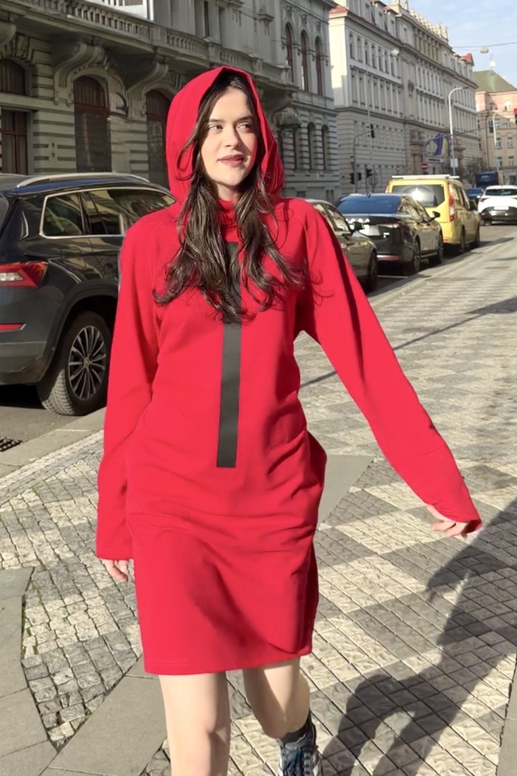 Šaty jsou rovného střihu. Dlouhý raglánový rukáv. Boční kapsy. Kapuce.