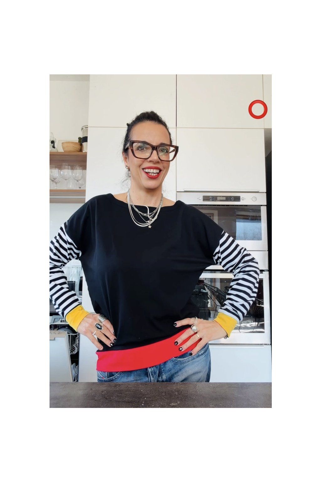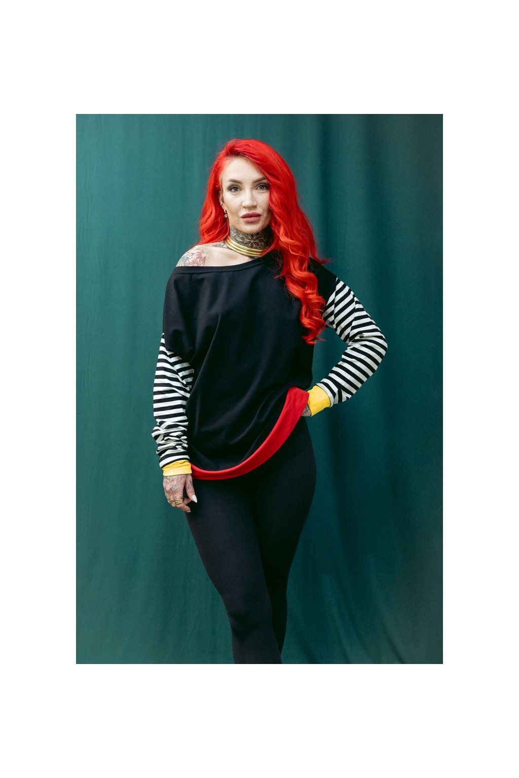Tričko je netopýřího střihu, v ramenou široké, v bocích zúžené, dlouhý pruhovaný rukáv i spodní okraj zakončený barevnými lemy. Na rukávech mango mohito lem, spodni lem je červený. Lodičkový výstřih.