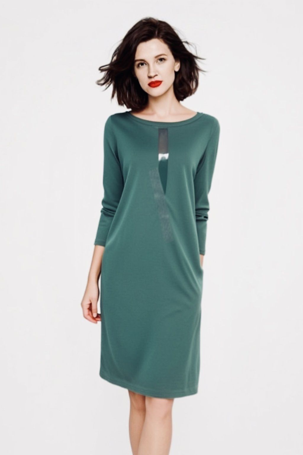Šaty jsou rovného střihu, stejně široké v prsou a v bocích. Lodičkový výstřih. 3/4 rukáv. Boční kapsy.