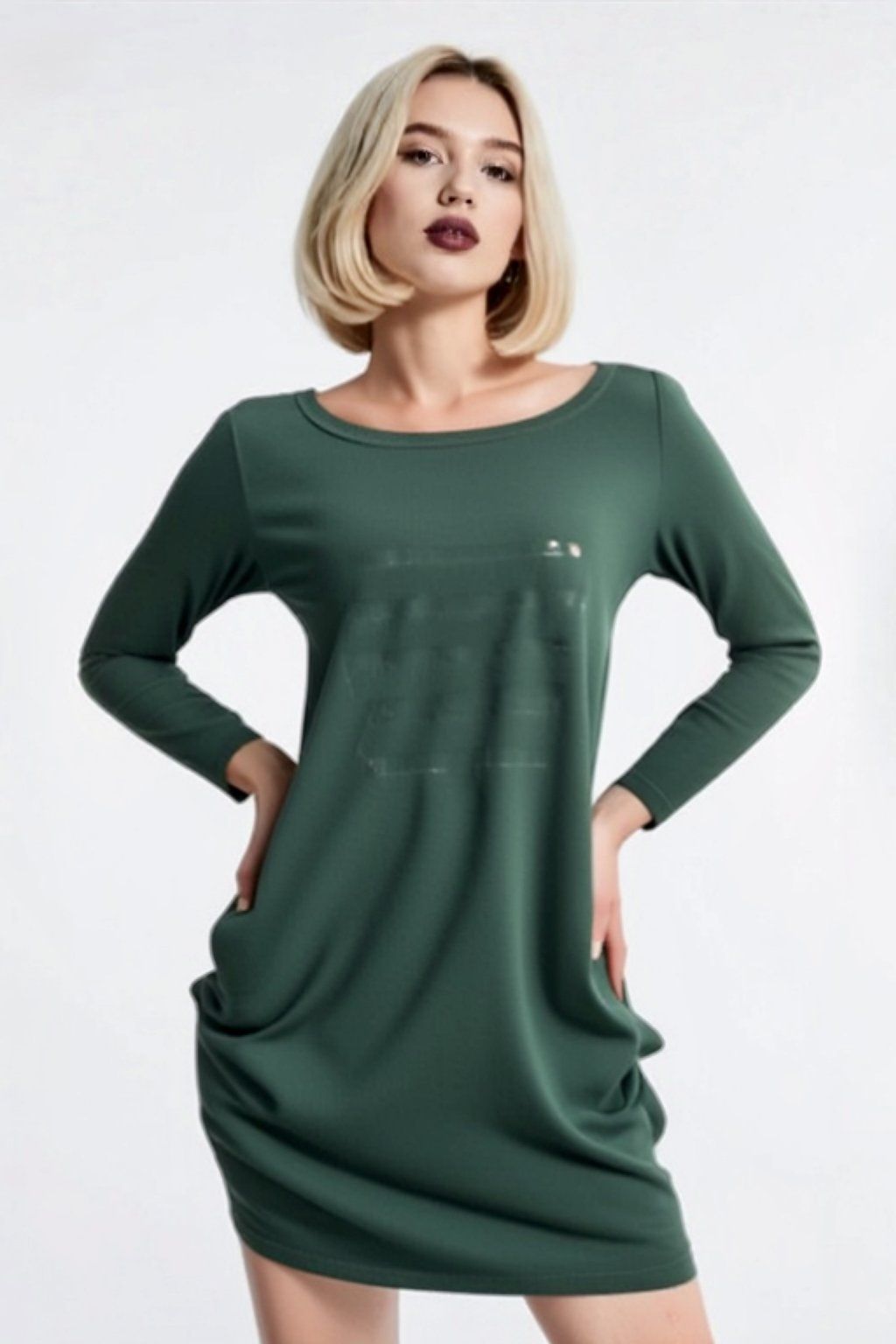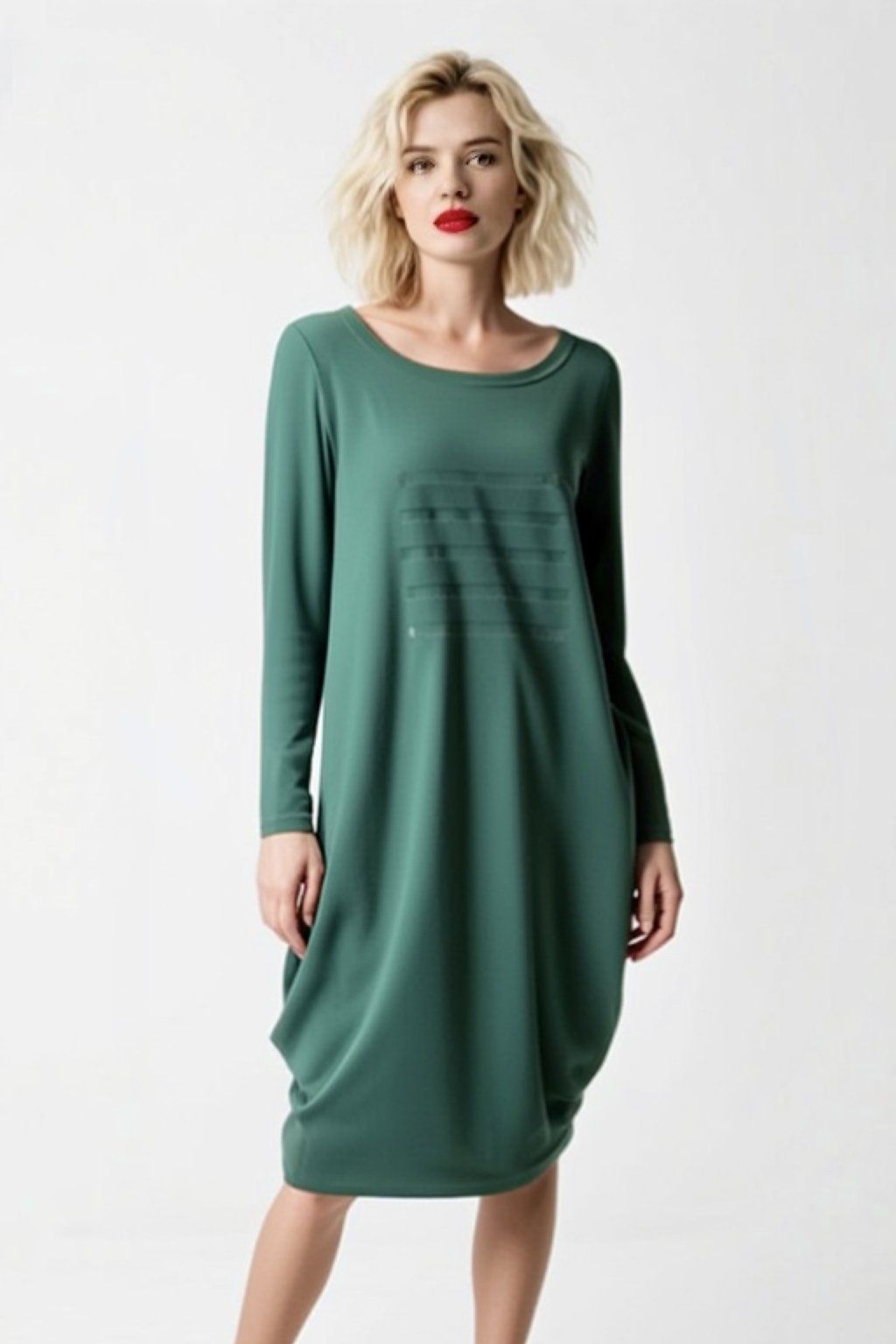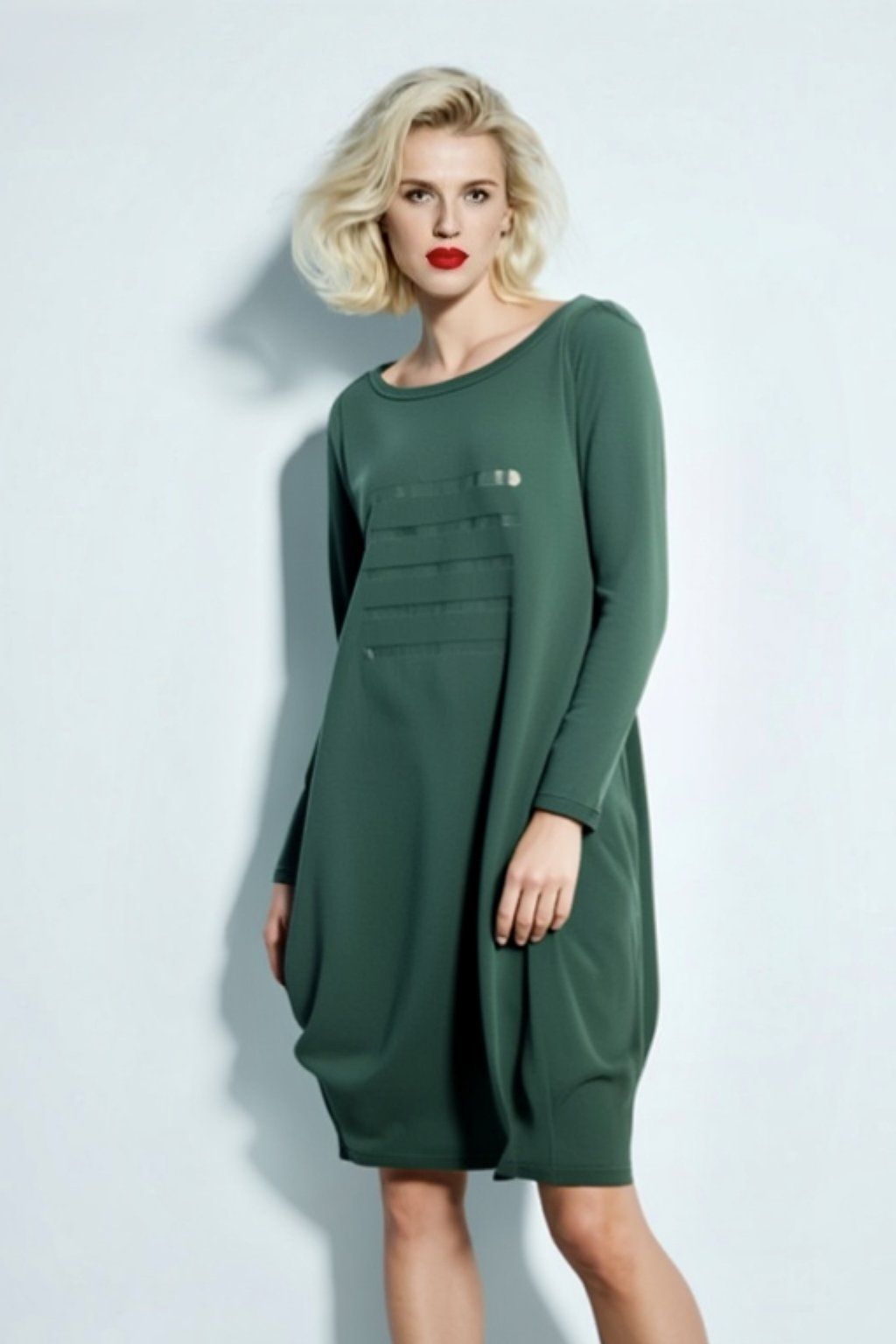 Šaty se směrem dolů rozšiřují, pak zaoblují a zužují. Boční kapsy. 3/4 všívaný rukáv. Lodičkový výstřih.