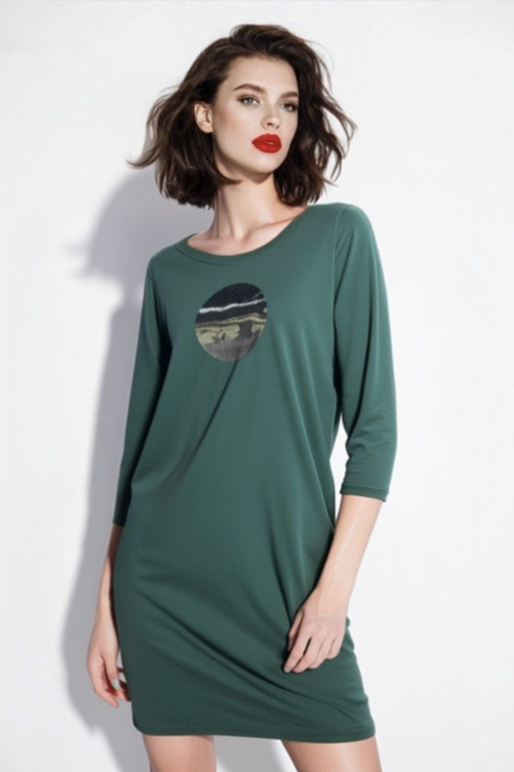 Šaty jsou rovného střihu, stejně široké v prsou a v bocích. Lodičkový výstřih. 3/4 rukáv. Boční kapsy.
