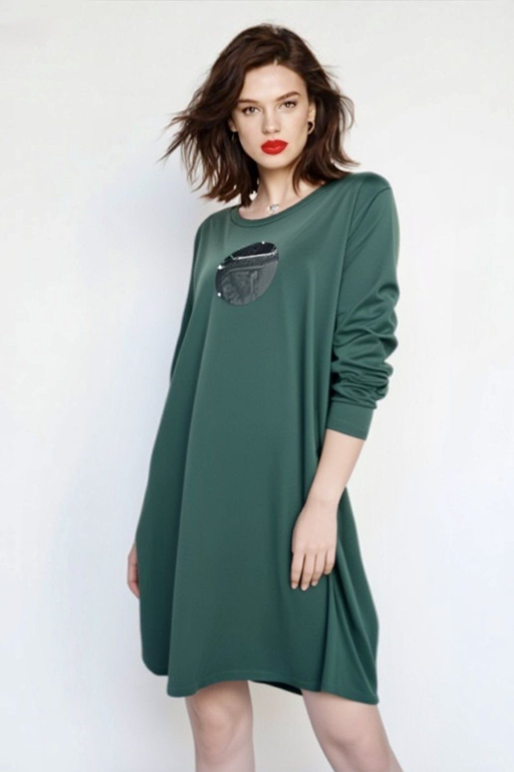 Šaty se směrem dolů rozšiřují, pak zaoblují a zužují. Boční kapsy. 3/4 všívaný rukáv. Lodičkový výstřih.